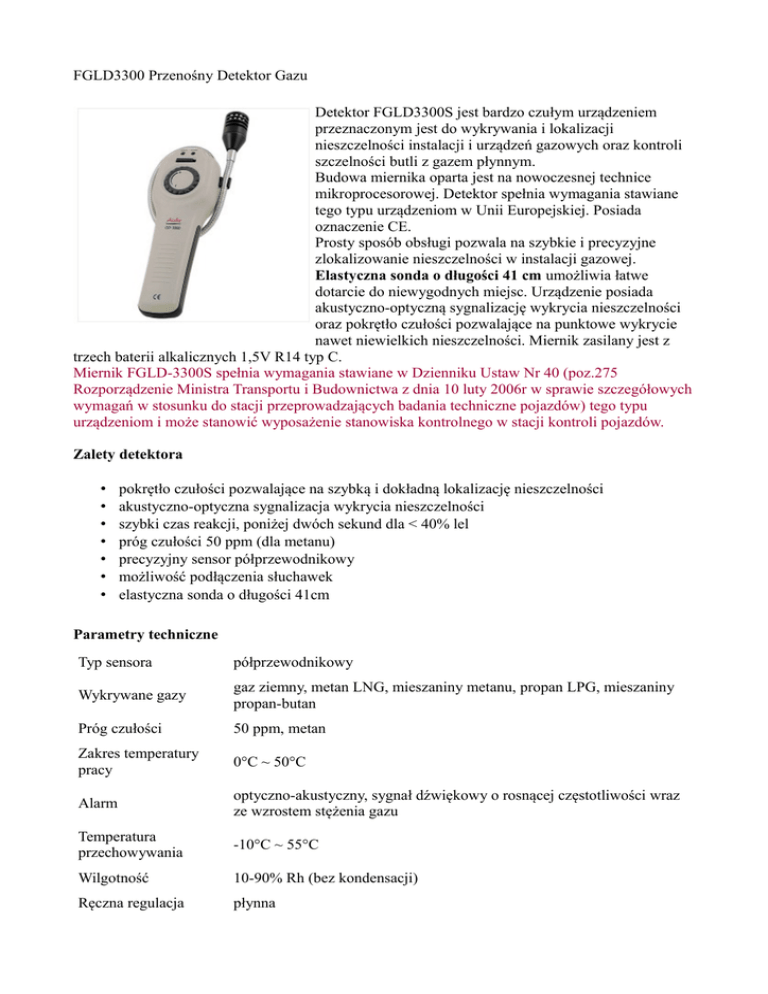 FGLD3300 Przenośny Detektor Gazu Detektor FGLD3300S jest bardzo czułym urządzeniem przeznaczonym jest do wykrywania i lokalizacji nieszczelności instalacji i urządzeń gazowych oraz kontroli szczelności butli z gazem płynnym. Budowa miernika oparta jest na nowoczesnej technice mikroprocesorowej. Detektor spełnia wymagania stawiane tego typu urządzeniom w Unii Europejskiej. Posiada oznaczenie CE. Prosty sposób obsługi pozwala na szybkie i precyzyjne zlokalizowanie nieszczelności w instalacji gazowej. Elastyczna sonda o długości 41 cm umożliwia łatwe dotarcie do niewygodnych miejsc. Urządzenie posiada akustyczno-optyczną sygnalizację wykrycia nieszczelności oraz pokrętło czułości pozwalające na punktowe wykrycie nawet niewielkich nieszczelności. Miernik zasilany jest z trzech baterii alkalicznych 1,5V R14 typ C. Miernik FGLD-3300S spełnia wymagania stawiane w Dzienniku Ustaw Nr 40 (poz.275 Rozporządzenie Ministra Transportu i Budownictwa z dnia 10 luty 2006r w sprawie szczegółowych wymagań w stosunku do stacji przeprowadzających badania techniczne pojazdów) tego typu urządzeniom i może stanowić wyposażenie stanowiska kontrolnego w stacji kontroli pojazdów. Zalety detektora • • • • • • • pokrętło czułości pozwalające na szybką i dokładną lokalizację nieszczelności akustyczno-optyczna sygnalizacja wykrycia nieszczelności szybki czas reakcji, poniżej dwóch sekund dla < 40% lel próg czułości 50 ppm (dla metanu) precyzyjny sensor półprzewodnikowy możliwość podłączenia słuchawek elastyczna sonda o długości 41cm Parametry techniczne Typ sensora półprzewodnikowy Wykrywane gazy gaz ziemny, metan LNG, mieszaniny metanu, propan LPG, mieszaniny propan-butan Próg czułości 50 ppm, metan Zakres temperatury pracy 0°C ~ 50°C Alarm optyczno-akustyczny, sygnał dźwiękowy o rosnącej częstotliwości wraz ze wzrostem stężenia gazu Temperatura przechowywania -10°C ~ 55°C Wilgotność 10-90% Rh (bez kondensacji) Ręczna regulacja płynna czułości Czas pracy baterii ok. 8 godziny ciągłej pracy w zależności od rodzaju zastosowanych baterii Czas przygotowania do < 1 min. pracy Sposób próbkowania ciągły Zasilanie 4,5 VDC (trzy baterie alkaliczne 1.5V R14 typ C) Wymiary 220 x 72 x 46 mm Długość sondy elastycznej 410 mm Waga 750 gramów Wyposażenie instrukcja obsługi, pokrowiec z materiału Oznaczenia CE