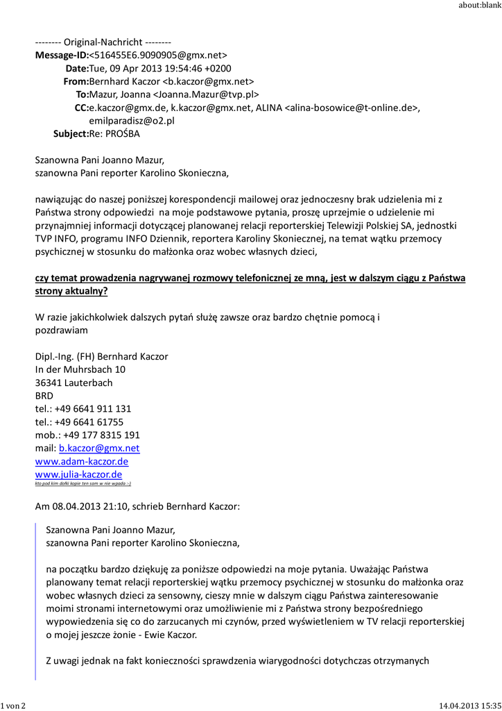 1von2 about:blank -------- Original-Nachricht -------Message-ID:<[email protected]> Date:Tue, 09 Apr 2013 19:54:46 +0200 From:Bernhard Kaczor <[email protected]> To:Mazur, Joanna <[email protected]> CC:[email protected], [email protected], ALINA <[email protected]>, [email protected] Subject:Re: PROŚBA Szanowna Pani Joanno Mazur, szanowna Pani reporter Karolino Skonieczna, nawiązując do naszej poniższej korespondencji mailowej oraz jednoczesny brak udzielenia mi z Państwa strony odpowiedzi na moje podstawowe pytania, proszę uprzejmie o udzielenie mi przynajmniej informacji dotyczącej planowanej relacji reporterskiej Telewizji Polskiej SA, jednostki TVP INFO, programu INFO Dziennik, reportera Karoliny Skoniecznej, na temat wątku przemocy psychicznej w stosunku do małżonka oraz wobec własnych dzieci, czy temat prowadzenia nagrywanej rozmowy telefonicznej ze mną, jest w dalszym ciągu z Państwa strony aktualny? W razie jakichkolwiek dalszych pytań służę zawsze oraz bardzo chętnie pomocą i pozdrawiam Dipl.-Ing. (FH) Bernhard Kaczor In der Muhrsbach 10 36341 Lauterbach BRD tel.: +49 6641 911 131 tel.: +49 6641 61755 mob.: +49 177 8315 191 mail: [email protected] www.adam-kaczor.de www.julia-kaczor.de kto pod kim dołki kopie ten sam w nie wpada :-) Am 08.04.2013 21:10, schrieb Bernhard Kaczor: Szanowna Pani Joanno Mazur, szanowna Pani reporter Karolino Skonieczna, na początku bardzo dziękuję za poniższe odpowiedzi na moje pytania. Uważając Państwa planowany temat relacji reporterskiej wątku przemocy psychicznej w stosunku do małżonka oraz wobec własnych dzieci za sensowny, cieszy mnie w dalszym ciągu Państwa zainteresowanie moimi stronami internetowymi oraz umożliwienie mi z Państwa strony bezpośredniego wypowiedzenia się co do zarzucanych mi czynów, przed wyświetleniem w TV relacji reporterskiej o mojej jeszcze żonie - Ewie Kaczor. Z uwagi jednak na fakt konieczności sprawdzenia wiarygodności dotychczas otrzymanych 14.04.201315:35 2von2 about:blank informacji od Państwa, proszę jeszcze tylko o przesłanie mi mailem: pełnego adresu Państwa firmy wraz z numerem telefonu i faksu do Państwa jednostki oraz numeru KRS Po uzyskaniu w. w. informacji i sprawdzeniu ich wiarygodności, będę w stanie niezwłocznie udzielić Państwu pozwolenia na prowadzenie rozmowy telefonicznej ze mną i nagrywanie jej. W razie jakichkolwiek dalszych pytań służę zawsze oraz bardzo chętnie pomocą i pozdrawiam Dipl.-Ing. (FH) Bernhard Kaczor In der Muhrsbach 10 36341 Lauterbach BRD tel.: +49 6641 911 131 tel.: +49 6641 61755 mob.: +49 177 8315 191 mail: [email protected] www.adam-kaczor.de www.julia-kaczor.de Am 08.04.2013 16:17, schrieb Mazur, Joanna: Witam, Oto garść informacji, o które Pan prosił: 1) Pełna nazwa Państwa firmy wraz z adresem i numerem KRS, imię i nazwisko oraz zajmowane stanowisko osoby, która planuje prowadzić ze mną rozmowę telefoniczną. Telewizja Polska SA, jednostka TVP INFO, program INFO Dziennik, emisja od poniedziałku do piątku o 22.30, nazwisko reportera Karolina Skonieczna 2) W jakim celu mają Państwo zamiar wykorzystać materiały z planowanej rozmowy telefonicznej ze mną? Przygotowywana jest relacja reporterska o Pani Ewie Kaczor, w którym ujęty będzie wątek przemocy psychicznej, jaką Pan wobec żony stosuje: wiedza zgromadzona na podstawie przedłożonych dokumentów: sprawa sądowa, na którą Pan się ani razu nie stawił oraz działalności strony internetowej poświęconej Pani Ewie.Chciałabym uzyskać relację z Pana strony, by zachować obiektywizm materiału. 3) Proszę o przesłanie mi wstępnie drogą mailową listy planowanych pytań. 1. Czy i kiedy podjął Pan leczenie? Czy Pan obecnie uczęszcza Pan na terapię? (wiedza na podstawie dokumentu sądowego, badania Rodeka, rodzinny ośrodek diagnostyczno- konsultacyjny z dnia 11.08.2011 rok, w którym stwierdzono u Pana zaburzenia) 2. Dlaczego prowadzi Pan stronę internetową szkalującą małżonkę? 3. Dlaczego nie wypłaca Pan alimentów na dzieci? 4. Czy kiedykolwiek próbował Pan zastraszyć małżonkę? Dlaczego nie pojawił się Pan na rozprawie o stosowaniu gróźb? 5. Czy ma Pan dobry kontakt z dziećmi? Pozdrawiam Joanna Mazur 14.04.201315:35