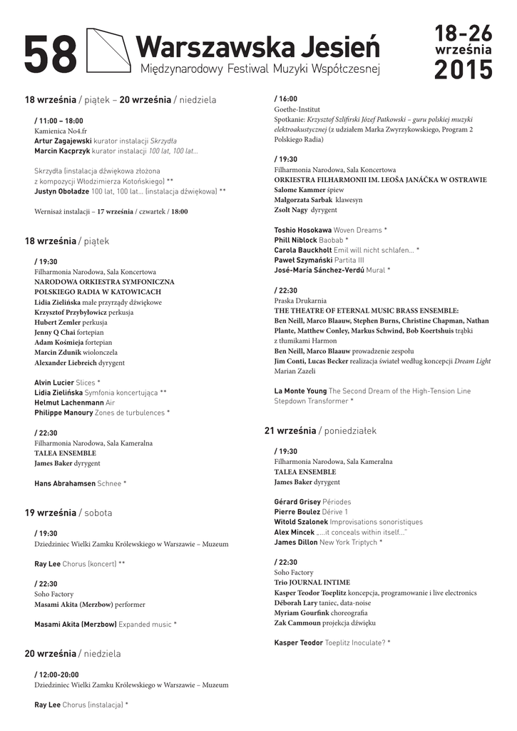 18 września / piątek – 20 września / niedziela / 11:00 – 18:00 Kamienica No4.fr Artur Zagajewski kurator instalacji Skrzydła Marcin Kacprzyk kurator instalacji 100 lat, 100 lat… Skrzydła (instalacja dźwiękowa złożona z kompozycji Włodzimierza Kotońskiego) ** Justyn Oboładze 100 lat, 100 lat… (instalacja dźwiękowa) ** Wernisaż instalacji – 17 września / czwartek / 18:00 18 września / piątek / 19:30 Filharmonia Narodowa, Sala Koncertowa NARODOWA ORKIESTRA SYMFONICZNA POLSKIEGO RADIA W KATOWICACH Lidia Zielińska małe przyrządy dźwiękowe Krzysztof Przybyłowicz perkusja Hubert Zemler perkusja Jenny Q Chai fortepian Adam Kośmieja fortepian Marcin Zdunik wiolonczela Alexander Liebreich dyrygent Alvin Lucier Slices * Lidia Zielińska Symfonia koncertująca ** Helmut Lachenmann Air Philippe Manoury Zones de turbulences * / 22:30 Filharmonia Narodowa, Sala Kameralna TALEA ENSEMBLE James Baker dyrygent Hans Abrahamsen Schnee * 19 września / sobota / 19:30 Dziedziniec Wielki Zamku Królewskiego w Warszawie – Muzeum Ray Lee Chorus (koncert) ** / 22:30 Soho Factory Masami Akita (Merzbow) performer Masami Akita (Merzbow) Expanded music * 20 września / niedziela / 12:00-20:00 Dziedziniec Wielki Zamku Królewskiego w Warszawie – Muzeum Ray Lee Chorus (instalacja) * / 16:00 Goethe-Institut Spotkanie: Krzysztof Szlifirski Józef Patkowski – guru polskiej muzyki elektroakustycznej (z udziałem Marka Zwyrzykowskiego, Program 2 Polskiego Radia) / 19:30 Filharmonia Narodowa, Sala Koncertowa ORKIESTRA FILHARMONII IM. LEOŠA JANÁČKA W OSTRAWIE Salome Kammer śpiew Małgorzata Sarbak klawesyn Zsolt Nagy dyrygent Toshio Hosokawa Woven Dreams * Phill Niblock Baobab * Carola Bauckholt Emil will nicht schlafen… * Paweł Szymański Partita III José-María Sánchez-Verdú Mural * / 22:30 Praska Drukarnia THE THEATRE OF ETERNAL MUSIC BRASS ENSEMBLE: Ben Neill, Marco Blaauw, Stephen Burns, Christine Chapman, Nathan Plante, Matthew Conley, Markus Schwind, Bob Koertshuis trąbki z tłumikami Harmon Ben Neill, Marco Blaauw prowadzenie zespołu Jim Conti, Lucas Becker realizacja świateł według koncepcji Dream Light Marian Zazeli La Monte Young The Second Dream of the High-Tension Line Stepdown Transformer * 21 września / poniedziałek / 19:30 Filharmonia Narodowa, Sala Kameralna TALEA ENSEMBLE James Baker dyrygent Gérard Grisey Périodes Pierre Boulez Dérive 1 Witold Szalonek Improvisations sonoristiques Alex Mincek „...it conceals within itself...” James Dillon New York Triptych * / 22:30 Soho Factory Trio JOURNAL INTIME Kasper Teodor Toeplitz koncepcja, programowanie i live electronics Déborah Lary taniec, data-noise Myriam Gourfink choreografia Zak Cammoun projekcja dźwięku Kasper Teodor Toeplitz Inoculate? * 22 września / wtorek / 12:00 Austriackie Forum Kultury Spotkanie z kompozytorem: James Dillon / 19:30 Uniwersytet Muzyczny Fryderyka Chopina ORKIESTRA MUZYKI NOWEJ Małgorzata Walentynowicz fortepian Tomasz Żymła klarnet Robert Stefański klarnet Szymon Bywalec dyrygent Ken Ueno …blood blossoms … * Brian Ferneyhough La Chute d’Icare Krzysztof Wołek Motions, Stases * Marta Śniady aer Stefan Prins Fremdkörper #3 (mit Michael Jackson) * 23 września / środa / 12:00 Austriackie Forum Kultury Spotkanie z kompozytorem: Stefan Prins / 19:30 Studio Koncertowe Polskiego Radia im. Witolda Lutosławskiego LUTOSŁAWSKI QUARTET LUTOSAIR QUINTET Rafał Łuc akordeon Michał Pawełek elektronika Maciej Koczur dyrygent Paweł Hendrich Pteropetros ** Luigi Nono „Hay que caminar” sognando Michał Pawełek Ephreia ** Raphaël Cendo In Vivo * 24 września / czwartek / 19:30 Studio Koncertowe Polskiego Radia im. Witolda Lutosławskiego EUROPEAN WORKSHOP FOR CONTEMPORARY MUSIC Stephen Menotti puzon Maria Sławek skrzypce Aleksandra Lelek wiolonczela Rüdiger Bohn dyrygent Johannes Schöllhorn Niemandsland * Szymon Stanisław Strzelec L’Atelier de sensorité ** (zamówienie Warszawskiej Jesieni) Ragnhild Berstad Cardinem * Vito Žuraj Re-slide * (nowa wersja – zamówienie Niemieckiej Rady Muzycznej) Giacinto Scelsi Anahit 25 września / piątek / 12:00 Austriackie Forum Kultury Spotkanie z kompozytorem: Ragnhild Berstad / – / 2015 / + Rozszerzenie / Rzeczywistość Jagoda Szmytka LOST *** (transmedialna kompozycja), (zamówienie Warszawskiej Jesieni) / 19:30 ATM STUDIO DECODER ENSEMBLE Frauke Aulbert głos, gra aktorska Alexander Hofmann dźwięk i reżyseria dźwięku Sebastian Berweck głos, sampler, gra aktorska Paul Hübner trąbka, gra aktorska Steffen Ahrens gitara elektryczna Yannick Hofmann moderacja Katharina Bach głos, gra aktorska Sebastian Schottke reżyseria dźwięku Jagoda Szmytka koncept, kompozycja, tekst, wideo, scenariusz, reżyseria Halina Przebinda reżyseria wizji, inscenizacja Laura Linnenbaum inscenizacja, asystent reżysera Anna Mioduszewska scenografia David Gonter kostiumy Damjan Jovanovic animacje wideo przy użyciu gry Second Life Paweł Pniewski oświetlenie Jagoda Szmytka LOST PLAY ** (performance w ramach transmedialnej kompozycji LOST) / 22:30 Soho Factory Rei Nakamura fortepian Karin Hellqvist skrzypce Dagna Sadkowska skrzypce Tanja Orning wiolonczela Simon Steen-Andersen whammy pedal Dan Nicholls MIDI table Hugh Jones projekcja dźwięku Matthew Herbert 20 pianos * Simon Steen-Andersen Study for String Instrument #1 Simon Steen-Andersen Study for String Instrument #2 * Simon Steen-Andersen Study for String Instrument #3 * Michael Beil Mach Sieben * 26 września / sobota / 00:30 – 5:00 Goethe-Institut Johannes Kreidler performer Johannes Kreidler Beginninglessness (multimedialne performanse i filmy wideo) / 12:00 Austriackie Forum Kultury Spotkanie z kompozytorem: Jagoda Szmytka / 19:30 Filharmonia Narodowa, Sala Koncertowa ORKIESTRA FILHARMONII NARODOWEJ Håkan Hardenberger trąbka Dmytro Tavanets fortepian Grzegorz Gorczyca sampler Simon Steen-Andersen live mixing Jacek Kaspszyk dyrygent Justė Janulytė Textile * Jerz