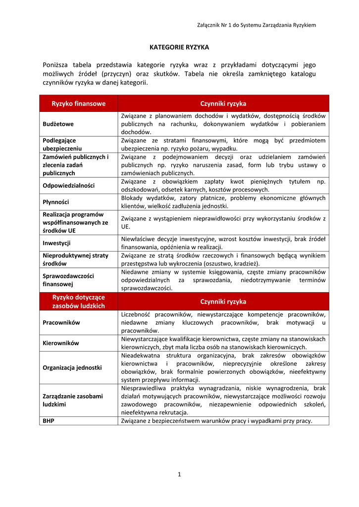 Załącznik Nr 1 do Systemu Zarządzania Ryzykiem KATEGORIE RYZYKA Poniższa tabela przedstawia kategorie ryzyka wraz z przykładami dotyczącymi jego możliwych źródeł (przyczyn) oraz skutków. Tabela nie określa zamkniętego katalogu czynników ryzyka w danej kategorii. Ryzyko finansowe Budżetowe Podlegające ubezpieczeniu Zamówieo publicznych i zlecenia zadao publicznych Odpowiedzialności Płynności Realizacja programów współfinansowanych ze środków UE Inwestycji Nieproduktywnej straty środków Sprawozdawczości finansowej Czynniki ryzyka Związane z planowaniem dochodów i wydatków, dostępnością środków publicznych na rachunku, dokonywaniem wydatków i pobieraniem dochodów. Związane ze stratami finansowymi, które mogą byd przedmiotem ubezpieczenia np. ryzyko pożaru, wypadku. Związane z podejmowaniem decyzji oraz udzielaniem zamówieo publicznych np. ryzyko naruszenia zasad, form lub trybu ustawy o zamówieniach publicznych. Związane z obowiązkiem zapłaty kwot pieniężnych tytułem np. odszkodowao, odsetek karnych, kosztów procesowych. Blokady wydatków, zatory płatnicze, problemy ekonomiczne głównych klientów, wielkośd zadłużenia jednostki. Związane z wystąpieniem nieprawidłowości przy wykorzystaniu środków z UE. Niewłaściwe decyzje inwestycyjne, wzrost kosztów inwestycji, brak źródeł finansowania, opóźnienia w realizacji. Związane ze stratą środków rzeczowych i finansowych będącą wynikiem przestępstwa lub wykroczenia (oszustwo, kradzież). Niedawne zmiany w systemie księgowania, częste zmiany pracowników odpowiedzialnych za sprawozdania, niedotrzymywanie terminów sprawozdawczości. Ryzyko dotyczące zasobów ludzkich Pracowników Kierowników Organizacja jednostki Zarządzanie zasobami ludzkimi BHP Czynniki ryzyka Liczebnośd pracowników, niewystarczające kompetencje pracowników, niedawne zmiany kluczowych pracowników, brak motywacji u pracowników. Niewystarczające kwalifikacje kierownictwa, częste zmiany na stanowiskach kierowniczych, zbyt mała liczba osób na stanowiskach kierowniczych. Nieadekwatna struktura organizacyjna, brak zakresów obowiązków kierownictwa i pracowników, nieprecyzyjnie określone zakresy obowiązków, brak formalnie powierzonych obowiązków, nieefektywny system przepływu informacji. Niesprawiedliwa praktyka wynagradzania, niskie wynagrodzenia, brak działao motywujących pracowników, niewystarczające możliwości rozwoju zawodowego pracowników, niezapewnienie odpowiednich szkoleo, nieefektywna rekrutacja. Związane z bezpieczeostwem warunków pracy i wypadkami przy pracy. 1 Załącznik Nr 1 do Systemu Zarządzania Ryzykiem Ryzyko działalności Organizacyjne Kontroli wewnętrznej Informacji Wizerunku Systemów informatycznych Prowadzonymi projektami Nowymi zadaniami i programami Innowacyjnością Czynniki ryzyka Brak lub niewłaściwe regulacje wewnętrzne (w tym procesy, procedury). Związane z funkcjonowaniem kontroli wewnętrznej np. ryzyko niedostatecznej kontroli, ryzyko nieskutecznych mechanizmów kontrolnych. Nieadekwatnośd informacji, na podstawie których podejmuje się decyzje, brak komunikacji w pionie i poziomie struktury organizacyjnej, utrata informacji, naruszenie poufności informacji. Związane z wizerunkiem Urzędu np. ryzyko negatywnych opinii i artykułów w prasie, spadek reputacji na skutek niewłaściwego działania lub zaniedbao pracowników, nieprawidłowego lub nieterminowego wydawania decyzji, niewłaściwej realizacji zadao przez jednostkę, złego zarządzania. Związane z używanymi w Urzędzie oraz jednostce organizacyjnej systemami i programami informatycznymi oraz ochroną danych w sieci np. ryzyko awarii systemu, wdrażanie nowych technologii, ryzyko dostępu do danych przez nieuprawnione osoby, ryzyko niekontrolowanej modyfikacji danych. Niewłaściwe planowanie projektu, wzrost kosztów realizacji projektu, opóźnienia w realizacji projektu, brak środków na realizację projektu, niepowodzenie projektu. Ograniczenie lub znaczny wzrost zadao jednostki, brak odpowiednich zasobów (środków finansowych, pracowników, wyposażenia, informacji), krótki termin realizacji, koniecznośd współpracy z innymi podmiotami. Opór pracowników, brak skłonności do zmian, wdrażanie niesprawdzonych rozwiązao. Ryzyko zewnętrzne Infrastruktury Środowiska prawnego Zewnętrzne warunki ekonomiczne Środowisko naturalne ,,Siła wyższa” Dostawcy i usługodawcy Inne zagrożenia i naciski zewnętrzne Czynniki ryzyka Związane ze środkami transportu i łączności, zakłócenia w dostawach energii, przerwy w łączności telefonicznej, przerwy w dostępie do Internetu i poczty elektronicznej. Brak regulacji prawnych w danym zakresie, skomplikowane lub niejasne przepisy, zmiany prawa, niejednolite orzecznictwo. Zmiany stop procentowych, kursów walut, inflacji, długu publicznego. Dotyczy konsekwencji środowiskowych wynikających z realizacji celów organizacji tj.: zanieczyszczenie środowiska, katastrofa ekologiczna, protesty społeczne. Pożar, powódź, huragan. Niestabilni dostawcy, monopolistyczna pozycja dostawców. Działania przestępcze, terroryzm, presja polityczna, społeczna, naciski grup interesu, działalnośd lobbingowa. 2