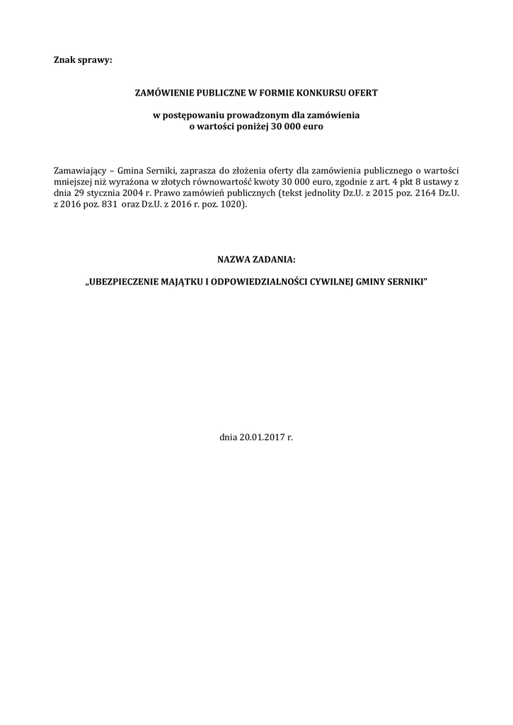 Znak sprawy: ZAMÓWIENIE PUBLICZNE W FORMIE KONKURSU OFERT w postępowaniu prowadzonym dla zamówienia o wartości poniżej 30 000 euro Zamawiający – Gmina Serniki, zaprasza do złożenia oferty dla zamówienia publicznego o wartości mniejszej niż wyrażona w złotych równowartość kwoty 30 000 euro, zgodnie z art. 4 pkt 8 ustawy z dnia 29 stycznia 2004 r. Prawo zamówień publicznych (tekst jednolity Dz.U. z 2015 poz. 2164 Dz.U. z 2016 poz. 831 oraz Dz.U. z 2016 r. poz. 1020). NAZWA ZADANIA: „UBEZPIECZENIE MAJĄTKU I ODPOWIEDZIALNOŚCI CYWILNEJ GMINY SERNIKI” dnia 20.01.2017 r. 1. Nazwa (firma) oraz adres zamawiającego: Gmina Serniki Serniki 1 A, 21 - 107 Serniki, Powiat: Lubartowski Regon: 431019939 NIP: 7141912014 Rodzaj zamawiającego – administracja samorządowa tel. 81 855 04 71 faks 81 855 04 56 e-mail: [email protected] Dni i godziny urzędowania: poniedziałek - piątek: 7:30 – 15:30 1.1. Podmioty objęte zamówieniem: Zamówienie obejmuje Gminę Serniki, Urząd Gminy w Sernikach. Wykaz podmiotów objętych zamówieniem zawarty został w specyfikacji istotnych warunków zamówienia (zwanej dalej również specyfikacją lub SIWZ). O ile w dalszej części specyfikacji i w jej załącznikach jest mowa o zamawiającym lub ubezpieczającym / ubezpieczonym, należy przez to rozumieć Gminę Serniki oraz podmioty wymienione w ww. załączniku. 1.2. Podstawa prawna postępowania i opracowania niniejszej specyfikacji istotnych warunków zamówienia: 1) Ustawa z dnia 29 stycznia 2004 roku Prawo zamówień publicznych (tekst jednolity Dz.U. z 2015 poz. 2164 Dz.U. z 2016 poz. 831 oraz Dz.U. z 2016 r. poz. 1020) Ustawa z dnia 23 kwietnia 1964 roku Kodeks cywilny (tekst jednolity 2016 r. poz. 1822 z późn. zm.) Ustawa z dnia 27 sierpnia 2009 roku o finansach publicznych (tekst jednolity Dz.U. z 2013 r. poz.380 z późn. zm.) Rozporządzenia Prezesa Rady Ministrów z dnia 28 grudnia 2015 r. w sprawie średniego kursu złotego w stosunku do euro stanowiącego podstawę przeliczania wartości zamówień publicznych (Dz. U. z 2015 r., poz. 2254) Ustawa z dnia 17 grudnia 2004 roku o odpowiedzialności za naruszenie dyscypliny finansów publicznych (tekst jednolity Dz.U. z 2013 poz. 168 z późn. zm.) Ustawa z dnia 11 września 2015 roku o działalności ubezpieczeniowej i reasekuracyjnej (tekst jednolity Dz. U. z 2015 r., poz. 1844 z późn. zm.) 2) 3) 4) 5) 6) 1.3. Informacja o brokerze ubezpieczeniowym: Postępowanie prowadzone jest przy udziale brokera ubezpieczeniowego, Inter-Broker sp. z o.o. z siedzibą w Toruniu. Po rozstrzygnięciu postępowania i zawarciu umowy, broker będzie nadzorował jej realizację. Wykonawca, którego oferta zostanie uznana za najkorzystniejszą zapłaci brokerowi ubezpieczeniowemu kurtaż w wysokości zwyczajowo stosowanej. 2. Tryb udzielenia zamówienia. Postępowanie o udzielenie zamówienia publicznego prowadzone jest w trybie konkursu ofert w nawiązaniu do art. 4 pkt 8 ustawy z dnia 29 stycznia 2004 r. Prawo zamówień publicznych (tekst jednolity Dz.U. z 2015 poz. 2164 Dz.U. z 2016 poz. 831 oraz Dz.U. z 2016 r. poz. 1020) oraz art. 44 ust. 3 ustawy z dnia 27 sierpnia 2009 r. o finansach publicznych (tekst jednolity Dz.U z 2013 r. poz. 885 z późn zm.). Zamawiający może w każdej chwili odwołać niniejsze postępowanie lub zmienić jego warunki (Kodeks cywilny, art. 701 § 3 - tekst jednolity Dz.U z 2016 r. poz. 380 z późn. zm.). 2.1. Jawność postępowania. Postępowanie ma charakter jawny. Oferty wykonawców są jawne od chwili ich otwarcia. str. 2 3. Opis przedmiotu zamówienia. Przedmiotem zamówienia jest ubezpieczenie majątku i odpowiedzialności cywilnej Gminy Serniki. Zakres zamówienia obejmuje: 1) ubezpieczenie mienia od wszystkich ryzyk, 2) ubezpieczenie sprzętu elektronicznego od wszystkich ryzyk 3) ubezpieczenie odpowiedzialności cywilnej, 4) ubezpieczenie następstw nieszczęśliwych wypadków sołtysów 3.1. Szczegółowy opis przedmiotu zamówienia zawierają załączniki do niniejszej specyfikacji istotnych warunków zamówienia: Załącznik nr 1: Postanowienia obligatoryjne dotyczące realizacji wszystkich części zamówienia oraz dane do oceny ryzyka. Załącznik nr 1a: Szczegółowy opis przedmiotu zamówienia zawierający warunki obligatoryjne oraz klauzule dodatkowe i inne postanowienia szczególne fakultatywne dla ubezpieczenia majątku i odpowiedzialności cywilnej Gminy Serniki, dotyczący części I zamówienia. Załącznik 1b: Wykaz mienia deklarowanego do ubezpieczeni w systemie sum stałych, wykaz zabezpieczeń przeciwkradzieżowych i przeciwpożarowych, wykaz pojazdów, dotychczasowy przebieg ubezpieczenia, Zakładki nr 1, 2, 3, 4. Załącznik nr 4: Warunki obligatoryjne – definicje pojęć i obligatoryjna treść klauzul dodatkowych Załącznik nr 5: Klauzule dodatkowe i inne postanowienia szczególne fakultatywne 4. Informacja o ofertach częściowych. Zamawiający nie dopuszcza składanie ofert częściowych. 5. Informacja o ofertach wariantowych. Zamawiający nie dopuszcza składania ofert wariantowych. 6. Termin wykonania zamówienia. 6.1. Termin wykonania zamówienia: 12 miesiące, począwszy od 01.02.2017 r. 6.2. W terminie wykonywania zamówienia polisy ubezpieczeniowe będą wystawiane na okres roczny, z wyjątkiem: 6.2.1. ubezpieczeń aktualnych, zawartych wcześniej, w odniesieniu, do których dokumenty ubezpieczeniowe będą wystawione licząc od dnia następnego po dniu wygaśnięcia tych umów do końca pierwszego rocznego okresu wykonania zamówienia; składka za polisy te rozliczana będzie według zasady „co do dnia” za faktyczny okres ochrony, według stawek rocznych zgodnych ze złożoną ofertą i nie będzie miała zastosowania składka minimalna z polisy; 6.3. Pomimo wyrównania okresów ubezpieczenia, o którym mowa powyżej, wykonawcy zobligowani są przedstawić w Formularzu oferty stanowiącym załącznik nr 2 do specyfikacji istotnych warunków zamówienia dla wszystki