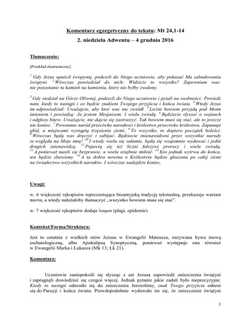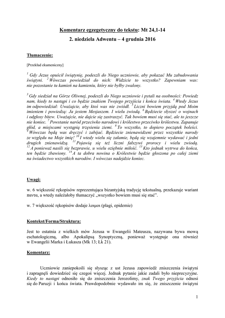 Komentarz egzegetyczny do tekstu: Mt 24,1-14 2. niedziela Adwentu – 4 grudnia 2016 Tłumaczenie: [Przekład ekumeniczny] 1 Gdy Jezus opuścił świątynię, podeszli do Niego uczniowie, aby pokazać Mu zabudowania świątyni. 2 Wówczas powiedział do nich: Widzicie to wszystko? Zapewniam was: nie pozostanie tu kamień na kamieniu, który nie byłby zwalony. 3 Gdy siedział na Górze Oliwnej, podeszli do Niego uczniowie i pytali na osobności: Powiedz nam, kiedy to nastąpi i co będzie znakiem Twojego przyjścia i końca świata. 4 Wtedy Jezus im odpowiedział: Uważajcie, aby ktoś was nie zwiódł. 5 Liczni bowiem przyjdą pod Moim imieniem i powiedzą: Ja jestem Mesjaszem. I wielu zwiodą. 6 Będziecie słyszeć o wojnach i odgłosy bitew. Uważajcie, nie dajcie się zastraszyć. Tak bowiem musi się stać, ale to jeszcze nie koniec. 7 Powstanie naród przeciwko narodowi i królestwo przeciwko królestwu. Zapanuje głód, a miejscami wystąpią trzęsienia ziemi. 8 To wszystko, to dopiero początek boleści. 9 Wówczas będą was dręczyć i zabijać. Będziecie znienawidzeni przez wszystkie narody ze względu na Moje imię! 10 I wtedy wielu się załamie, będą się wzajemnie wydawać i jedni drugich znienawidzą. 11 Pojawią się też liczni fałszywi prorocy i wielu zwiodą. 12 A ponieważ nasili się bezprawie, u wielu oziębnie miłość. 13 Kto jednak wytrwa do końca, ten będzie zbawiony. 14 A ta dobra nowina o Królestwie będzie głoszona po całej ziemi na świadectwo wszystkich narodów. I wówczas nadejdzie koniec. Uwagi: w. 6 większość rękopisów reprezentująca bizantyjską tradycję tekstualną, przekazuje wariant παντα, a wtedy należałoby tłumaczyć „wszystko bowiem musi się stać”. w. 7 większość rękopisów dodaje λοιμοι (plagi, epidemie) Kontekst/Forma/Struktura: Jest to ostatnia z wielkich mów Jezusa w Ewangelii Mateusza, nazywana bywa mową eschatologiczną, albo Apokalipsą Synoptyczną, ponieważ występuje ona również w Ewangelii Marka i Łukasza (Mk 13; Łk 21). Komentarz: Uczniowie zaniepokoili się słysząc z ust Jezusa zapowiedź zniszczenia świątyni i zapragnęli dowiedzieć się czegoś więcej. Jednak pytanie jakie zadali było nieprecyzyjne. Kiedy to nastąpi odnosiło się do zniszczenia Jerozolimy, znak Twego przyjścia odnosi się do Paruzji i końca świata. Prawdopodobnie wydawało im się, że zniszczenie świątyni 1 nastąpi podczas Paruzji, która zainicjuje koniec świata. Dlatego w jednym pytaniu zapytali o różne rzeczy, które winny się wydarzyć w różnym czasie. Uczniowie chcieli również się dowiedzieć w jakim czasie to nastąpi, jak długo trzeba na to czekać (kiedy to nastąpi), chcieli znać dokładne znaki poprzedzające to wydarzenie. Jednak odpowiedź Jezusa nie odnosi się wprost do tak postawionego pytania. Nie powiedział ile upłynie czasu, ani nie dostarczył dokładnych, łatwych do rozpoznania znaków. Na początku przestrzegł przed zwodzicielami. Nie zostało dokładnie wyjaśnione kim będą zwodziciele, dowiadujemy się natomiast, że będzie ich wielu, zwiodą wielu i będą się podszywać pod imię Jezusa (pod Moim imieniem). Może to oznaczać zarówno fałszywych mesjaszy, zjawiska znanego w historii Izraela, jak i osoby powołujące się na imię Jezusa. Być może będą dokonywać cuda i w ten sposób zwiodą wielu. Znak ten nie jest precyzyjny, ale sugeruje, że upłynie jeszcze dużo czasu zanim nastąpi koniec świata. Oprócz zwodzicieli mają się pojawić także i inne zjawiska. Jednym z nich mają być wojny. Wojen będzie wiele, naród będzie walczył z narodem, a królestwo z królestwem. W czasach Jezusa panował Pax Romana, stan pokoju zarówno wewnątrz jak i na zewnątrz imperium rzymskiego, i trwał on do śmierci Aleksandra Sewera w 235 roku. Rozmaici interpretatorzy próbowali to odnieść do swojej epoki, raz był to wiek XVII, innym razem wojny napoleońskie, wiosna ludów. Ewangelista Billy Graham odniósł to do I i II wojny światowej, zwłaszcza II wojny światowej, bo uczestniczyło w niej wiele narodów świata. Jednak z punktu widzenia ludzi współczesnych Jezusowi warunek ten mógł się spełnić w czasach rozpadu imperium rzymskiego. Jezus powiedział, że nadejście wojen nie oznacza, iż koniec jest bliski. Paruzję mają poprzedzać także liczne plagi. Jedną z nich ma być głód, podany w liczbie mnogiej (λιμοι). W historii ludzkości, głód wielokrotnie nękał i po dziś dzień nęka niektóre słabo pod względem gospodarczym rozwinięte kraje. Klęski głodu miały zazwyczaj charakter lokalny, bardzo często jako wynik wojen. W XX wieku pojawiło się nawet zjawisko sztucznego głodu, jak miało to miejsce na Ukrainie. Kryterium to nie jest precyzyjne i nie sposób ocenić kiedy dokładnie się zrealizowało. Sugeruje jednak, że upłynie jeszcze dużo czasu zanim nastąpi koniec świata. Innym warunkiem są trzęsienia ziemi, czyli gwałtowne zaburzenia stanu równowagi w litosferze lub we wnętrzu Ziemi. Będą one miały charakter lokalny. Z większych trzęsień ziemi w historii można wyliczyć trzęsienie ziemi w 526 roku na M. Śródziemnym, kiedy zginęło 200 000 ludzi, w 1556 roku w Chinach – ponad 800 000 ludzi, w 1755 roku w Lizbonie – 50 000 ludzi i w 1976 w Tangszanie – 700 000 osób. I ponownie nie sposób rozstrzygnąć czy to kryterium zrealizowało się już, czy nie. Należy także się spodziewać, że trzęsieniom ziemi będą także towarzyszyć erupcje wulkaniczne. Dowiadujemy się jednak, że to dopiero początek boleści. Następną rzeczą jaka poprzedzi Paruzję są prześladowania. W starożytności największym prześladowaniem chrześcijan było prześladowanie z czasów Dioklecjana. W nowożytności do większych prześladowań należały te, które powstały w wyniku rewolucji francuskiej i październikowej. Chrześcijanie mają zaznać prześladowań ze strony wszystkich narodów. Czy m