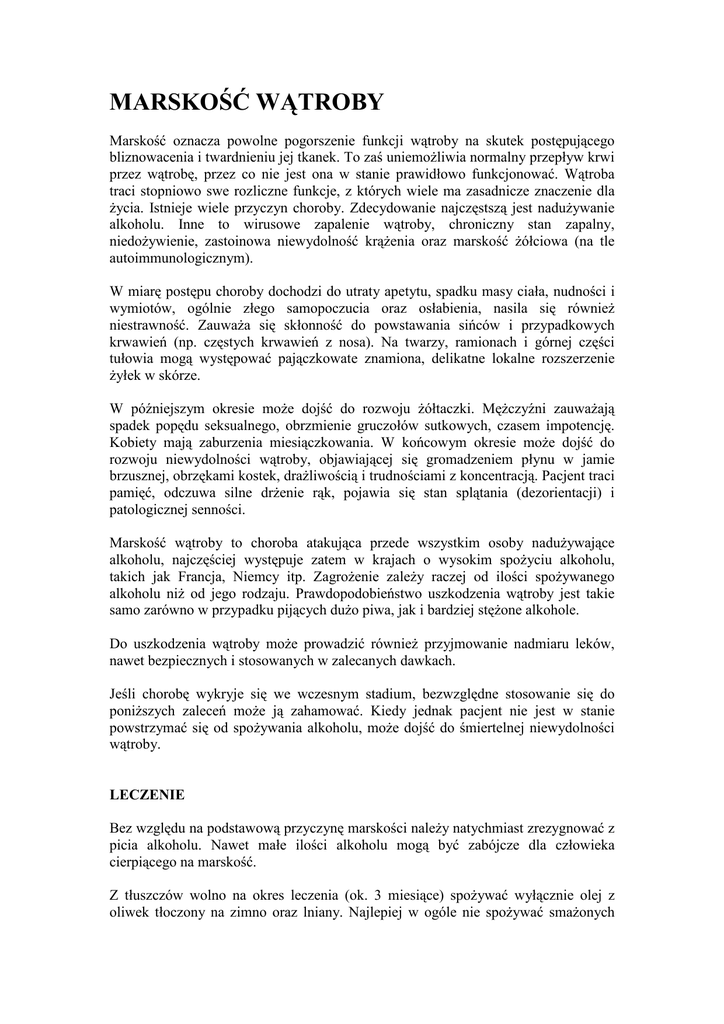 MARSKOŚĆ WĄTROBY Marskość oznacza powolne pogorszenie funkcji wątroby na skutek postępującego bliznowacenia i twardnieniu jej tkanek. To zaś uniemoŜliwia normalny przepływ krwi przez wątrobę, przez co nie jest ona w stanie prawidłowo funkcjonować. Wątroba traci stopniowo swe rozliczne funkcje, z których wiele ma zasadnicze znaczenie dla Ŝycia. Istnieje wiele przyczyn choroby. Zdecydowanie najczęstszą jest naduŜywanie alkoholu. Inne to wirusowe zapalenie wątroby, chroniczny stan zapalny, niedoŜywienie, zastoinowa niewydolność krąŜenia oraz marskość Ŝółciowa (na tle autoimmunologicznym). W miarę postępu choroby dochodzi do utraty apetytu, spadku masy ciała, nudności i wymiotów, ogólnie złego samopoczucia oraz osłabienia, nasila się równieŜ niestrawność. ZauwaŜa się skłonność do powstawania sińców i przypadkowych krwawień (np. częstych krwawień z nosa). Na twarzy, ramionach i górnej części tułowia mogą występować pajączkowate znamiona, delikatne lokalne rozszerzenie Ŝyłek w skórze. W późniejszym okresie moŜe dojść do rozwoju Ŝółtaczki. MęŜczyźni zauwaŜają spadek popędu seksualnego, obrzmienie gruczołów sutkowych, czasem impotencję. Kobiety mają zaburzenia miesiączkowania. W końcowym okresie moŜe dojść do rozwoju niewydolności wątroby, objawiającej się gromadzeniem płynu w jamie brzusznej, obrzękami kostek, draŜliwością i trudnościami z koncentracją. Pacjent traci pamięć, odczuwa silne drŜenie rąk, pojawia się stan splątania (dezorientacji) i patologicznej senności. Marskość wątroby to choroba atakująca przede wszystkim osoby naduŜywające alkoholu, najczęściej występuje zatem w krajach o wysokim spoŜyciu alkoholu, takich jak Francja, Niemcy itp. ZagroŜenie zaleŜy raczej od ilości spoŜywanego alkoholu niŜ od jego rodzaju. Prawdopodobieństwo uszkodzenia wątroby jest takie samo zarówno w przypadku pijących duŜo piwa, jak i bardziej stęŜone alkohole. Do uszkodzenia wątroby moŜe prowadzić równieŜ przyjmowanie nadmiaru leków, nawet bezpiecznych i stosowanych w zalecanych dawkach. Jeśli chorobę wykryje się we wczesnym stadium, bezwzględne stosowanie się do poniŜszych zaleceń moŜe ją zahamować. Kiedy jednak pacjent nie jest w stanie powstrzymać się od spoŜywania alkoholu, moŜe dojść do śmiertelnej niewydolności wątroby. LECZENIE Bez względu na podstawową przyczynę marskości naleŜy natychmiast zrezygnować z picia alkoholu. Nawet małe ilości alkoholu mogą być zabójcze dla człowieka cierpiącego na marskość. Z tłuszczów wolno na okres leczenia (ok. 3 miesiące) spoŜywać wyłącznie olej z oliwek tłoczony na zimno oraz lniany. Najlepiej w ogóle nie spoŜywać smaŜonych pokarmów, a jeśli chory nie moŜe się bez nich obejść, to naleŜy smaŜyć na małym ogniu i uŜywać do smaŜenia wyłącznie niewielkich ilości oleju z pestek winogron. Koniecznością jest picie 3 x dziennie po 2 szklanki wody miedzy posiłkami i nie wolno tej zasady lekcewaŜyć. Niedobór wody jest np. jedną z głównych przyczyn kamicy i gromadzenia w organizmie nadmiernej ilości toksyn, które obciąŜają wątrobę. Na okres leczenia, chory powinien bezwzględnie i zupełnie wykluczyć następujące produkty: cukier rafinowany, słodycze, białe pieczywo i wszelkie produkty z białej mąki, kawę, herbatę, czekoladę, colę, napoje słodzone, sery Ŝółte i topione, śmietanę, masło krowie, margarynę, praŜonych orzechów, frytek, wieprzowinę, ocet, sól, biały ryŜ, smalec, ostre przyprawy. NaleŜy takŜe wykluczyć lub bardzo ograniczyć spoŜycie mięsa, nabiału i tłuszczów. W miarę moŜliwości, chory powinien unikać leków syntetycznych i konserwantów występujących w przetwarzanej Ŝywności, a takŜe sztucznych słodzików. Zamiast mleka krowiego moŜna spoŜywać mleko sojowe lub owsiane. Przynajmniej na okres leczenia przejść na dietę wyłącznie roślinną (bez pokarmów mięsnych i nabiałowych), gdyŜ taka dieta daje najlepsze wyniki i zwykle prowadzi do poprawy stanu zdrowia nawet w bardzo źle rokujących przypadkach. Najlepszym przykładem skuteczności diety wegańskiej oraz innych sugerowanych w niniejszym opracowaniu metod moŜe być przypadek pewnej kobiety, która zapadła na marskość wątroby i pomimo bardzo złego stanu zdrowia i tego, Ŝe powiedziano jej, Ŝe będzie Ŝyła dwa tygodnie, to po przejściu na dietę roślinną i zastosowaniu innych środków osoba ta od tamtej pory przeŜyła juŜ ponad dwa lata i czuje się dobrze: „Piszę do Pana ponownie w sprawie mojej mamy, która ma marskość wątroby. Dwa lata temu lekarze dawali jej dwa tygodnie Ŝycia! Teraz czuje się dobrze, gdyŜ jest na diecie wegetariańskiej i chciałaby prosić Pana o zalecenia, które pomogłyby jej jeszcze się wzmocnić” ([email protected]). Dieta wysokobiałkowa, a szczególnie nadmiar białka zwierzęcego (mięso, nabiał) stanowi duŜe zagroŜenie dla tkanek wątroby, dlatego naleŜy spoŜywać pokarmy o mniejszej zawartości białka, np. owoce, warzywa, a jeśli spoŜywane są pokarmy o większej zawartości białka to powinno to być białko roślinne (rośliny strączkowe, ryŜ z błonnikiem, orzechy, kasze itp.). Najlepsze wyniki w przypadku marskości wątroby daje spoŜywanie surowych owoców i warzyw oraz posty owocowo-warzywne. Rośliny strączkowe, choć bogate w białko, to zawierają duŜo argininy – aminokwasu, który pomaga odtruć organizm z bardzo toksycznego i uszkadzającego wątrobę amoniaku, który stanowi m.in. uboczny produkt przemiany białka zwierzęcego w tłuszcz. Bardzo waŜna jest umiejętna kontrola stresu, dzięki codziennym ćwiczeniom fizycznym lub spacerom, lekturze Pisma Świętego oraz ćwiczeniu pozytywnego sposobu myślenia. Codziennie wieczorem koniecznie trzeba robić gorący prysznic na okolice wątroby przez ok. 5 minut, na zmianę z bardzo zimnym okładem na okolice wątroby.