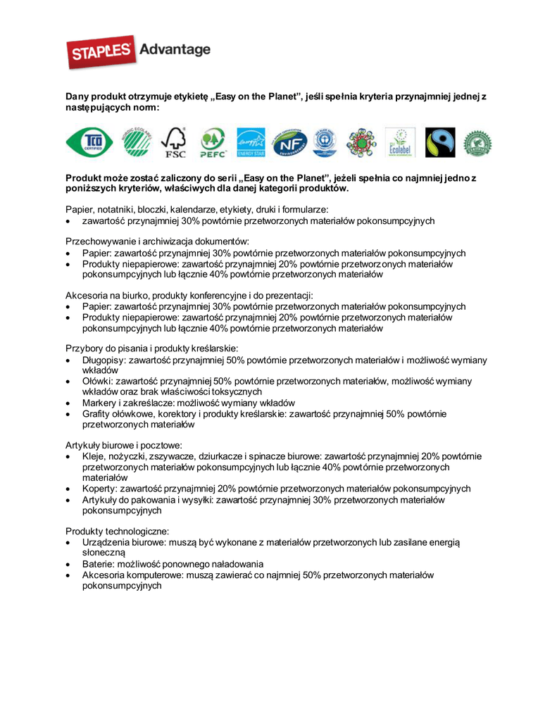 Dany produkt otrzymuje etykietę „Easy on the Planet”, jeśli spełnia kryteria przynajmniej jednej z następujących norm: Produkt może zostać zaliczony do serii „Easy on the Planet”, jeżeli spełnia co najmniej jedno z poniższych kryteriów, właściwych dla danej kategorii produktów. Papier, notatniki, bloczki, kalendarze, etykiety, druki i formularze: zawartość przynajmniej 30% powtórnie przetworzonych materiałów pokonsumpcyjnych Przechowywanie i archiwizacja dokumentów: Papier: zawartość przynajmniej 30% powtórnie przetworzonych materiałów pokonsumpcyjnych Produkty niepapierowe: zawartość przynajmniej 20% powtórnie przetworz onych materiałów pokonsumpcyjnych lub łącznie 40% powtórnie przetworzonych materiałów Akcesoria na biurko, produkty konferencyjne i do prezentacji: Papier: zawartość przynajmniej 30% powtórnie przetworzonych materiałów pokonsumpcyjnych Produkty niepapierowe: zawartość przynajmniej 20% powtórnie przetworzonych materiałów pokonsumpcyjnych lub łącznie 40% powtórnie przetworzonych materiałów Przybory do pisania i produkty kreślarskie: Długopisy: zawartość przynajmniej 50% powtórnie przetworzonych materiałów i możliwość wymiany wkładów Ołówki: zawartość przynajmniej 50% powtórnie przetworzonych materiałów, możliwość wymiany wkładów oraz brak właściwości toksycznych Markery i zakreślacze: możliwość wymiany wkładów Grafity ołówkowe, korektory i produkty kreślarskie: zawartość przynajmniej 50% powtórnie przetworzonych materiałów Artykuły biurowe i pocztowe: Kleje, nożyczki, zszywacze, dziurkacze i spinacze biurowe: zawartość przynajmniej 20% powtórnie przetworzonych materiałów pokonsumpcyjnych lub łącznie 40% powtórnie przetworzonych materiałów Koperty: zawartość przynajmniej 20% powtórnie przetworzonych materiałów pokonsumpcyjnych Artykuły do pakowania i wysyłki: zawartość przynajmniej 30% przetworzonych materiałów pokonsumpcyjnych Produkty technologiczne: Urządzenia biurowe: muszą być wykonane z materiałów przetworzonych lub zasilane energią słoneczną Baterie: możliwość ponownego naładowania Akcesoria komputerowe: muszą zawierać co najmniej 50% przetworzonych materiałów pokonsumpcyjnych Tusze, tonery i tasiemki: możliwość regeneracji lub zawartość przynajmniej 50% przetworzonych materiałów pokonsumpcyjnych Pomieszczenia socjalne zawartość przynajmniej 30% powtórnie przetworzonych materiałów pokonsumpcyjnych Torby biznesowe i akcesoria: zawartość przynajmniej 20% powtórnie przetworzonych materiałów pokonsumpcyjnych lub łącznie 40% powtórnie przetworzonych materiałów Wyposażenie wnętrz biurowych: Krzesła i maty pod krzesła: zawartość przynajmniej 30% powtórnie przetworzonych materiałów pokonsumpcyjnych Inne: zawartość przynajmniej 50% powtórnie przetworzonych materiałów pokonsumpcyjnych