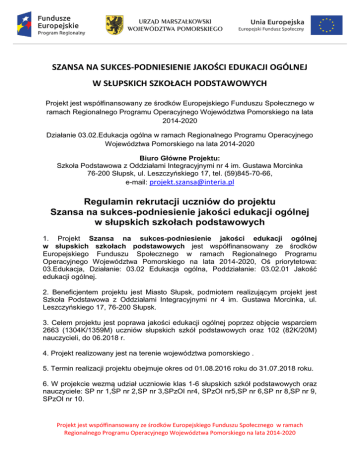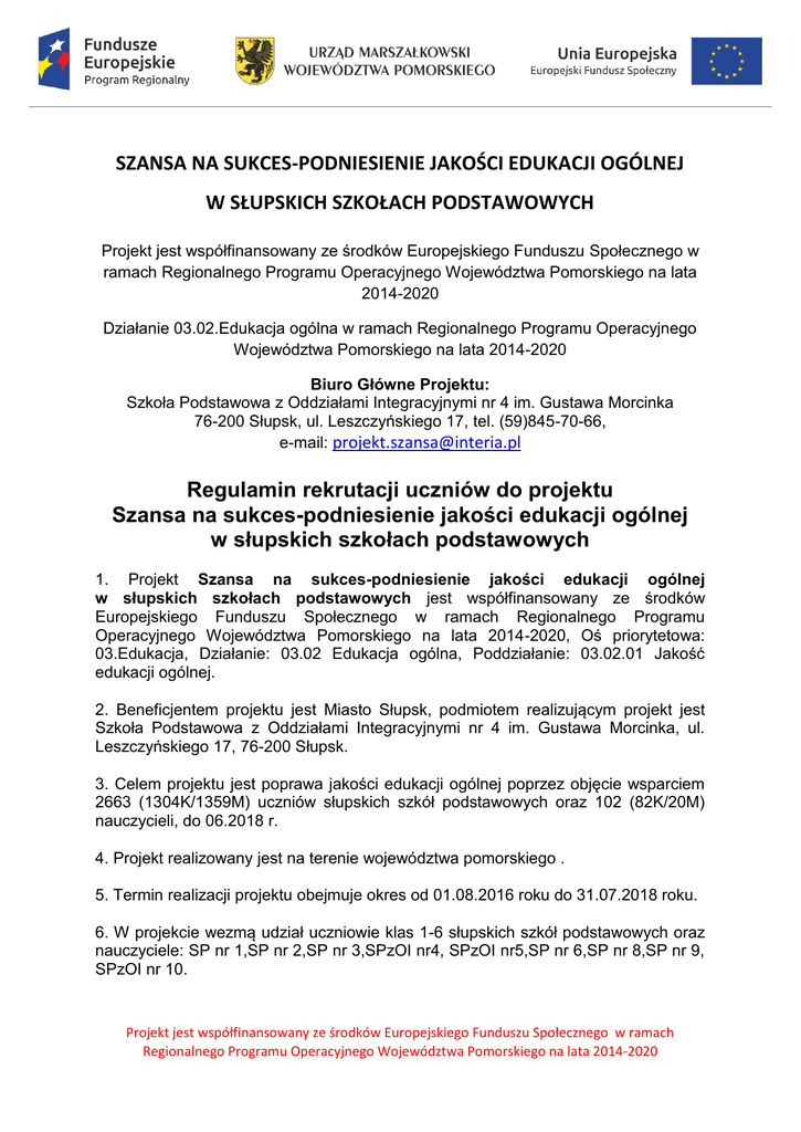 SZANSA NA SUKCES-PODNIESIENIE JAKOŚCI EDUKACJI OGÓLNEJ W SŁUPSKICH SZKOŁACH PODSTAWOWYCH Projekt jest współfinansowany ze środków Europejskiego Funduszu Społecznego w ramach Regionalnego Programu Operacyjnego Województwa Pomorskiego na lata 2014-2020 Działanie 03.02.Edukacja ogólna w ramach Regionalnego Programu Operacyjnego Województwa Pomorskiego na lata 2014-2020 Biuro Główne Projektu: Szkoła Podstawowa z Oddziałami Integracyjnymi nr 4 im. Gustawa Morcinka 76-200 Słupsk, ul. Leszczyńskiego 17, tel. (59)845-70-66, e-mail: [email protected] Regulamin rekrutacji uczniów do projektu Szansa na sukces-podniesienie jakości edukacji ogólnej w słupskich szkołach podstawowych 1. Projekt Szansa na sukces-podniesienie jakości edukacji ogólnej w słupskich szkołach podstawowych jest współfinansowany ze środków Europejskiego Funduszu Społecznego w ramach Regionalnego Programu Operacyjnego Województwa Pomorskiego na lata 2014-2020, Oś priorytetowa: 03.Edukacja, Działanie: 03.02 Edukacja ogólna, Poddziałanie: 03.02.01 Jakość edukacji ogólnej. 2. Beneficjentem projektu jest Miasto Słupsk, podmiotem realizującym projekt jest Szkoła Podstawowa z Oddziałami Integracyjnymi nr 4 im. Gustawa Morcinka, ul. Leszczyńskiego 17, 76-200 Słupsk. 3. Celem projektu jest poprawa jakości edukacji ogólnej poprzez objęcie wsparciem 2663 (1304K/1359M) uczniów słupskich szkół podstawowych oraz 102 (82K/20M) nauczycieli, do 06.2018 r. 4. Projekt realizowany jest na terenie województwa pomorskiego . 5. Termin realizacji projektu obejmuje okres od 01.08.2016 roku do 31.07.2018 roku. 6. W projekcie wezmą udział uczniowie klas 1-6 słupskich szkół podstawowych oraz nauczyciele: SP nr 1,SP nr 2,SP nr 3,SPzOI nr4, SPzOI nr5,SP nr 6,SP nr 8,SP nr 9, SPzOI nr 10. Projekt jest współfinansowany ze środków Europejskiego Funduszu Społecznego w ramach Regionalnego Programu Operacyjnego Województwa Pomorskiego na lata 2014-2020 7. Do projektu zakwalifikowanych zostanie co najmniej 2663 uczniów i 102 nauczycieli. 8. Na wypadek rezygnacji ucznia w wyniku choroby lub z przyczyn losowych z udziału w projekcie, utworzona zostanie lista rezerwowa obejmująca co najmniej 2 uczniów z każdej szkoły. 9. Po dokonaniu rekrutacji uczniów do projektu, z ich rodzicami/opiekunami prawnymi wypełnione i podpisane zostaną dokumenty: deklaracja uczestnictwa w projekcie, dane uczestników projektu, którzy otrzymują wsparcie w ramach RPO WP 20142020, oświadczenie-zgoda na przetwarzanie danych osobowych, zgoda na wykorzystanie wizerunku dziecka. 10.Nauczyciele przystępujący do projektu również wypełnią dokumenty: deklaracja uczestnictwa w projekcie, dane uczestników projektu, którzy otrzymują wsparcie w ramach RPO WP 2014-2020, oświadczenie-zgoda na przetwarzanie danych osobowych, zgoda na wykorzystanie wizerunku. Etapy rekrutacji: 1. W słupskich szkołach podstawowych zostaną zorganizowane spotkania informacyjne dla uczniów klas 1-6, rodziców i nauczycieli, w trakcie których zostaną przedstawione założenia projektu. Regulamin rekrutacji, kryteria i zasady uczestnictwa w projekcie zostaną umieszczone na stronach internetowych szkół. Uczniowie otrzymają informacje od wychowawców, nauczyciele na Radach Pedagogicznych, rodzice na pierwszych spotkaniach z wychowawcą i przez edziennik. 2. Wychowawcy przekażą karty zgłoszenia do projektu uczniom. Dokumenty będą do pobrania również w sekretariatach szkół, na ich stronach www i biurze głównym projektu. 3. Wypełnione i podpisane dokumenty zgłoszeniowe będą przyjmowane przez wychowawców do 18 października 2016 r. od daty ogłoszenia rekrutacji. Zgłoszenia, które nie będą spełniały powyższych wymogów, nie będą rozpatrywane. 4. Weryfikacji dokumentów pod kątem formalnym dokonają Komisje Rekrutacyjne w poszczególnych szkołach składające się z: Dyrektora Szkoły, szkolnego koordynatora oraz specjalisty ds. monitoringu i promocji. 5. Komisje Rekrutacyjne sporządzą protokół oraz listę osób zakwalifikowanych do udziału w projekcie. 6. O zakwalifikowaniu ucznia do projektu poinformowani zostaną rodzice przez edziennik w ciągu 3 dni roboczych od zakończenia przyjmowania kart zgłoszenia udziału w projekcie Szansa na sukces - podniesienie jakości edukacji ogólnej w słupskich szkołach podstawowych Projekt jest współfinansowany ze środków Europejskiego Funduszu Społecznego w ramach Regionalnego Programu Operacyjnego Województwa Pomorskiego na lata 2014-2020 7. Koordynator projektu zastrzega sobie prawo do decydowania w sprawach nieobjętych regulaminem rekrutacji oraz w sytuacjach spornych. Warunki przyjęcia uczniów do projektu: 1. Projekt adresowany jest do uczniów klas 1-6 słupskich szkół podstawowych. 2. Kryteria rekrutacji : a) Interaktywne warsztaty matematyczne Dla: -kl. IV-VI -uczniowie z ocena dst i poniżej z matematyki, średnia 3,0 i poniżej -kl. I- III na podstawie oceny opisowej nauczyciela b) Magia matematyki -zajęcia dla uczniów uzdolnionych i zainteresowanych przedmiotami ścisłymi Warsztaty matematyczno-przyrodnicze z elementami fotografii z zastosowaniem TIK (kl. IV- VI) Matematyka w praktyce-gry i zabawy logiczne (kl.I- VI) Szachy (kl. I-VI) Mały olimpijczyk (kl. V- VI) Robotyka (kl. I- VI) Kodowanie ( Kl. I- VI) Dla: -kl. IV- VI- uczniowie ze średnią 4,0 i powyżej -kl. I- III – uczniowie wskazani przez nauczyciela c) Rozszerzenie oferty edukacyjno- terapeutycznej dla uczniów o specjalnych potrzebach edukacyjnych Terapia pedagogiczna Gimnastyka korekcyjna Logopedia Dla: - kl. I- VI na podstawie opinii PPP lub orzeczenia o kształceniu specjalnym, niepełnosprawności oraz uczeń młodszy. d) Angielski teatrzyk -kl.I- VI – uczniowie wyrażający chęć udziału w zajęciach, pragnący rozwijać kompetencje językowe. e) Organizacja zajęć z doradztwa zawodowego-obligatoryjnie wszyscy uczniowie klas VI. f) Kształcenie nauczycieli-studia pody