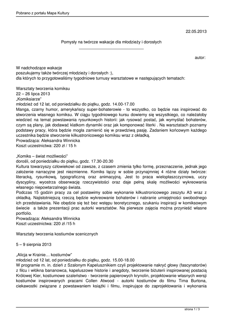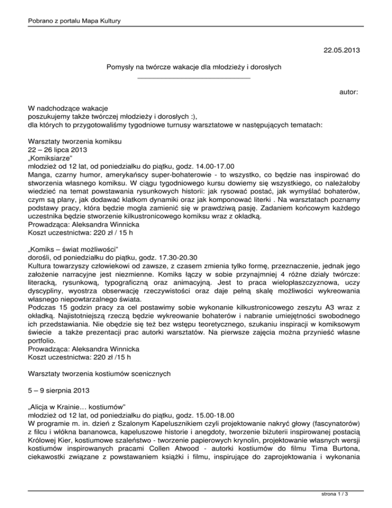 Pobrano z portalu Mapa Kultury 22.05.2013 Pomysły na twórcze wakacje dla młodzieży i dorosłych ____________________________ autor: W nadchodzące wakacje poszukujemy także twórczej młodzieży i dorosłych :), dla których to przygotowaliśmy tygodniowe turnusy warsztatowe w następujących tematach: Warsztaty tworzenia komiksu 22 – 26 lipca 2013 „Komiksiarze” młodzież od 12 lat, od poniedziałku do piątku, godz. 14.00-17.00 Manga, czarny humor, amerykańscy super-bohaterowie - to wszystko, co będzie nas inspirować do stworzenia własnego komiksu. W ciągu tygodniowego kursu dowiemy się wszystkiego, co należałoby wiedzieć na temat powstawania rysunkowych historii: jak rysować postać, jak wymyślać bohaterów, czym są plany, jak dodawać klatkom dynamiki oraz jak komponować literki . Na warsztatach poznamy podstawy pracy, która będzie mogła zamienić się w prawdziwą pasję. Zadaniem końcowym każdego uczestnika będzie stworzenie kilkustronicowego komiksu wraz z okładką. Prowadząca: Aleksandra Winnicka Koszt uczestnictwa: 220 zł / 15 h „Komiks – świat możliwości” dorośli, od poniedziałku do piątku, godz. 17.30-20.30 Kultura towarzyszy człowiekowi od zawsze, z czasem zmienia tylko formę, przeznaczenie, jednak jego założenie narracyjne jest niezmienne. Komiks łączy w sobie przynajmniej 4 różne działy twórcze: literacką, rysunkową, typograficzną oraz animacyjną. Jest to praca wielopłaszczyznowa, uczy dyscypliny, wyostrza obserwację rzeczywistości oraz daje pełną skalę możliwości wykreowania własnego niepowtarzalnego świata. Podczas 15 godzin pracy za cel postawimy sobie wykonanie kilkustronicowego zeszytu A3 wraz z okładką. Najistotniejszą rzeczą będzie wykreowanie bohaterów i nabranie umiejętności swobodnego ich przedstawiania. Nie obędzie się też bez wstępu teoretycznego, szukaniu inspiracji w komiksowym świecie a także prezentacji prac autorki warsztatów. Na pierwsze zajęcia można przynieść własne portfolio. Prowadząca: Aleksandra Winnicka Koszt uczestnictwa: 220 zł /15 h Warsztaty tworzenia kostiumów scenicznych 5 – 9 sierpnia 2013 „Alicja w Krainie… kostiumów” młodzież od 12 lat, od poniedziałku do piątku, godz. 15.00-18.00 W programie m. in. dzień z Szalonym Kapelusznikiem czyli projektowanie nakryć głowy (fascynatorów) z filcu i włókna bananowca, kapeluszowe historie i anegdoty, tworzenie biżuterii inspirowanej postacią Królowej Kier, kostiumowe szaleństwo - tworzenie papierowych krynolin, projektowanie własnych wersji kostiumów inspirowanych pracami Collen Atwood - autorki kostiumów do filmu Tima Burtona, ciekawostki związane z powstawaniem książki i filmu, inspirujące do zaprojektowania i wykonania strona 1 / 3 Pobrano z portalu Mapa Kultury własnego kostiumu. Prowadząca: Aga Ostrowska Koszt uczestnictwa: 220 zł /15 h Warsztaty tworzenia lalek teatralnych 29 lipca – 2 sierpnia 2013 „Domowy teatrzyk” dzieci od 7 do 12 lat, od poniedziałku do piątku, godz. 14.00-17.00 Warsztaty zostały tak zaprojektowane tak, żeby każde dziecko zapoznało się z różnymi rodzajami lalek teatralnych, a następnie poznało techniki ich wykonania. Poziom trudności dostosowany jest do grupy wiekowej 7-12 lat, dlatego też niektóre rozwiązania techniczne uległy uproszczeniu (korzystanie z gotowych elementów tj. krzyżak, wykroje). Efektem końcowym zajęć będzie wykonanie przez każde dziecko 3-4 rodzajów lalek oraz kartonowego okienka teatrzyku. W programie warsztatów lalkarskich: pacynka tulejkowa, pacynki mimiczne -„Skarpetkowe zwierzaki-cudaki”, kukiełka na kiju – „Mieszkańcy leśnej polany, marionetka czyli lalka poruszana od góry za pomocą sznurków lub drucików zawieszonych na tzw. krzyżaku – „Ptak-cudak”. Ostatniego dnia przygotujemy scenę dla naszych lalek - mini teatrzyk z kartonu. Prowadząca: Małgorzata Pietrucha Koszt uczestnictwa: 200 zł /15 h „Warsztaty lalkarskie” dorośli, od poniedziałku do piątku, godz. 17.30-20.30 Celem warsztatów jest zapoznanie grupy dorosłych z kilkoma typami lalek oraz technikami ich wykonania. Każdy uczestnik zaprojektuje i własnoręcznie wykona dwie lalki oraz okienko teatralne. W programie warsztatów: - pacynka szyta - lalka poruszana za pomocą dłoni ukrytej w koszulce pełniącej rolę kostiumu scenicznego a zarazem pozwalającej na wykonywanie ruchów palcami umieszczonymi we wnętrzu głowy oraz rękawów, - marionetka (pajac lub baletnica) - lalka poruszana od góry za pomocą sznurków lub drucików zawieszonych na tzw. krzyżaku, w odróżnieniu od pacynki może przedstawiać całą postać. Praca nad marionetką uwzględnia projektowanie, wykonanie szkieletu, poszczególnych części i łączenie elementów, malowanie marionetki, szycie ubrania i zdobienie fragmentami filcu, tiulu, tkaniny, zrobienie krzyżaka, zamontowanie za pomocą sznurków. - okienko teatrzyku – kartonowa scena z elementami dekoracyjnymi: zamontowaną kurtyną z tkaniny, przestrzennymi elementami scenografii i namalowanym tłem. Prowadząca: Małgorzata Pietrucha Koszt uczestnictwa: 220 zł /15 h Warsztaty ręcznego tworzenia książek 29 lipca – 2 sierpnia 2013 „Warsztaty ręcznego tworzenia książek” – młodzież od 12 lat, od poniedziałku do piątku, godz. 14.00-17.00 - dorośli, od poniedziałku do piątku, godz. 17.30-20.30 Zaproszenie do niezwykłego świata starych manuskryptów i przeistoczenia się w średniowiecznych introligatorów. Podczas tygodniowych warsztatów przejdziemy przez kolejne etapy ręcznego tworzenia książki: od składania i cięcia papieru, przez poznanie możliwości ręcznego szycia grzbietu włącznie z strona 2 / 3 Pobrano z portalu Mapa Kultury praktyką solidnego wiązania koptyjskiego, przygotowanie oprawy w postaci drewnianej okładki obleczonej tkaniną. Dodatkowo w programie spotkanie z kaligrafią średniowieczną – poznanie liter alfabetu uncjały