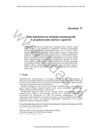 Rozdział monografii: 'Bazy Danych: Struktury, Algorytmy, Metody', Kozielski S., Małysiak B., Kasprowski P., Mrozek D. (red.), WKŁ 2006 Rozdział 37 w Rola dziedzinowej ontologii mammografii w projektowaniu edytora raportów w 1 Wstęp da .b w Streszczenie. W procesie projektowania oprogramowania wyróżnić można wiele etapów. Z tej perspektywy dziedzinowa ontologia mammografii (klasyfikacja opisu badania mammograficznego wraz z obrazem historii choroby pacjenta) odpowiadałaby etapowi analizy wiedzy z zakresu danej dziedziny oraz potrzeb i wymagań użytkownika. W rozdziale przedstawiono problemy z dziedziny mammografii przemawiające za stworzeniem takiego edytora. Opisano dziedzinową ontologię mammografii oraz oceniono ją pod kątem bezpośredniego zastosowania do projektowania interfejsu. W niniejszym rozdziale zaproponowano metodę projektowania interfejsu polegającą na modyfikacji modelu wyjściowego i mapowaniu go na odpowiednie klasy aplikacji edytora. Interfejs aplikacji zoptymalizowano pod kątem wprowadzania treści raportu mammograficznego przy jak najmniejszym obciążeniu użytkownika. pl s. Zaprojektowanie dostosowanego do wymogów aplikacji interfejsu pozwalającego na intuicyjne wprowadzanie danych bez przeciążania użytkownika pozostaje nadal problemem otwartym. Powszechnym, choć nie celowym rozwiązaniem, jest stosowanie uproszczonych, często generowanych automatycznie formularzy. Modele ontologiczne coraz częściej są używane do definiowania i opisu złożonych typów danych. Dlatego, zdaniem autorów, warto ocenić przydatność ontologii jako podstawy projektowania interfejsów użytkownika. Modelowanie dziedziny zastosowań jest ważnym etapem w projektowaniu aplikacji informatycznych. Mimo, iż idea ontologii wywodzi się ze Sztucznej Inteligencji, jej zastosowanie jest postulowane nie tylko dla systemów inteligentnych [5]. Użycie właściwego modelu dziedziny jest krytyczne również w procesie projektowania interfejsu użytkownika [6], chociaż nie dostarcza bezpośrednich wskazówek, co do wyboru właściwych obiektów manipulacji danymi. Teresa Podsiadły-Marczykowska: Instytut Biocybernetyki i Inżynierii Biomedycznej PAN, ul. Trojdena 4, 02-109 Warszawa, Polska email: [email protected] Rafał Zawiślak: Instytut Automatyki Politechniki Łódzkiej, ul. Stefanowskiego 18/22, 90-924 Łódź, Polska email: [email protected] (c) Copyright by Politechnika Śląska, Instytut Informatyki, Gliwice 2006 Rozdział monografii: 'Bazy Danych: Struktury, Algorytmy, Metody', Kozielski S., Małysiak B., Kasprowski P., Mrozek D. (red.), WKŁ 2006 T. Podsiadły-Marczykowska, R. Zawiślak w Podstawowe zastosowania ontologii opisano w [7]. Jednym z nich jest wykorzystanie ontologii jako swoistej specyfikacji w procesie projektowania i tworzenia oprogramowania. Rolą ontologii jest tu dostarczenie modelu dziedziny, tj. zbioru istotnych, kluczowych dla danego zastosowania pojęć, ich atrybutów (wraz z dozwolonymi wartościami) oraz łączących je relacji. Podstawowe korzyści uzyskane przy tym podejściu to między innymi: prawidłowa dokumentacja, wiarygodność, niezawodność oraz możliwość ponownego użycia wiedzy [7]. Problemy występujące w dziedzinie mammografii, takie jak: − zmienność interpretacji mammogramów [1], − niepokojąco wysoki odsetek przeoczonych lub błędnie zinterpretowanych przypadków raka piersi [2], − niska jakość informacji medycznych zawartych w raportach mammograficznych [3] skłoniły autorów niniejszego rozdziału by stworzyć narzędzie służące do standaryzowania opisu zdjęć mammograficznych. Guz jest najczęstszą i jednocześnie najbardziej typową dla raka sutka zmianą patologiczną stwierdzaną za pomocą mammografi [4]. W procesie opisu mammogramu zasadnicze znaczenie ma prawidłowa ocena mikrozwapnień. Stanowią one jeden z ważnych objawów umożliwiających wczesne wykrycie małych, niepalpacyjnych nowotworów piersi [4]. Należy podkreślić fakt, iż w chwili obecnej mammografia jest jedyną wiarygodną metodą oceny mikrozwapnień [4]. Analizując powyższe informacje autorzy rozdziału uznali, że najczęściej występującymi i najistotniejszymi diagnostycznie zmianami w mammografii są guzy (masy) i zwapnienia. Dlatego też pierwsza wersja graficznego edytora raportów została zaprojektowana do opisu tylko tych typów zmian. da .b w w 2 Rola ontologii w projektowaniu interfejsu pl s. Projektowanie oprogramowania jest procesem iteracyjnym i powinno zawierać co najmniej: − etap analizy wiedzy z zakresu danej dziedziny oraz potrzeb i wymagań użytkownika, − etap projektowania rozwiązań programowych umożliwiających wykonanie wcześniej sprecyzowanych zadań w sposób satysfakcjonujący użytkownika, − etap weryfikacji zastosowanych rozwiązań. Z tej perspektywy dziedzinowa ontologia mammografii odpowiada pierwszemu etapowi. Obecnie dostępnych jest kilkadziesiąt aplikacji do tworzenia ontologii, programów umożliwiających zapis, przeglądanie, modyfikację i wizualizację ontologii w formie czytelnej dla komputera. Opis i ocenę najbardziej znanych można znaleźć w [17]. Spośród opisanych tam programów autorzy artykułu wybrali edytor Protegee-2000. Został on stworzony 15 lat temu w Departamencie Informatyki Medycznej Uniwersytetu Stanford. W swojej pierwszej wersji był to specjalistyczny program wspomagający akwizycję wiedzy dla medycznych systemów ekspertowych do planowania terapii onkologicznych. Obecnie jest używany do tworzenia modeli z różnych dziedzin wiedzy (od medycyny i genetyki po elektronikę, geografię czy awiację). O jego popularności może świadczyć fakt, iż ma ponad 8000 zarejestrowanych użytkowników. Jego ogromną zaletą jest to, że może on być stosowany do tworzenia samych ontologii, jak również - na ich podstawie - Baz Wiedzy. Jest to narzędzie Open-Source które posiada naturalne wsparcie dla języka Java. Model wiedzy edytora Prot