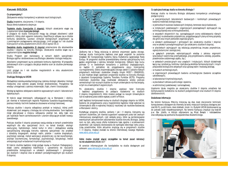 Kierunek: BIOLOGIA Co zyskujesz ko cz c studia na kierunku Biologia ? Co proponujemy ? Zdobywanie wiedzy i kompetencji w zakresie nauk biologicznych. Ko cz c studia na kierunku Biologia zdobywasz kompetencje umo liwiaj ce podj cie pracy: - w specjalistycznych laboratoriach badawczych i kontrolnych prowadz cych badania materia u biologicznego, - w jednostkach naukowo-badawczych (instytuty, terenowe stacje badawcze), - w instytucjach pa stwowych i organizacjach pozarz dowych zajmuj cych si ochron przyrody oraz ochron rodowiska, - w zespo ach eksperckich (np. sporz dzaj cych oceny oddzia ywania ró nych inwestycji na rodowisko przyrodnicze, przygotowuj cych plany ochrony przyrody dla gmin oraz innych jednostek organizacyjnych), - w szko ach podstawowych i gimnazjach (po uko czeniu studiów I stopnia) oraz w szko ach ponadgimnazjalnych (po uko czeniu studiów II stopnia), - w placówkach zajmuj cych si edukacj przyrodnicz (muzea przyrodnicze, ogrody botaniczne i zoologiczne), - w ga ziach przemys u wykorzystuj cych wiedz z zakresu ergonomii (placówkach wzornictwa przemys owego, przy projektowaniu odzie y, pojazdów, przedmiotów codziennego u ytku, itp.), - w zak adach produkcyjnych oraz urz dach i instytucjach, których dzia alno czy si z produkcj , kontrol i dystrybucj rodków farmaceutycznych i innych preparatów biologicznie aktywnych oraz upraw ro lin i hodowl zwierz t, - w muzeach archeologicznych, - w organizacjach prowadz cych badania archeologiczne (badanie szcz tków szkieletowych), - w laboratoriach kryminalistycznych, - w placówkach zdrowia publicznego i ywienia, - w administracji pa stwowej i samorz dowej. Uzyskanie tytu u magistra po uko czeniu studiów II stopnia umo liwia te kontynuowanie kszta cenia na studiach podyplomowych oraz studiach III stopnia (doktoranckich). Studia: bezp atne, stacjonarne, I i II stopnia. Nasza oferta kszta cenia obejmuje: Trzyletnie studia licencjackie (I stopnia), których uko czenie wi e si z uzyskaniem tytu u licencjata biologii. O przyj cie na studia licencjackie mog si ubiega absolwenci szkó rednich, którzy zdali egzamin maturalny. Kwalifikacja odbywa si w drodze konkursu wiadectw. Laureaci olimpiad biologicznych przyjmowani s z pomini ciem post powania rekrutacyjnego. Limit przyj na I rok studiów licencjackich w roku akademickim 2014/2015 wynosi 50.2) Dwuletnie studia magisterskie (II stopnia) przeznaczone dla absolwentów studiów I stopnia na kierunku Biologia. Uko czenie studiów wi e si z uzyskaniem tytu u magistra biologii. Studia Program jest realizowany w ramach dwóch specjalno ci: Biologia ogólna i rodowiskowa oraz Biologia cz owieka i biologia medyczna. Absolwenci przyjmowani s na podstawie konkursu dyplomów. W przypadku jednakowych ocen o przyj ciu decyduje rednia ocen ze studiów pierwszego stopnia. Limit przyj na I rok studiów magisterskich w roku akademickim 2015/2016: 40. Studiuj c Biologi na UKSW: Zdob dziesz szerok wiedz biologiczn z zakresu biologii cz owieka i biologii medycznej oraz szeroko poj tej biologii rodowiskowej. Posi dziesz te wiedz i umiej tno ci z zakresu matematyki, fizyki, chemii i biostatystyki. Wiedz t b dziesz zdobywa w wietnie wyposa onych salach i laboratoriach dydaktycznych. W trakcie zaj terenowych, odbywaj cych si w Warszawie i okolicy, jak równie w malowniczym regionie Pojezierza Suwalsko-Augustowskiego, poznasz metody i techniki badawcze stosowane w biologii terenowej. Podczas studiów I stopnia odb dziesz praktyki w instytucji, której profil dzia alno ci jest zwi zany z biologi lub ochron rodowiska. Sam b dziesz móg zdecydowa o miejscu odbywania praktyk tak, eby by o ono jak najbli sze Twoim zainteresowaniom i planom dotycz cym cie ki rozwoju zawodowego. Podczas studiów II stopnia poszerzysz swoj wiedz w ramach przedmiotów wspólnych dla obu specjalno ci (m.in. na temat bioetyki, ekologii ewolucyjnej, hydrobiologii, metod kultur in vitro) i zdob dziesz wiedz specjalistyczn dotycz kierunku wybranej specjalno ci (na przyk ad z dziedziny biogeografii, ekologii ro lin, ptaków i ssaków drapie nych, psychologii zwierz t, metod waloryzacji przyrodniczej czy te neurofizjologii, analityki biochemicznej, farmakologii, psychobiologii, toksykologii, metod antropologicznych w badaniach kryminalistycznych). W trakcie studiów b dziesz móg podj nauk w Studium Pedagogizacji, dzi ki czemu zdob dziesz kwalifikacje i uprawnienia do nauczania przedmiotów biologicznych w szko ach podstawowych i gimnazjach (po studiach I stopnia) oraz w szko ach ponadgimnazjalnych (po studiach II stopnia). Zadbamy te o Twoj edukacj w zakresie znajomo ci j zyka obcego. Ko cz c studia licencjackie b dziesz zna j zyk angielski na poziomie bieg ci B2 Europejskiego Systemu Opisu Kszta cenia J zykowego Rady Europy. W programie studiów przewidzieli my równie specjalistyczny kurs zyka angielskiego z zakresu tematyki biologicznej. Odbycie tego kursu pomo e Ci w swobodnym korzystaniu z publikacji angloj zycznych, co b dzie Ci potrzebne do przygotowania pracy licencjackiej czy magisterskiej. Dobra znajomo j zyka obcego u atwi Ci udzia w ró nych programach mobilno ci studentów (mi dzy innymi MOST i ERASMUS), co jest mo liwe dzi ki zgodno ci programów studiów na kierunku Biologia z zasadami Europejskiego Systemu Transferu Punktów (ECTS). Programy mobilno ci studentów daj mo liwo zdobywania wiedzy podczas semestralnych lub rocznych studiów na innym uniwersytecie ni macierzysty, w tym na uniwersytetach zagranicznych. Po uko czeniu studiów I stopnia uzyskasz tytu licencjata i b dziesz przygotowany do podj cia kszta cenia na studiach II stopnia (magisterskich), które mo esz podj na naszym Uniwersytecie lub na wybranej przez siebie wy szej uczelni w Polsce. Je li b dziesz kontynuowa nauk na studiach drugiego stopnia na UKSW, badania do przygotowania pracy magisterskiej b dziesz móg wykona na Uniwersytecie albo w wybranej instytucji naukowej lub naukowo-badawczej w Warszawie i okolicy. Kszta tuj c programy studiów, zarówno I 