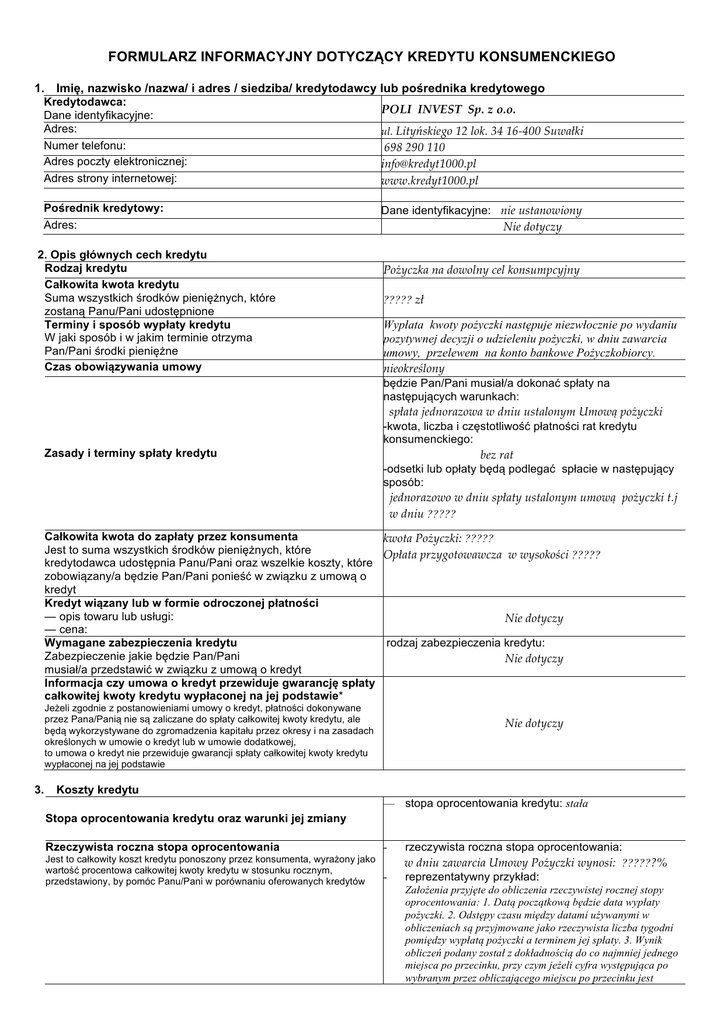 FORMULARZ INFORMACYJNY DOTYCZĄCY KREDYTU KONSUMENCKIEGO 1. Imię, nazwisko /nazwa/ i adres / siedziba/ kredytodawcy lub pośrednika kredytowego Kredytodawca: POLI INVEST Sp. z o.o. Dane identyfikacyjne: Adres: ul. Lityńskiego 12 lok. 34 16-‐‑400 Suwałki Numer telefonu: 698 290 110 Adres poczty elektronicznej: [email protected] Adres strony internetowej: www.kredyt1000.pl Pośrednik kredytowy: Adres: 2. Opis głównych cech kredytu Rodzaj kredytu Całkowita kwota kredytu Suma wszystkich środków pieniężnych, które zostaną Panu/Pani udostępnione Terminy i sposób wypłaty kredytu W jaki sposób i w jakim terminie otrzyma Pan/Pani środki pieniężne Czas obowiązywania umowy Zasady i terminy spłaty kredytu Dane identyfikacyjne: nie ustanowiony Nie dotyczy Pożyczka na dowolny cel konsumpcyjny ????? zł Wypłata kwoty pożyczki następuje niezwłocznie po wydaniu pozytywnej decyzji o udzieleniu pożyczki, w dniu zawarcia umowy, przelewem na konto bankowe Pożyczkobiorcy. nieokreślony będzie Pan/Pani musiał/a dokonać spłaty na następujących warunkach: spłata jednorazowa w dniu ustalonym Umową pożyczki -kwota, liczba i częstotliwość płatności rat kredytu konsumenckiego: bez rat -odsetki lub opłaty będą podlegać spłacie w następujący sposób: jednorazowo w dniu spłaty ustalonym umową pożyczki t.j w dniu ????? Całkowita kwota do zapłaty przez konsumenta kwota Pożyczki: ????? Jest to suma wszystkich środków pieniężnych, które Opłata przygotowawcza w wysokości ????? kredytodawca udostępnia Panu/Pani oraz wszelkie koszty, które zobowiązany/a będzie Pan/Pani ponieść w związku z umową o kredyt Kredyt wiązany lub w formie odroczonej płatności — opis towaru lub usługi: Nie dotyczy — cena: Wymagane zabezpieczenia kredytu rodzaj zabezpieczenia kredytu: Zabezpieczenie jakie będzie Pan/Pani Nie dotyczy musiał/a przedstawić w związku z umową o kredyt Informacja czy umowa o kredyt przewiduje gwarancję spłaty całkowitej kwoty kredytu wypłaconej na jej podstawie* Jeżeli zgodnie z postanowieniami umowy o kredyt, płatności dokonywane przez Pana/Panią nie są zaliczane do spłaty całkowitej kwoty kredytu, ale będą wykorzystywane do zgromadzenia kapitału przez okresy i na zasadach określonych w umowie o kredyt lub w umowie dodatkowej, to umowa o kredyt nie przewiduje gwarancji spłaty całkowitej kwoty kredytu wypłaconej na jej podstawie 3. Nie dotyczy Koszty kredytu — stopa oprocentowania kredytu: stała Stopa oprocentowania kredytu oraz warunki jej zmiany rzeczywista roczna stopa oprocentowania: Jest to całkowity koszt kredytu ponoszony przez konsumenta, wyrażony jako w dniu zawarcia Umowy Pożyczki wynosi: ??????% wartość procentowa całkowitej kwoty kredytu w stosunku rocznym, reprezentatywny przykład: przedstawiony, by pomóc Panu/Pani w porównaniu oferowanych kredytów Rzeczywista roczna stopa oprocentowania Założenia przyjęte do obliczenia rzeczywistej rocznej stopy oprocentowania: 1. Datą początkową będzie data wypłaty pożyczki. 2. Odstępy czasu między datami używanymi w obliczeniach są przyjmowane jako rzeczywista liczba tygodni pomiędzy wypłatą pożyczki a terminem jej spłaty. 3. Wynik obliczeń podany został z dokładnością do co najmniej jednego miejsca po przecinku, przy czym jeżeli cyfra występująca po wybranym przez obliczającego miejscu po przecinku jest mniejsza niż 5, cyfrę tę pomija się, gdy zaś jest większa albo równa 5, cyfrę poprzedzającą zwiększa się o 1. 4. Całkowita kwota pożyczki została wypłacone od razu i w całości w dniu zawarcia umowy pożyczki. — obowiązek zawarcia umowy dodatkowej, w szczególności umowy ubezpieczenia: Obowiązek zawarcia umowy dodatkowej Nie Do uzyskania kredytu konieczne jest zawarcie przez Pana/Panią umowy dodatkowej, w szczególności umowy ubezpieczenia lub rodzaj ubezpieczenia oraz jego koszt: innej umowy obowiązek skorzystania z usługi dodatkowej: Nie Opłata weryfikacyjna 1,00 zł, Koszt opłaty przygotowawczej wynosi: Koszty, które zobowiązany/a będzie Pan/Pani ponieść w związku z umową o kredyt Koszty prowadzenia jednego lub kilku rachunków w celu dokonywania wpłat i wypłat środków pieniężnych Koszty korzystania z kart kredytowych* Inne koszty, które konsument zobowiązany jest ponieść w związku z umową Warunki, na jakich koszty związane z umową o kredyt, mogą ulegać zmianie Opłaty notarialne pożyczka w udzielenie pożyczki na przedłużenie pożyczki o kwocie: okres: kolejne: 15 dni 30 dni 15 dni 30 dni 100,00 zł 20,00 zł -‐‑-‐‑-‐‑-‐‑-‐‑-‐‑-‐‑-‐‑-‐‑-‐‑-‐‑-‐‑-‐‑-‐‑-‐‑-‐‑-‐‑ 20,00 zł -‐‑-‐‑-‐‑-‐‑-‐‑-‐‑-‐‑-‐‑-‐‑-‐‑-‐‑-‐‑ 200,00 zł 40,00 zł -‐‑-‐‑-‐‑-‐‑-‐‑-‐‑-‐‑-‐‑-‐‑-‐‑-‐‑-‐‑-‐‑-‐‑-‐‑-‐‑-‐‑ 40,00 zł -‐‑-‐‑-‐‑-‐‑-‐‑-‐‑-‐‑-‐‑-‐‑-‐‑-‐‑-‐‑-‐‑ 300,00 zł 60,00 zł -‐‑-‐‑-‐‑-‐‑-‐‑-‐‑-‐‑-‐‑-‐‑-‐‑-‐‑-‐‑-‐‑-‐‑-‐‑-‐‑-‐‑ 60,00 zł -‐‑-‐‑-‐‑-‐‑-‐‑-‐‑-‐‑-‐‑-‐‑-‐‑-‐‑-‐‑-‐‑ 400,00 zł 80,00 zł 120,00 zł 80,00 zł 120,00 zł 500,00 zł 110,00 zł 155,00 zł 110,00 zł 155,00 zł 600,00 zł 130,00 zł 170,00 zł 130,00 zł 170,00 zł 700,00 zł 150,00 zł 200,00 zł 150,00 zł 200,00 zł 800,00 zł 170,00 zł 230,00 zł 170,00 zł 230,00 zł 900,00 zł 190,00 zł 260,00 zł 190,00 zł 260,00 zł 1000,00 zł 200,00 zł 280,00 zł 200,00 zł 280,00 zł Nie dotyczy Nie dotyczy Nie dotyczy Nie dotyczy Nie dotyczy -w przypadku braku lub opóźnienia płatności może Pan/Pani zostać obciążony/a następującymi opłatami: a/ odsetki w wysokości ????? zł dziennie Skutek braku płatności Skutki braku płatności mogą być dla Pana/Pani następujące: 4. I