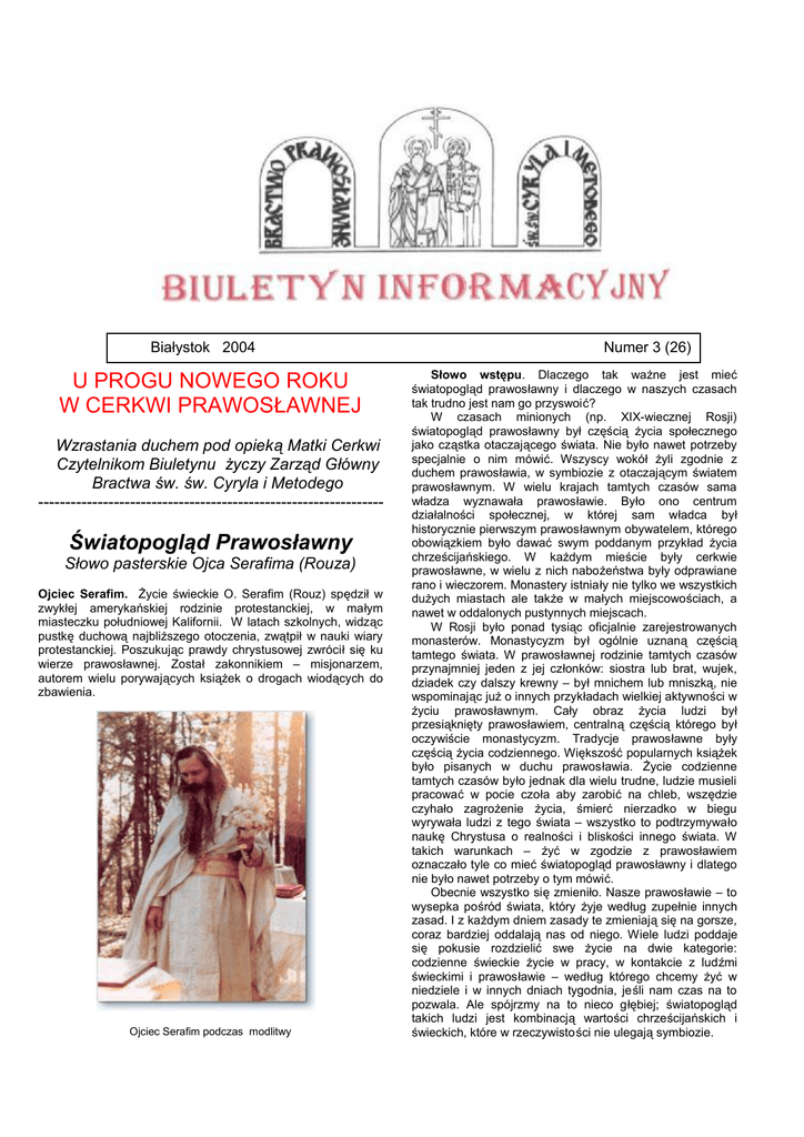 Białystok 2004 U PROGU NOWEGO ROKU W CERKWI PRAWOSŁAWNEJ Wzrastania duchem pod opieką Matki Cerkwi Czytelnikom Biuletynu życzy Zarząd Główny Bractwa św. św. Cyryla i Metodego ---------------------------------------------------------------- Światopogląd Prawosławny Słowo pasterskie Ojca Serafima (Rouza) Ojciec Serafim. Życie świeckie O. Serafim (Rouz) spędził w zwykłej amerykańskiej rodzinie protestanckiej, w małym miasteczku południowej Kalifornii. W latach szkolnych, widząc pustkę duchową najbliższego otoczenia, zwątpił w nauki wiary protestanckiej. Poszukując prawdy chrystusowej zwrócił się ku wierze prawosławnej. Został zakonnikiem – misjonarzem, autorem wielu porywających książek o drogach wiodących do zbawienia. Ojciec Serafim podczas modlitwy Numer 3 (26) Słowo wstępu. Dlaczego tak ważne jest mieć światopogląd prawosławny i dlaczego w naszych czasach tak trudno jest nam go przyswoić? W czasach minionych (np. XIX-wiecznej Rosji) światopogląd prawosławny był częścią życia społecznego jako cząstka otaczającego świata. Nie było nawet potrzeby specjalnie o nim mówić. Wszyscy wokół żyli zgodnie z duchem prawosławia, w symbiozie z otaczającym światem prawosławnym. W wielu krajach tamtych czasów sama władza wyznawała prawosławie. Było ono centrum działalności społecznej, w której sam władca był historycznie pierwszym prawosławnym obywatelem, którego obowiązkiem było dawać swym poddanym przykład życia chrześcijańskiego. W każdym mieście były cerkwie prawosławne, w wielu z nich nabożeństwa były odprawiane rano i wieczorem. Monastery istniały nie tylko we wszystkich dużych miastach ale także w małych miejscowościach, a nawet w oddalonych pustynnych miejscach. W Rosji było ponad tysiąc oficjalnie zarejestrowanych monasterów. Monastycyzm był ogólnie uznaną częścią tamtego świata. W prawosławnej rodzinie tamtych czasów przynajmniej jeden z jej członków: siostra lub brat, wujek, dziadek czy dalszy krewny – był mnichem lub mniszką, nie wspominając już o innych przykładach wielkiej aktywności w życiu prawosławnym. Cały obraz życia ludzi był przesiąknięty prawosławiem, centralną częścią którego był oczywiście monastycyzm. Tradycje prawosławne były częścią życia codziennego. Większość popularnych książek było pisanych w duchu prawosławia. Życie codzienne tamtych czasów było jednak dla wielu trudne, ludzie musieli pracować w pocie czoła aby zarobić na chleb, wszędzie czyhało zagrożenie życia, śmierć nierzadko w biegu wyrywała ludzi z tego świata – wszystko to podtrzymywało naukę Chrystusa o realności i bliskości innego świata. W takich warunkach – żyć w zgodzie z prawosławiem oznaczało tyle co mieć światopogląd prawosławny i dlatego nie było nawet potrzeby o tym mówić. Obecnie wszystko się zmieniło. Nasze prawosławie – to wysepka pośród świata, który żyje według zupełnie innych zasad. I z każdym dniem zasady te zmieniają się na gorsze, coraz bardziej oddalają nas od niego. Wiele ludzi poddaje się pokusie rozdzielić swe życie na dwie kategorie: codzienne świeckie życie w pracy, w kontakcie z ludźmi świeckimi i prawosławie – według którego chcemy żyć w niedziele i w innych dniach tygodnia, jeśli nam czas na to pozwala. Ale spójrzmy na to nieco głębiej; światopogląd takich ludzi jest kombinacją wartości chrześcijańskich i świeckich, które w rzeczywistości nie ulegają symbiozie. Prawosławie – to samo życie. Jeśli nie żyjemy w zgodzie z prawosławiem, to mówiąc po prostu – nie jesteśmy prawosławni, niezależnie od tego czy formalnie chcemy zaliczyć się do wyznania prawosławnego. Życie w naszym świecie współczesnym stało się bardzo udawane, nieokreślone, nawet zagmatwane. Prawosławie oczywiście ma swój własny obraz ale i ono też jest częścią tego świata i nie jest tak bardzo odległe od tego, co dziś nas otacza. I dlatego życie prawosławnego chrześcijanina, nawet jeśli jest on rzeczywiście prawosławny, też będzie w jakimś stopniu odbiciem otaczającego nas dzisiaj świata. Jakaś nieokreśloność, plątanina wkradły się obecnie nawet do życia prawosławnych. Spróbujemy spojrzeć na nasze życie codzienne, porównując je z życiem w pełni prawosławnym aby ocenić, jak moglibyśmy lepiej wypełniać nasze chrześcijańskie obowiązki i prowadzić życie „nie z tego świata” nawet w tych tak trudnych, jak dzisiaj, czasach. Aby umieć patrzeć na otaczający świat z punktu widzenia światopoglądu prawosławnego, który pozwoli nam w tych czasach przeżyć życie i zachować w pełni naszą wiarę. „wszechświat z tworzyw sztucznych” lub też świat fantastyki, w którym obecnie żyje tak wielka liczba ludzi, którzy nie są w stanie przystosować się do realności takiego świata w rozwiązywaniu swoich problemów. Kiedy pokolenie „Mnie” zwraca się ku religii, co miało nierzadko miejsce w ostatnich czasach to zwykle ma tu miejsce jakaś forma „z tworzywa sztucznego” lub inna fantastyczna forma religii: „religii samorozwoju” (gdzie obiektem oddawania czci pozostaje nasze „Ja”), kiedy dochodzi do czyszczenia mózgów i kontroli myśli, poszukiwania guru, UFO i istot pozaziemskich, nietypowych stanów ducha i doznań. Nie będziemy rozpatrywać tych zjawisk, o których większość z nas zapewne słyszała. Jedynie warto zaznaczyć na ile oddziałują one na prawosławne chrześcijańskie życie duchowe w naszych czasach. Kiedy próbujemy prowadzić dziś życie chrześcijańskie ważne jest, abyśmy uzmysłowili sobie, że cywilizacja, która stworzyła to nasze rozpieszczone życie stawia przed naszą duszą wymagania – czy to w aspekcie religijnym, czy też świeckim – które, przyznacie wszyscy – mają charakter totalitarny. Możemy o tym łatwo się przekonać obserwując tworzące się w ostatnich lat