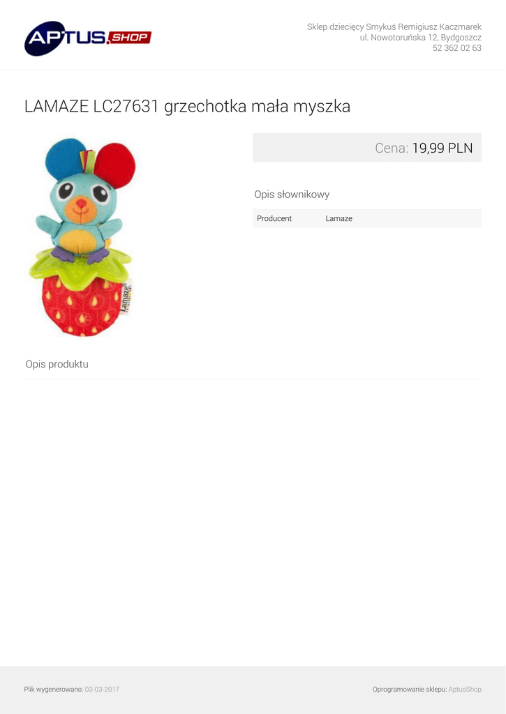 Sklep dziecięcy Smykuś Remigiusz Kaczmarek ul. Nowotoruńska 12, Bydgoszcz 52 362 02 63 LAMAZE LC27631 grzechotka mała myszka Cena: 19,99 PLN Opis słownikowy Producent Lamaze Opis produktu Plik wygenerowano: 03-03-2017 Powered by TCPDF (www.tcpdf.org) Oprogramowanie sklepu: AptusShop