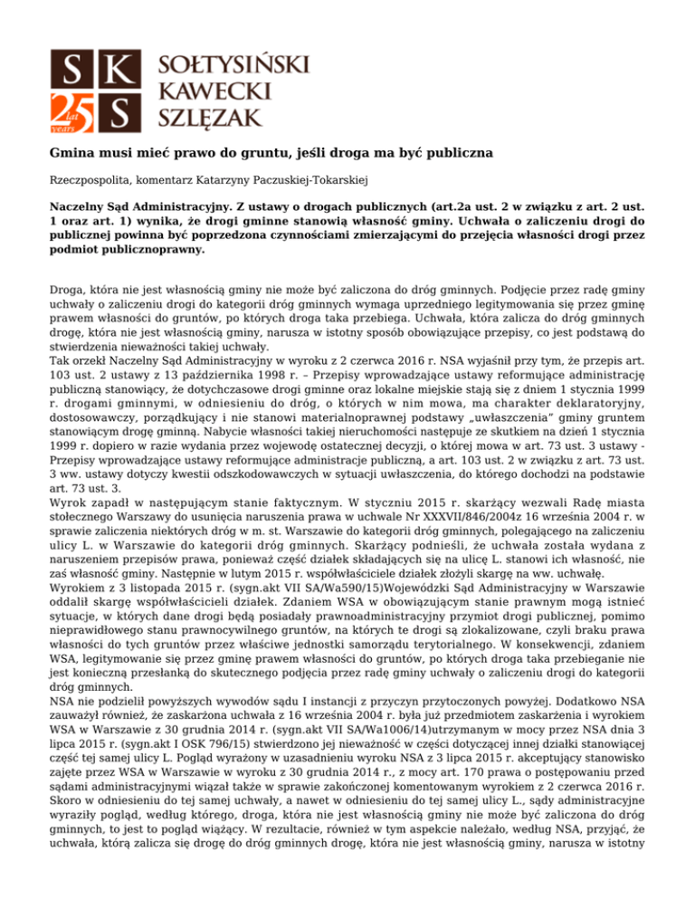 Gmina musi mieć prawo do gruntu, jeśli droga ma być publiczna Rzeczpospolita, komentarz Katarzyny Paczuskiej-Tokarskiej Naczelny Sąd Administracyjny. Z ustawy o drogach publicznych (art.2a ust. 2 w związku z art. 2 ust. 1 oraz art. 1) wynika, że drogi gminne stanowią własność gminy. Uchwała o zaliczeniu drogi do publicznej powinna być poprzedzona czynnościami zmierzającymi do przejęcia własności drogi przez podmiot publicznoprawny. Droga, która nie jest własnością gminy nie może być zaliczona do dróg gminnych. Podjęcie przez radę gminy uchwały o zaliczeniu drogi do kategorii dróg gminnych wymaga uprzedniego legitymowania się przez gminę prawem własności do gruntów, po których droga taka przebiega. Uchwała, która zalicza do dróg gminnych drogę, która nie jest własnością gminy, narusza w istotny sposób obowiązujące przepisy, co jest podstawą do stwierdzenia nieważności takiej uchwały. Tak orzekł Naczelny Sąd Administracyjny w wyroku z 2 czerwca 2016 r. NSA wyjaśnił przy tym, że przepis art. 103 ust. 2 ustawy z 13 października 1998 r. – Przepisy wprowadzające ustawy reformujące administrację publiczną stanowiący, że dotychczasowe drogi gminne oraz lokalne miejskie stają się z dniem 1 stycznia 1999 r. drogami gminnymi, w odniesieniu do dróg, o których w nim mowa, ma charakter deklaratoryjny, dostosowawczy, porządkujący i nie stanowi materialnoprawnej podstawy „uwłaszczenia” gminy gruntem stanowiącym drogę gminną. Nabycie własności takiej nieruchomości następuje ze skutkiem na dzień 1 stycznia 1999 r. dopiero w razie wydania przez wojewodę ostatecznej decyzji, o której mowa w art. 73 ust. 3 ustawy Przepisy wprowadzające ustawy reformujące administracje publiczną, a art. 103 ust. 2 w związku z art. 73 ust. 3 ww. ustawy dotyczy kwestii odszkodowawczych w sytuacji uwłaszczenia, do którego dochodzi na podstawie art. 73 ust. 3. Wyrok zapadł w następującym stanie faktycznym. W styczniu 2015 r. skarżący wezwali Radę miasta stołecznego Warszawy do usunięcia naruszenia prawa w uchwale Nr XXXVII/846/2004z 16 września 2004 r. w sprawie zaliczenia niektórych dróg w m. st. Warszawie do kategorii dróg gminnych, polegającego na zaliczeniu ulicy L. w Warszawie do kategorii dróg gminnych. Skarżący podnieśli, że uchwała została wydana z naruszeniem przepisów prawa, ponieważ część działek składających się na ulicę L. stanowi ich własność, nie zaś własność gminy. Następnie w lutym 2015 r. współwłaściciele działek złożyli skargę na ww. uchwałę. Wyrokiem z 3 listopada 2015 r. (sygn.akt VII SA/Wa590/15)Wojewódzki Sąd Administracyjny w Warszawie oddalił skargę współwłaścicieli działek. Zdaniem WSA w obowiązującym stanie prawnym mogą istnieć sytuacje, w których dane drogi będą posiadały prawnoadministracyjny przymiot drogi publicznej, pomimo nieprawidłowego stanu prawnocywilnego gruntów, na których te drogi są zlokalizowane, czyli braku prawa własności do tych gruntów przez właściwe jednostki samorządu terytorialnego. W konsekwencji, zdaniem WSA, legitymowanie się przez gminę prawem własności do gruntów, po których droga taka przebieganie nie jest konieczną przesłanką do skutecznego podjęcia przez radę gminy uchwały o zaliczeniu drogi do kategorii dróg gminnych. NSA nie podzielił powyższych wywodów sądu I instancji z przyczyn przytoczonych powyżej. Dodatkowo NSA zauważył również, że zaskarżona uchwała z 16 września 2004 r. była już przedmiotem zaskarżenia i wyrokiem WSA w Warszawie z 30 grudnia 2014 r. (sygn.akt VII SA/Wa1006/14)utrzymanym w mocy przez NSA dnia 3 lipca 2015 r. (sygn.akt I OSK 796/15) stwierdzono jej nieważność w części dotyczącej innej działki stanowiącej część tej samej ulicy L. Pogląd wyrażony w uzasadnieniu wyroku NSA z 3 lipca 2015 r. akceptujący stanowisko zajęte przez WSA w Warszawie w wyroku z 30 grudnia 2014 r., z mocy art. 170 prawa o postępowaniu przed sądami administracyjnymi wiązał także w sprawie zakończonej komentowanym wyrokiem z 2 czerwca 2016 r. Skoro w odniesieniu do tej samej uchwały, a nawet w odniesieniu do tej samej ulicy L., sądy administracyjne wyraziły pogląd, według którego, droga, która nie jest własnością gminy nie może być zaliczona do dróg gminnych, to jest to pogląd wiążący. W rezultacie, również w tym aspekcie należało, według NSA, przyjąć, że uchwała, którą zalicza się drogę do dróg gminnych drogę, która nie jest własnością gminy, narusza w istotny sposób art. 7 ust. 1 i 2 ustawy o drogach publicznych. Wyrok NSA z 2 czerwca 2016 r. sygn. akt I OSK 179/16 Komentarz Katarzyna Paczuska-Tokarska adwokat, kancelaria Sołtysiński Kawecki & Szlęzak Orzeczenie koresponduje z utrwalonym w orzecznictwie sądowoadministracyjnym poglądem, według którego z przepisów ustawy o drogach publicznych wynika, że uchwała o zaliczeniu drogi do drogi publicznej (gminnej)powinna być poprzedzona czynnościami zmierzającymi do przejęcia własności drogi przez podmiot publicznoprawny, a nie odwrotnie (por.np. wyrok NSA z 28 maja 2009 r.; sygn. akt: I OSK 148/09, 29 lutego 2012 r., sygn.. II OSK 2441/10,3 lipca 2015 r.; sygn. akt I OSK 796/15). Jest to pogląd słuszny. Postępowanie w sprawie zaliczania dróg do kategorii dróg publicznych gminnych reguluje ustawa z 21 marca 1985 r. o drogach publicznych. Zgodnie z tą ustawą do dróg gminnych można zaliczyć drogę, która spełnia prawne warunki uznania za drogę gminną, a zaliczenie następuje na podstawie uchwały rady gminy po zasięgnięciu opinii właściwego zarządu powiatu (por.art. 7 ust. 1 i 2). Przede wszystkim jednak, zgodnie z art. 1 ustawy o drogach publicznych drogą publiczną jest droga zaliczona na podstawie tej ustawy do jednej z kategorii dróg, z której może korzystać każdy, zgodnie z jej przeznaczeniem, z ograniczeniami i wyjątkami określonymi w ustawie