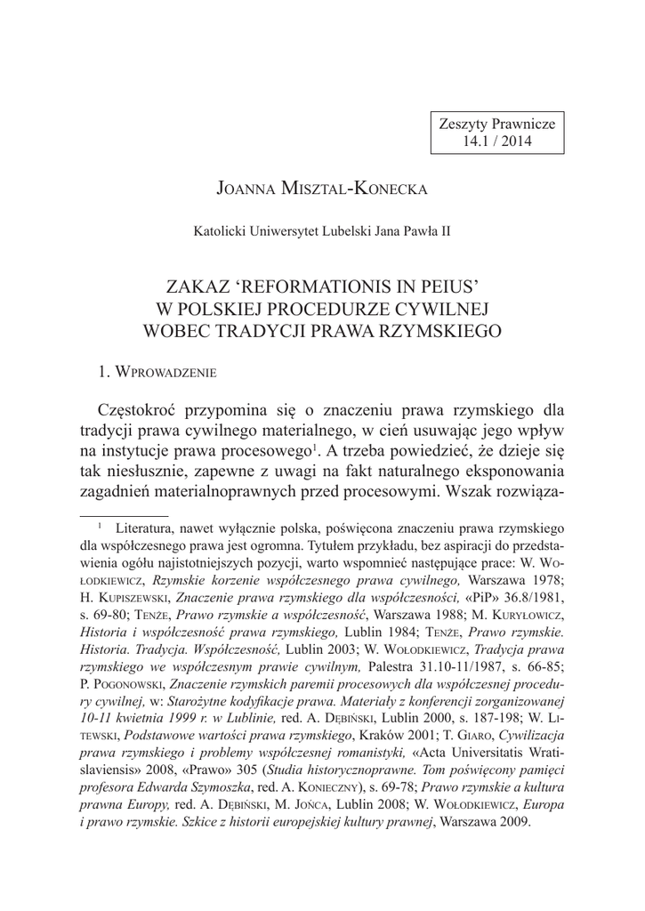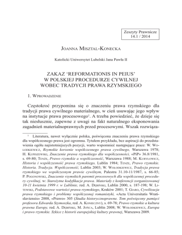 Zeszyty Prawnicze 14.1 / 2014 Joanna Misztal-Konecka Katolicki Uniwersytet Lubelski Jana Pawła II Zakaz ‘reformationis in peius’ w polskiej procedurze cywilnej wobec tradycji prawa rzymskiego 1. Wprowadzenie Częstokroć przypomina się o znaczeniu prawa rzymskiego dla tradycji prawa cywilnego materialnego, w cień usuwając jego wpływ na instytucje prawa procesowego1. A trzeba powiedzieć, że dzieje się tak niesłusznie, zapewne z uwagi na fakt naturalnego eksponowania zagadnień materialnoprawnych przed procesowymi. Wszak rozwiąza1 Literatura, nawet wyłącznie polska, poświęcona znaczeniu prawa rzymskiego dla współczesnego prawa jest ogromna. Tytułem przykładu, bez aspiracji do przedstawienia ogółu najistotniejszych pozycji, warto wspomnieć następujące prace: W. Wołodkiewicz, Rzymskie korzenie współczesnego prawa cywilnego, Warszawa 1978; H. Kupiszewski, Znaczenie prawa rzymskiego dla współczesności, «PiP» 36.8/1981, s. 69-80; Tenże, Prawo rzymskie a współczesność, Warszawa 1988; M. Kuryłowicz, Historia i współczesność prawa rzymskiego, Lublin 1984; Tenże, Prawo rzymskie. Historia. Tradycja. Współczesność, Lublin 2003; W. Wołodkiewicz, Tradycja prawa rzymskiego we współczesnym prawie cywilnym, Palestra 31.10-11/1987, s. 66-85; P. Pogonowski, Znaczenie rzymskich paremii procesowych dla współczesnej procedury cywilnej, w: Starożytne kodyfikacje prawa. Materiały z konferencji zorganizowanej 10-11 kwietnia 1999 r. w Lublinie, red. A. Dębiński, Lublin 2000, s. 187-198; W. Litewski, Podstawowe wartości prawa rzymskiego, Kraków 2001; T. Giaro, Cywilizacja prawa rzymskiego i problemy współczesnej romanistyki, «Acta Universitatis Wratislaviensis» 2008, «Prawo» 305 (Studia historycznoprawne. Tom poświęcony pamięci profesora Edwarda Szymoszka, red. A. Konieczny), s. 69-78; Prawo rzymskie a kultura prawna Europy, red. A. Dębiński, M. Jońca, Lublin 2008; W. Wołodkiewicz, Europa i prawo rzymskie. Szkice z historii europejskiej kultury prawnej, Warszawa 2009. 96 Joanna Misztal-Konecka [2] nia przyjęte w rzymskim procesie cywilnym rządzą z mniejszymi lub większymi odchyleniami wszystkimi modelami postępowania cywilnego nie tylko w Europie, ale także poza nią2. Jak słusznie zauważył H. Kupiszewski, jednym z dowodów żywotności prawa rzymskiego są maksymy (maximae, regulae, definitiones iuris), które wciela w życie współczesny ustawodawca i które bardzo często pojawiają się w wypowiedziach sędziów i stron procesowych3. Jednym z najbardziej oczywistych dowodów zakresu oddziaływania prawa rzymskiego i łaciny na polskie prawo procesowe cywilne jest ilość paremii odnoszących się ściśle do uregulowań formalnoprawnych, umieszczonych na kolumnach gmachu Sądu Najwyższego4. Warto je zatem wymienić: 1. Non omnis vox iudicis iudicati continet auctoritatem (C.7,45,7 pr.) – Nie każda wypowiedź sędziego ma moc wyroku (kolumna 13); 2. Advocatorum error litigatoribus non noceat (C.2,9,3 pr.) – Błąd adwokatów niech nie szkodzi stronom (kolumna 14); 3. Nemo enim in persequendo deteriorem causam, sed meliorem facit (D.50,17,87) – Dochodzenie sprawy przed sądem nie może pogorszyć, lecz jedynie polepszyć sytuację powoda (kolumna 20); 4. Reformatio in peius iudici appellato non licet (ad D.49,1,1 pr.) – Sędziemu apelacyjnemu nie wolno zmieniać wyroku na niekorzyść odwołującego się (kolumna 26); P. Pogonowski, Znaczenie ..., s. 188. H. Kupiszewski, Prawo rzymskie ..., s. 113. Na ten temat por. także D. Nörr, Spruchregel und Generalisierung, ZSS 89(1972), s. 18-93; W. Wołodkiewicz, Łacińskie paremie prawnicze w polskiej praktyce prawnej, [w:] Europa i prawo rzymskie. Szkice z historii europejskiej kultury prawnej, Warszawa 2009, s. 368-390, w tej pracy również szereg wskazówek bibliograficznych w zakresie badań nad znaczeniem rzymskich paremii, reguł i definicji. 4 Warto odnotować wzrost zainteresowania wpływem prawa rzymskiego na współczesne polskie prawo procesowe; por. np. K. Amielańczyk, J. Zawrot, ‘Nemo iudex in causa sua’. Wyłączenie sędziego w polskim postępowaniu cywilnym, «Gdańskie Studia Prawnicze» 26/2011, s. 61-77. 2 3 [3] Zakaz ‘reformationis in peius’ w polskiej procedurze cywilnej 97 5. Res iudicata pro veritate accipitur (D.50,17,207) – Rozstrzygnięcie sądowe przyjmuje się za prawdziwe (kolumna 45); 6. Nemo est iudex in propria causa (ad C.3,5,1) – Nikt nie może być sędzią we własnej sprawie (kolumna 66); 7. Reus in exceptione actor est (D. 44,1,1) – Pozwany w zakresie zarzutu procesowego staje się powodem (kolumna 72); 8. Ne eat iudex ultra petita partium (ad D.10,3,18) – Niech nie wychodzi sędzia ponad żądania stron (kolumna 74); 9. Nullus idoneus testis in re sua intellegitur (D.22,5,10) – Nikt nie może być wiarygodnym świadkiem we własnej sprawie (kolumna 75); 10. Sententia facit ius inter partes (ad D.5,2,17,1) – Wyrok tworzy prawo między stronami (kolumna 78); 11. Ei incumbit probatio qui dicit non qui negat (D.22,3,2) – Ciężar dowodu spoczywa na tym, kto twierdzi, a nie na tym, kto przeczy (kolumna 79); 12. Bis de eadem re ne sit actio (ad Gaium 4,107) – Nie można procesować się dwa razy o to samo (kolumna 80); 13. Actor rei forum sequitur (C.3,19,3) – Powód idzie do sądu (właściwego dla) pozwanego (kolumna 81); 14. Si in ius vocat, ito (Ustawa XII tablic) – Kto został wezwany przed sąd, niech się stawi (kolumna 83); 15. Favorabiliores rei potius quam actores habentur (D.50,17,125) – Korzystniejszą [sytuację procesową] mają pozwani niż powodowie (kolumna 86)5. K. Amielańczyk (U podstaw prawa prywatnego. „Rzymski proces cywilny” i jego zasady. Uwagi na marginesie podręcznika prawa rzymskiego W. Dajczaka, T. Giaro i F. Longchampsa de Bérier, «Gdańskie Studia Prawnicze» 24/2010, s. 162) wskazuje, że więcej paremii umieszczonych na gmachu Sądu Najwyższego jest ściśle związanych z
