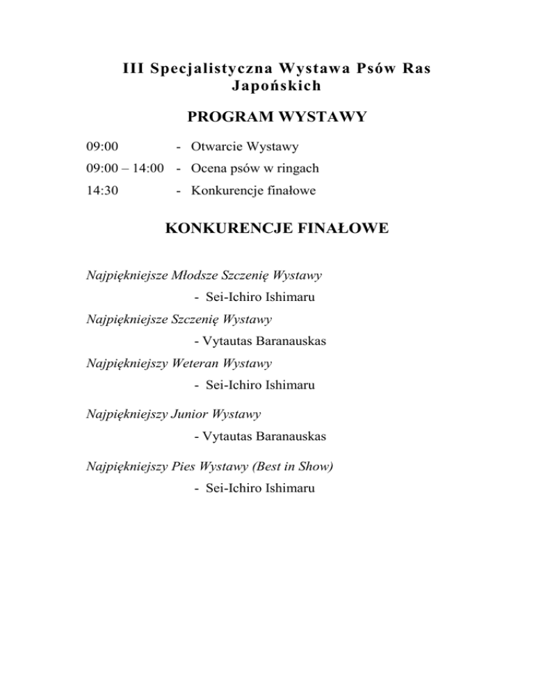 III Specjalistyczna Wystawa Psów Ras Japońskich PROGRAM WYSTAWY 09:00 - Otwarcie Wystawy 09:00 – 14:00 - Ocena psów w ringach 14:30 - Konkurencje finałowe KONKURENCJE FINAŁOWE Najpiękniejsze Młodsze Szczenię Wystawy - Sei-Ichiro Ishimaru Najpiękniejsze Szczenię Wystawy - Vytautas Baranauskas Najpiękniejszy Weteran Wystawy - Sei-Ichiro Ishimaru Najpiękniejszy Junior Wystawy - Vytautas Baranauskas Najpiękniejszy Pies Wystawy (Best in Show) - Sei-Ichiro Ishimaru