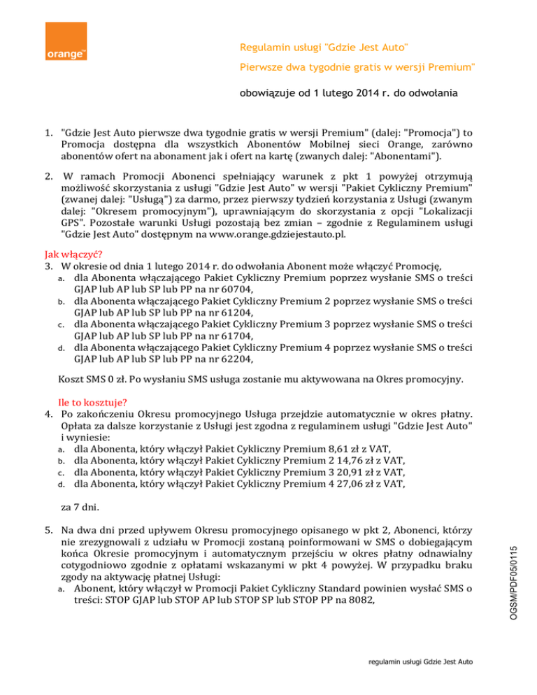 Regulamin usługi "Gdzie Jest Auto" Pierwsze dwa tygodnie gratis w wersji Premium" obowiązuje od 1 lutego 2014 r. do odwołania 1. "Gdzie Jest Auto pierwsze dwa tygodnie gratis w wersji Premium" (dalej: "Promocja") to Promocja dostępna dla wszystkich Abonentów Mobilnej sieci Orange, zarówno abonentów ofert na abonament jak i ofert na kartę (zwanych dalej: "Abonentami"). 2. W ramach Promocji Abonenci spełniający warunek z pkt 1 powyżej otrzymują możliwość skorzystania z usługi "Gdzie Jest Auto" w wersji "Pakiet Cykliczny Premium" (zwanej dalej: "Usługą") za darmo, przez pierwszy tydzień korzystania z Usługi (zwanym dalej: "Okresem promocyjnym"), uprawniającym do skorzystania z opcji "Lokalizacji GPS". Pozostałe warunki Usługi pozostają bez zmian – zgodnie z Regulaminem usługi "Gdzie Jest Auto" dostępnym na www.orange.gdziejestauto.pl. Jak włączyć? 3. W okresie od dnia 1 lutego 2014 r. do odwołania Abonent może włączyć Promocję, a. dla Abonenta włączającego Pakiet Cykliczny Premium poprzez wysłanie SMS o treści GJAP lub AP lub SP lub PP na nr 60704, b. dla Abonenta włączającego Pakiet Cykliczny Premium 2 poprzez wysłanie SMS o treści GJAP lub AP lub SP lub PP na nr 61204, c. dla Abonenta włączającego Pakiet Cykliczny Premium 3 poprzez wysłanie SMS o treści GJAP lub AP lub SP lub PP na nr 61704, d. dla Abonenta włączającego Pakiet Cykliczny Premium 4 poprzez wysłanie SMS o treści GJAP lub AP lub SP lub PP na nr 62204, Koszt SMS 0 zł. Po wysłaniu SMS usługa zostanie mu aktywowana na Okres promocyjny. Ile to kosztuje? 4. Po zakończeniu Okresu promocyjnego Usługa przejdzie automatycznie w okres płatny. Opłata za dalsze korzystanie z Usługi jest zgodna z regulaminem usługi "Gdzie Jest Auto" i wyniesie: a. dla Abonenta, który włączył Pakiet Cykliczny Premium 8,61 zł z VAT, b. dla Abonenta, który włączył Pakiet Cykliczny Premium 2 14,76 zł z VAT, c. dla Abonenta, który włączył Pakiet Cykliczny Premium 3 20,91 zł z VAT, d. dla Abonenta, który włączył Pakiet Cykliczny Premium 4 27,06 zł z VAT, 5. Na dwa dni przed upływem Okresu promocyjnego opisanego w pkt 2, Abonenci, którzy nie zrezygnowali z udziału w Promocji zostaną poinformowani w SMS o dobiegającym końca Okresie promocyjnym i automatycznym przejściu w okres płatny odnawialny cotygodniowo zgodnie z opłatami wskazanymi w pkt 4 powyżej. W przypadku braku zgody na aktywację płatnej Usługi: a. Abonent, który włączył w Promocji Pakiet Cykliczny Standard powinien wysłać SMS o treści: STOP GJAP lub STOP AP lub STOP SP lub STOP PP na 8082, regulamin usługi Gdzie Jest Auto OGSM/PDF05/0115 za 7 dni. b. c. d. Abonent, który włączył w Promocji Pakiet Cykliczny Standard 2 powinien wysłać SMS o treści: STOP GJAP lub STOP AP lub STOP SP lub STOP PP na 8082, Abonent, który włączył w Promocji Pakiet Cykliczny Standard 3 powinien wysłać SMS o treści: STOP GJAP lub STOP AP lub STOP SP lub STOP PP na 8082 Abonent, który włączył w Promocji Pakiet Cykliczny Standard 4 powinien wysłać SMS o treści: STOP GJAP lub STOP AP lub STOP SP lub STOP PP na 8082. Koszt SMS 0 zł. 6. W dniu automatycznego płatnego przedłużenia Usługi po upływie Okresu promocyjnego zgodnie z pkt 4 powyżej, Abonenci, którzy nie wysłali SMS z rezygnacją z uczestnictwa w Promocji, zgodnie z pkt 5 niniejszego Regulaminu, zostaną poinformowani w SMS-ie o aktywacji wersji płatnej usługi "Gdzie Jest Auto" oraz o sposobie rezygnacji z Usługi. Rezygnacja z Usługi jest bezpłatna. Jak wyłączyć? 7. Abonenci, którym Usługa zostanie włączona mogą w każdej chwili z niej zrezygnować wysyłając SMS o treści zgodnej z pkt 5 powyżej. 8. Usługa jest wyłączana wszystkim Abonentom, którzy wyślą SMS zgodnie z pkt 5. 9. Usługa zostanie aktywowana na Okres promocyjny tylko raz dla pierwszego włączanego pakietu. 10. Promocja może być w każdym czasie zmieniona lub odwołana, co nie powoduje utraty lub zmiany korzyści przyznanych Abonentom przed wprowadzeniem zmiany lub odwołaniem Promocji. 11. Operator zastrzega sobie prawo do zakończenia świadczenia Promocji w każdym czasie bez podania przyczyny. W przypadku zakończenia świadczenia Promocji, Abonent, który skorzystał z Promocji jeszcze przed jej zakończeniem może kontynuować korzystanie z Promocji do wyczerpania przyznanego lokalizacji bądź zakończenia Okresu promocyjnego. OGSM/PDF25/1213 12. Mobilna Sieć Orange – ruchoma publiczna sieć telekomunikacyjna wykorzystująca między innymi takie standardy jak GSM 900/1800 lub UMTS, obsługiwana przez Orange Polska Spółkę Akcyjną z siedzibą i adresem w Warszawie (02-326) przy Al. Jerozolimskich 160, wpisaną do Rejestru Przedsiębiorców prowadzonego przez Sąd Rejonowy dla m.st. Warszawy Regulamin promocji usługi "Gdzie Jest Auto" Pierwsze dwa tygodnie gratis w wersji "Premium"
