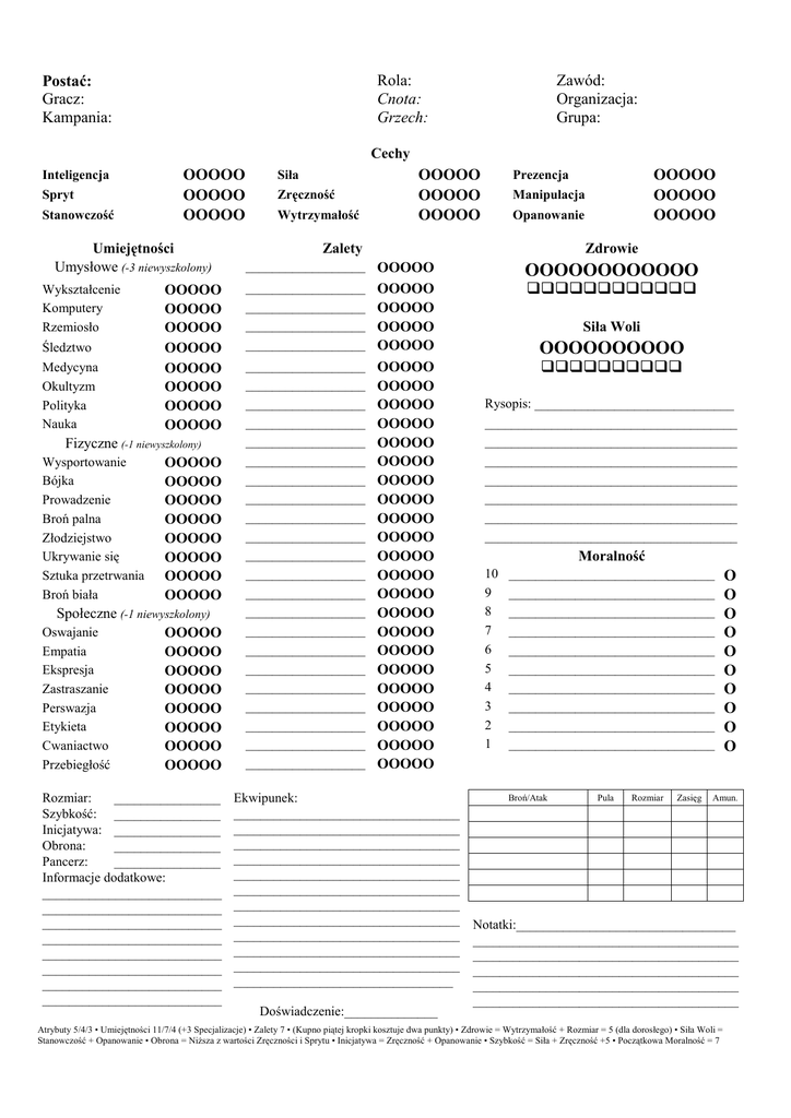 Rola: Cnota: Grzech: Postać: Gracz: Kampania: Zawód: Organizacja: Grupa: Cechy Inteligencja Spryt Stanowczość OOOOO OOOOO OOOOO Umiejętności Umysłowe (-3 niewyszkolony) Wykształcenie Komputery Rzemiosło Śledztwo Medycyna Okultyzm Polityka Nauka OOOOO OOOOO OOOOO OOOOO OOOOO OOOOO OOOOO OOOOO Fizyczne (-1 niewyszkolony) OOOOO OOOOO OOOOO OOOOO OOOOO OOOOO OOOOO OOOOO Społeczne (-1 niewyszkolony) Oswajanie OOOOO Empatia OOOOO Ekspresja OOOOO Zastraszanie OOOOO Perswazja OOOOO Etykieta OOOOO Cwaniactwo OOOOO Przebiegłość OOOOO Wysportowanie Bójka Prowadzenie Broń palna Złodziejstwo Ukrywanie się Sztuka przetrwania Broń biała Rozmiar: ________________ Szybkość: ________________ Inicjatywa: ________________ Obrona: ________________ Pancerz: ________________ Informacje dodatkowe: ___________________________ ___________________________ ___________________________ ___________________________ ___________________________ ___________________________ ___________________________ ___________________________ Siła Zręczność Wytrzymałość OOOOO OOOOO OOOOO OOOOO OOOOO OOOOO Prezencja Manipulacja Opanowanie Zalety Zdrowie __________________ OOOOO __________________ OOOOO __________________ OOOOO __________________ OOOOO __________________ OOOOO OOOOOOOOOOOO __________________ __________________ __________________ __________________ __________________ __________________ __________________ __________________ __________________ __________________ __________________ __________________ __________________ __________________ __________________ __________________ __________________ __________________ __________________ __________________ __________________ __________________ OOOOO OOOOO OOOOO OOOOO OOOOO OOOOO OOOOO OOOOO OOOOO OOOOO OOOOO OOOOO OOOOO OOOOO OOOOO OOOOO OOOOO OOOOO OOOOO OOOOO OOOOO OOOOO Ekwipunek: __________________________________ __________________________________ __________________________________ __________________________________ __________________________________ __________________________________ __________________________________ __________________________________ __________________________________ __________________________________ __________________________________ _________________________________ Doświadczenie:______________ qqqqqqqqqqqq Siła Woli OOOOOOOOOO qqqqqqqqqq Rysopis: ______________________________ ______________________________________ ______________________________________ ______________________________________ ______________________________________ ______________________________________ ______________________________________ ______________________________________ Moralność 10 9 8 7 6 5 4 3 2 1 _______________________________ _______________________________ _______________________________ _______________________________ _______________________________ _______________________________ _______________________________ _______________________________ _______________________________ _______________________________ Broń/Atak Pula Rozmiar Zasięg O O O O O O O O O O Amun. Notatki:_________________________________ ________________________________________ ________________________________________ ________________________________________ ________________________________________ ________________________________________ Atrybuty 5/4/3 • Umiejętności 11/7/4 (+3 Specjalizacje) • Zalety 7 • (Kupno piątej kropki kosztuje dwa punkty) • Zdrowie = Wytrzymałość + Rozmiar = 5 (dla dorosłego) • Siła Woli = Stanowczość + Opanowanie • Obrona = Niższa z wartości Zręczności i Sprytu • Inicjatywa = Zręczność + Opanowanie • Szybkość = Siła + Zręczność +5 • Początkowa Moralność = 7