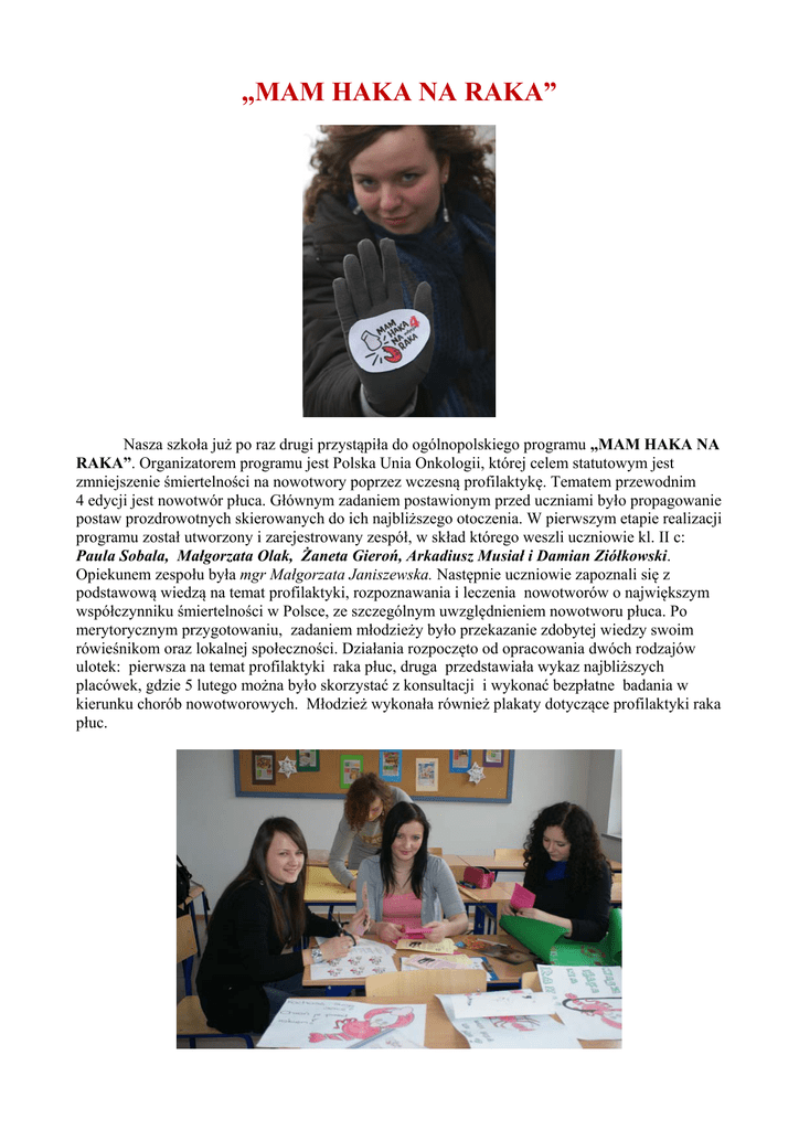 „MAM HAKA NA RAKA” Nasza szkoła już po raz drugi przystąpiła do ogólnopolskiego programu „MAM HAKA NA RAKA”. Organizatorem programu jest Polska Unia Onkologii, której celem statutowym jest zmniejszenie śmiertelności na nowotwory poprzez wczesną profilaktykę. Tematem przewodnim 4 edycji jest nowotwór płuca. Głównym zadaniem postawionym przed uczniami było propagowanie postaw prozdrowotnych skierowanych do ich najbliższego otoczenia. W pierwszym etapie realizacji programu został utworzony i zarejestrowany zespół, w skład którego weszli uczniowie kl. II c: Paula Sobala, Małgorzata Olak, Żaneta Gieroń, Arkadiusz Musiał i Damian Ziółkowski. Opiekunem zespołu była mgr Małgorzata Janiszewska. Następnie uczniowie zapoznali się z podstawową wiedzą na temat profilaktyki, rozpoznawania i leczenia nowotworów o największym współczynniku śmiertelności w Polsce, ze szczególnym uwzględnieniem nowotworu płuca. Po merytorycznym przygotowaniu, zadaniem młodzieży było przekazanie zdobytej wiedzy swoim rówieśnikom oraz lokalnej społeczności. Działania rozpoczęto od opracowania dwóch rodzajów ulotek: pierwsza na temat profilaktyki raka płuc, druga przedstawiała wykaz najbliższych placówek, gdzie 5 lutego można było skorzystać z konsultacji i wykonać bezpłatne badania w kierunku chorób nowotworowych. Młodzież wykonała również plakaty dotyczące profilaktyki raka płuc. W dniu 4 lutego 2011r. w ramach obchodów Międzynarodowego Dnia Walki z Rakiem uczniowie przygotowali „Dzień Hakowicza”, który odbył się w formie happeningu zorganizowanego w centrum miasta. Podczas akcji uczniowie rozdawali ulotki i materiały edukacyjno - informacyjne oraz zaproszenia na prezentację multimedialną, dotyczącą profilaktyki raka płuc. Podczas tych lokalnych działań zbierano również podpisy, na specjalnych formularzach, na znak poparcia wprowadzenia edukacji onkologicznej do programu szkół średnich. Aby dobrze przekazać wiedzę uczniowie przygotowali ciekawą prezentację multimedialną, na temat przyczyn, objawów, sposobów leczenia, a przede wszystkim profilaktyki raka płuc. W prezentacji przedstawiono dane statystyczne, wykresy, zdjęcia oraz ciekawą, nieco zabawną „historię palacza”, która w szczególności przypadła do gustu młodszym odbiorcom. Prezentacja ta została przedstawiona w dniu 8 lutego w ZSP, a w dniu 15 lutego w Zespołach Szkół – Gimnazjum nr 1 oraz Gimnazjum nr 2. W ramach programu młodzież zorganizowała również zbiórkę maskotek dla dzieci chorujących na nowotwór, by umilić im czas spędzany w szpitalu. Mieszkańcy Koniecpola i okolic bardzo chętnie przyłączyli się do zbiórki maskotek, której efektem było zebranie dużej ilości pluszaków. Maskotki zostały przekazane dla dzieci przebywających: - w Świętokrzyskim Centrum Onkologii w Kielcach, - na Oddziale Hematologii i Onkologii Dziecięcej Samodzielnego Publicznego Szpitala Klinicznego w Zabrzu, - w Zespole Opieki Paliatywnej „PALIUM” w Częstochowie. Wiele osób i instytucji przyłączyło się i wspierało nasze działania, za co serdecznie dziękujemy. Szczególne podziękowanie pragniemy przekazać dla: - lek. med. Jarosława Rydzek, Przewodniczącego Rady Powiatu w Częstochowie - za pomoc w akcji i dostarczenie zebranych maskotek na dziecięce oddziały onkologiczne, - księdza dziekana Kazimierza Bogdała i księdza Mieczysława Robaka i za przekazanie informacji o zbiórce maskotek podczas ogłoszeń parafialnych, - Zespołu Szkół Gimnazjum nr 1, Zespołu Szkół Gimnazjum nr 2 za przyłączenie się do zbiórki maskotek, - państwa Sikorów, właścicieli sklepu „Kaprys” za przekazanie dużej ilości nowych i wartościowych maskotek oraz pomoc w akcji, - sklepu „Galeria drobiazgów” i „Prezentomania” - za podarowanie nowych maskotek. Dziękujemy również wszystkim mieszkańcom Koniecpola i okolic za przyłączenie się do naszej akcji! Mamy nadzieję, że dzięki realizowanym działaniom, młodzi ludzie wpłynęli na nastawienie lokalnej społeczności wobec chorób nowotworowych i sprawili, że mieszkańcy Koniecpola będą zapobiegać nowotworom poprzez odpowiednią profilaktykę.