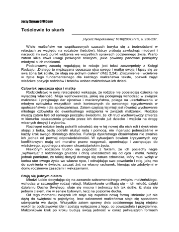 Jerzy Szyran OFMConv Teściowie to skarb „Rycerz Niepokalanej” 1616(2007) nr 9, s. 236-237. Wiele małżeństw we współczesnych czasach boryka się z trudnościami w relacjach ze względu na rodziców (teściów), którzy próbują zawładnąć młodymi i narzucić im swój punkt widzenia we wszystkich sprawach codziennego życia. Warto zatem kilka chwil uwagi poświęcić relacjom, jakie powinny panować pomiędzy młodymi a ich rodzicami. Podstawową zasadą regulującą te relacje jest tekst zaczerpnięty z Księgi Rodzaju: „Dlatego to mężczyzna opuszcza ojca swego i matkę swoją i łączy się ze swą żoną tak ściśle, że stają się jednym ciałem” (Rdz 2,24). Zrozumienie i wcielenie w życie tego fundamentalnego dla każdego małżeństwa tekstu, pozwoli zająć właściwe pozycje rodziców i teściów wobec małżeństwa ich dzieci. Człowiek opuszcza ojca i matkę Rodzicielstwo w swej relacyjności wskazuje, że rodzice nie poosiadają dziecka na wyłączną własność. Misja wychowawcza, jakiej się podejmują wchodząc w związek małżeński i przyjmując dar ojcostwa i macierzyństwa, polega na ukształtowaniu w młodym człowieku wszystkich cech koniecznych do owocnego egzystowania w społeczeństwie i dla społeczeństwa. Zatem częścią tej misji jest również wychowanie młodego człowieka do ewentualnego wstąpienia w związek małżeński. Rodzice muszą zatem być od samego początku świadomi, że ich trud wychowawczy zmierza w kierunku opuszczenia gniazda przez ich dorosłe już dziecko i wejścia na drogę własnych decyzji i wyborów. Roztropni rodzice będą potrafili odnaleźć się w tej nowej dla nich roli i dyskretnie stojąc z boku, będą potrafili służyć radą i pomocą, nie ingerując jednocześnie w każdy krok swego dorosłego dziecka. Funkcja dyskretnego obserwatora nie zwalnia ich jednak od pewnej odpowiedzialności. W sytuacjach bowiem kryzysowych czy konfliktowych mają oni moralne prawo reagować, upominając i zachęcając do właściwego, zgodnego z etosem chrześcijańskim życia. Niektórym rodzicom trudno się pogodzić z faktem, ze ich pociechy nagle „wyfruwają” z rodzinnego gniazda i chcą uniezależnić się od ojca i matki. Należy jednak pamiętać, że takiej decyzji domaga się natura człowieka, który musi wziąć w końcu ster swego życia we własne ręce, i odnajdując swe powołanie i rolę, jaką ma do spełnienia w świecie, zacząć żyć na własny rachunek, kierując się zdobytymi w domu rodzinnym zasadami i wskazaniami. Stają się jednym ciałem Młodzi ludzie decydując się na zawarcie sakramentalnego związku małżeńskiego, wchodzą w szczególny rodzaj relacji. Małżonkowie unifikują się – ich miłość, dzięki działaniu Ducha Świętego, staje się mocna i jednoczy ich tak ściśle, iż stają się jednym ciałem, nie w sensie bytowym, lecz na poziomie ducha. Od tego momentu związek ich staje się zupełnie nową formą istnienia: już nie dążą do świętości w pojedynkę, lecz sakrament małżeństwa staje się sposobem uświęcania we dwoje. Wszystkie zatem sprawy dnia codziennego krążą niejako wokół tej podstawowej idei i zostają wyłączone z tego, co powszednia i przyziemne. Małżonkowie krok po kroku budują swoją jedność w coraz pełniejszych formach wyrazu i coraz ściślej jednoczą się w swojej miłości z Bogiem, który jest ich nadrzędnym celem. Teściowie obok małżeństwa Z przeprowadzonych powyżej analiz można wysunąć podstawowy wniosek dla relacji pomiędzy małżonkami a ich teściami: w związku małżeńskim pierwszeństwo ma mąż i żona. Rodzica zaś schodzą na drugi plan, choć nadal względem nich obowiązuje przykazanie miłości i szacunku. Małżonkowie oddani sobie w ścisłej jedności dusz są zobowiązani do troski wobec rodziców i teściów, lecz ci nie mogą w jakikolwiek sposób zawłaszczać syna czy córki żyjącej w związku małżeńskim, ani tym bardziej wchodzić pomiędzy małżonków. Rolę rodziców i teściów można zatem określić jako funkcję pomocniczą wobec młodego małżeństwa, która powinna polegać na cichej obecności obok małżonków, gotowości pomocy, służenia radą czy wskazówkami. Wszystko to jednak uzależnione jest od decyzji samych małżonków, którzy mają prawo sami decydować o własnym życiu. * * * Rodzice i teściowie bogaci w doświadczenie mogą stać się dla młodego małżeństwa nieodzowną pomocą. Ich rola jednak nie może być sprowadzona do nieustannej ingerencji w wewnętrzne sprawy młodej rodziny, która ma pełne prawo żyć swoim życiem niezależnie od rodziców i teściów.