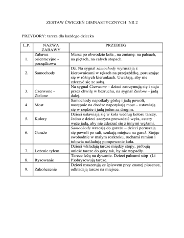 ZESTAW ĆWICZEŃ GIMNASTYCZNYCH NR 2 PRZYBORY: tarcza dla każdego dziecka L.P. 1. NAZWA ZABAWY Zabawa orientacyjno porządkowa 2. Samochody 3. Czerwone Zielone 4. Most 5. Kolory 6. Garaże 7. Leżenie tyłem 8. Rysowanie 9. Zakończenie PRZEBIEG Marsz po obwodzie koła , na zmianę: na palcach, na piętach, na całych stopach. Dz. Na sygnał samochody wyruszają z kierownicami w rękach na przejażdżkę, poruszając się w różnych kierunkach. Uważają, aby nie zderzyć się ze sobą. Na sygnał Czerwone – dzieci zatrzymują się i staja przez chwilę w bezruchu, na sygnał Zielone – jadą dalej. Samochody napotkały górkę i jadą powoli, następnie na drodze napotykają most – ustawiają się w rzędzie i jadą jeden za drugim. Dzieci ustawiają się w koła według koloru tarczy. Jedno z dzieci zaczyna prowadzić węża, cztery węże jadą, aby nie zderzać się z innymi wężami. Samochody wracają do garażu – dzieci poruszają się powoli po sali, szukają miejsca na garaż. Stojąc swobodnie w małym rozkroku, ruchami ramion i tułowia naśladują pompowanie koła. Dzieci wkładają tarcze między stopy, próbują unieść tarcze do góry tak, by nie wypadły. Tarcze leżą na dywanie. Dzieci palcami stóp (Li P)obrysowują tarcze. Dzieci maszerują ze śpiewem przy znanej piosence, odkładają tarcze na miejsce.