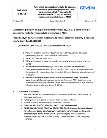 Instrukcja I-BC/15 Wydanie 03 Pobranie i transport materiału do badania z kosmówki poronionego płodu w celu oznaczenia płci lub/i aneuploidii chromosomów 21, 18, 13 metodą cytogenetyki molekularnej FISH Data 25.09.2015 Strona 1 z 3 Oznaczenie płci lub/i aneuploidii chromosomów 21, 18, 13 z kosmówki po poronieniu metodą cytogenetyki molekularnej FISH. Przed każdym dostarczeniem materiału do naszej placówki prosimy o kontakt telefoniczny Tel:784338650 I DO POBRANIA MATERIAŁU Z KOSMÓWKI WYMAGANE JEST: 1. Sterylny, szczelnie zamykany pojemnik o poj. 50ml(pojemnik na mocz) – przekazanych przez Laboratorium NZOZ GENOM. 2. Jałowa sól fizjologiczna – 30ml 3. Wkłady chłodzące -2szt (w przypadku transportu w temperaturze powyżej 230C). 4. Zlecenie badania laboratoryjnego FISH w celu ustalenia płci z kosmówki poronionego płodu-wypełnia lekarz kierujący (druk dostępny na naszej stronie internetowej) – załącznik nr 4 do Instrukcji „Zlecenie badania laboratoryjnego” (I-BC/04). 5. Deklaracja świadomej zgody na wykonanie badań genetycznych z kosmówki poronionego płodu w celu oznaczenia płci płodu metodą FISH –podpisaną przez pacjentkę (druk dostępny na naszej stronie internetowej) załącznik nr 5 do Instrukcji „Zlecenie badania laboratoryjnego” (I-BC/04). III II. POBRANIE MATERIAŁU 1. Materiał z kosmówki po poronieniu lup martwym urodzeniu pobiera lekarz w placówce medycznej. 2. Należy pobrać min. 20mg kosmówki (kilkanaście kosmków). 3. Przed badaniem lekarz wypełnia zlecenie na badanie. 4. ZLECENIE MUSI BYĆ KOMPLETNE I CZYTELNIE WYPEŁNIONE. 5. RODZIC LUB OPIEKUN PRAWNY MUSI PODPISAĆ Deklarację świadomej zgody na wykonanie badań genetycznych z kosmówki poronionego płodu w celu oznaczenia płci płodu metodą FISH – (druk dostępny na naszej stronie internetowej) załącznik nr 5 do Instrukcji „Zlecenie badania laboratoryjnego” (I-BC/04). 1 Instrukcja I-BC/15 Wydanie 03 Pobranie i transport materiału do badania z kosmówki poronionego płodu w celu oznaczenia płci lub/i aneuploidii chromosomów 21, 18, 13 metodą cytogenetyki molekularnej FISH Data 25.09.2015 Strona 2 z 3 Wszystkie poniższe czynności wykonujemy z zachowaniem sterylnych warunków w jednorazowych rękawiczkach medycznych. NALEŻY STOSOWAĆ ZASADY ASEPTYKI. 6. Należy opisać pojemnik poprzez przyklejenie plastra z danymi Rodzica: imię, nazwisko, data urodzenia Rodzica, data pobrania materiału. 7. Do pojemnika wlać 30 ml soli fizjologicznej. 8. Fragment kosmówki (wielkości ok. 20 mg) po pobraniu należy jak najszybciej umieścić w pojemniku z solą fizjologiczną i zamknąć szczelnie pojemnik. III. PRZECHOWYWANIE POBRANEGO MATERIAŁU Materiał należy wysłać do laboratorium zaraz po pobraniu- uprzedzając nas o wysyłce telefonicznie Tel:784338650 W szczególnych okolicznościach czas od poronienia do dostarczenia próbki do laboratorium nie powinien przekroczyć 48h (w tym czasie należy materiał przechowywać w lodówce 2-80C). IV. TRANSPORT DO LABORATORIUM Pojemnik z materiałem biologicznym owinąć w folię bąbelkową lub materiał pochłaniający (lignina) i umieścić w pozycji pionowej w pudełku transportowym(zabezpieczającym). Opakowanie zewnętrzne(zabezpieczające) powinno zawierać oznaczenie dla materiału biologicznego. 0 W przypadku transportu w temperaturze powyżej 23 C materiał musi być chłodzony (wkłady chłodzące). Laboratorium przyjmuje materiał na badanie z kosmówki od poniedziałku do czwartku w godzinach(800-1800 ) w piątek w godzinach (800 -1600 ). V. WAŻNE INFORMACJE DODATKOWE Uwaga! Umieszczenie pobranej kosmówki w substancjach utrwalających np. formalina, alkohol uniemożliwia przeprowadzenie badania. Nie przyjmujemy do badania martwego płodu. Do badania przyjmujemy tylko kosmówkę. 2 Instrukcja I-BC/15 Wydanie 03 Pobranie i transport materiału do badania z kosmówki poronionego płodu w celu oznaczenia płci lub/i aneuploidii chromosomów 21, 18, 13 metodą cytogenetyki molekularnej FISH Data 25.09.2015 Strona 3 z 3 NZOZ „GENOM” oferuje ustalenie płci płodu metodą cytogenetyki molekularnej FISH tylko w przypadku zastosowanie się do powyższych wytycznych. Uwaga! Całość dostarczonego materiału będzie wykorzystana do badań. 3