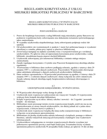 REGULAMIN KORZYSTANIA Z USŁUG MIEJSKIEJ BIBLIOTEKI PUBLICZNEJ W BARCZEWIE REGULAMIN KORZYSTANIA Z WYPOŻYCZALNI MIEJSKIEJ BIBLIOTEKI PUBLICZNEJ W BARCZEWIE §1 POSTANOWIENIA OGÓLNE 1. Prawo do bezpłatego korzystania z usług biblioteki mają mieszkańcy gminy Barczewo na podstawie wypełnionej karty zobowiązania oraz dokumentu tożsamości potwierdzającego adres zamieszkania. 2. W wypadku użytkownika niepełnoletniego, kartę zobowiązania podpisuje rodzic lub opiekun. 3. Od użytkowników nie wymienionych w punkcie 1 może być pobierana kaucja w wysokości określonej w cenniku, płatna przy zapisie w placówce bibliotecznej. 4. Zwrot kaucji następuje na żądanie czytelnika wraz z wyrejestrowaniem go z ewidencji użytkowników. Po upływie roku od zaprzestania korzystania przez użytkownika z usług biblioteki, nieodebrana kaucja stanowi dochód biblioteki. 5. Użytkownik zobowiązany jest informować bibliotekę o zmianie stałego miejsca zamieszkania. 6. Zasady regulujące korzystanie z Czytelni oraz Pracowni Komputerowej określają odrębne regulaminy. 7. Przetwarzane w bibliotece dane osobowe podlegają ochronie, zgodnie z ustawą z dnia 29 sierpnia 1997 r. o ochronie danych osobowych. Pracowników Wypożyczalni obowiązuje zakaz udzielania informacji o danych osobowych użytkowników biblioteki. 8. Dane osobowe zgromadzone w Wypożyczalni przetwarzane są zgodnie z Ustawą z dnia 29 sierpnia 1997 r. o ochronie danych osobowych i służą wyłącznie do celów statutowych. Zasady ochrony danych określają reguły bezpieczeństwa informacji obowiązujące w bibliotece. §2 UDOSTĘPNIANIE KSIĘGOZBIORU, WYPOŻYCZENIA 1. W Wypożyczalni obowiązuje wolny dostęp do półek 2. Użytkownik może wypożyczyć jednocześnie nie więcej niż 3 książki. O wypożyczeniu większej ilości książek decyduje bibliotekarz. 3. Książki wypożyczane są na okres: lektury szkolne i nowości – do 2 tygodni / pozostałe książki – do miesiąca. 4. Bibliotekarz może przesunąć termin zwrotu wypożyczonej książki, jeżeli nie ma na nią zapotrzebowania ze strony innych użytkowników, nie dłużej jednak niż o jeden okres wypożyczenia, o którym mowa w punkcie 3. 5. Użytkownik może wypożyczyć książkę dla innej osoby (zarejestrowanej w bibliotece) wyłącznie za jej pisemnym upoważnieniem. 6. Bibliotekarz na prośbę użytkownika udziela informacji o książkach, pomaga w doborze literatury, udziela wskazówek dotyczących korzystania z katalogów oraz wydawnictw informacyjnych. 7. Użytkownikowi zalegającemu ze zwrotem wypożyczonych zbiorów wysyłane jest jednorazowe upomnienie pocztą e-mail bądź tradycyjną. Ewentualne koszty wysłania upomnienia pokrywa użytkownik.W przypadku braku reakcji, po upływie 14 dni od daty wysłania upomnienia biblioteka zastrzega sobie prawo wykreślenia użytkownika z rejestru użytkowników i możliwość skierowania roszczenia Biblioteki na drogę postępowania sądowego. 8. W przypadku zniszczenia lub zagubienia woluminu, użytkownik zobowiązany jest do jego odkupienia lub zakupu innego, uzgodnionego z kierownikiem placówki lub zapłaty dwukrotnej jego aktualnej wartości rynkowej. 9. W przypadku nie zwrócenia we wskazanym terminie wypożyczonych pozycji, biblioteka ma prawo pobrać karę za przetrzymanie zbiorów w wysokości 6,00 zł od każdej pozycji, za każdy miesiąc zwłoki. §3 WYPOŻYCZENIA MIĘDZYBIBLIOTECZNE 1. W przypadku braku książki w zbiorach, na życzenie użytkownika biblioteka może sprowadzić żądaną publikację z innej biblioteki uczestniczącej w systemie wypożyczeń międzybibliotecznych Powiatowej Biblioteki Publicznej. Zasady wypożyczeń międzybibliotecznych określa odrębny regulamin. Koszty przesyłki pokrywa użytkownik. §4 SKARGI I WNIOSKI Skargi i wnioski użytkownik może zgłaszać do kierownika biblioteki. §5 ZASADY BEZPIECZEŃSTWA, POSTANOWIENIA KOŃCOWE 1. Użytkownik zobowiązany jest do poszanowania zbiorów. 2. Użytkownik korzystający z usług biblioteki jest odpowiedzialny za powierzone książki. Wszelkie zauważone przed wypożyczeniem uszkodzenia książek należy zgłosić bibliotekarzowi. 3. W bibliotece obowiązuje zachowanie ciszy i porządku oraz całkowity zakaz spożywania posiłków i palenia tytoniu. 4. Kierownik placówki może odmówić obsługi użytkownika będącego w stanie nietrzeźwym, zachowującego się głośno i agresywnie, zakłócającego w inny sposób porządek, naruszającego ogólnie panujące normy współżycia społecznego lub nieprzestrzegającego podstawowych zasad higieny osobistej. 5. Użytkownicy powinni stosować się do poleceń bibliotekarzy w zakresie odpowiadającym organizacji placówki bibliotecznej. 6. Użytkownik nie stosujący się do regulaminu Wypożyczalni może być czasowo, a w szczególnie drastycznych przypadkach na stałe, pozbawiony prawa do korzystania z usług biblioteki. Decyzję w tej sprawie podejmuje kierownik biblioteki na wniosek bibliotekarza. REGULAMIN CZYTELNI MIEJSKIEJ BIBLIOTEKI PUBLICZNEJ W BARCZEWIE §1 PRAWO KORZYSTANIA 1. Z Czytelni na miejscu mogą korzystać wszyscy użytkownicy biblioteki, niezależnie od tego, czy są stałymi czytelnikami. 2. Przy wypożyczeniach na zewnątrz od użytkowników niebędących mieszkańcami gminy Barczewo może być pobierana kaucja w wysokości określonej w cenniku, płatna przy zapisie w placówce bibliotecznej. 3. Zwrot kaucji następuje na żądanie użytkownika wraz z wyrejestrowaniem go z ewidencji użytkowników. Po upływie roku od zaprzestania korzystania przez użytkownika z usług biblioteki, nieodebrana kaucja stanowi dochód biblioteki. 4. Użytkownik zobowiązany jest informować bibliotekę o zmianie stałego miejsca zamieszkania. 5. Korzystanie z Czytelni jest bezpłatne. Ustalonym opłatom podlegają usługi komputerowe określone w odrębnym Regulaminie Korzystania z Pracowni Komputerowej oraz usługi: bindowania, laminowania, kserowania określon