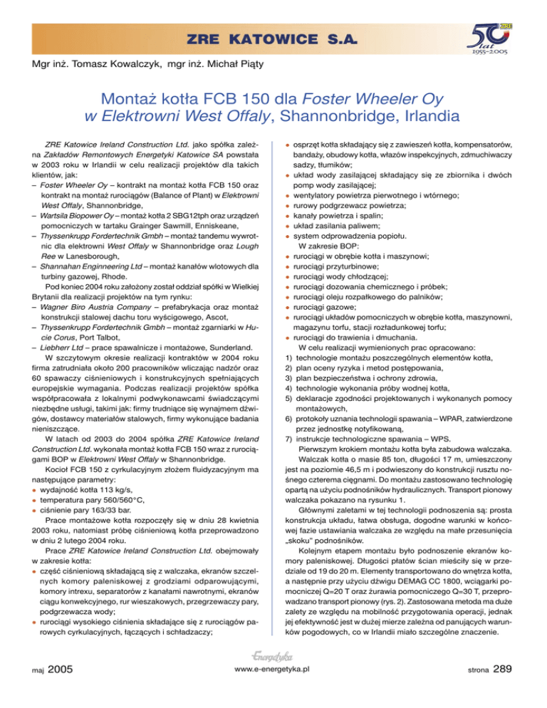 Mgr inż. Tomasz Kowalczyk, mgr inż. Michał Piąty Montaż kotła FCB 150 dla Foster Wheeler Oy w Elektrowni West Offaly, Shannonbridge, Irlandia ZRE Katowice Ireland Construction Ltd. jako spółka zależna Zakładów Remontowych Energetyki Katowice SA powstała w 2003 roku w Irlandii w celu realizacji projektów dla takich klientów, jak: – Foster Wheeler Oy – kontrakt na montaż kotła FCB 150 oraz kontrakt na montaż rurociągów (Balance of Plant) w Elektrowni West Offaly, Shannonbridge, – Wartsila Biopower Oy – montaż kotła 2 SBG12tph oraz urządzeń pomocniczych w tartaku Grainger Sawmill, Enniskeane, – Thyssenkrupp Fordertechnik Gmbh – montaż tandemu wywrotnic dla elektrowni West Offaly w Shannonbridge oraz Lough Ree w Lanesborough, – Shannahan Enginneering Ltd – montaż kanałów wlotowych dla turbiny gazowej, Rhode. Pod koniec 2004 roku założony został oddział spółki w Wielkiej Brytanii dla realizacji projektów na tym rynku: – Wagner Biro Austria Company – prefabrykacja oraz montaż konstrukcji stalowej dachu toru wyścigowego, Ascot, – Thyssenkrupp Fordertechnik Gmbh – montaż zgarniarki w Hucie Corus, Port Talbot, – Liebherr Ltd – prace spawalnicze i montażowe, Sunderland. W szczytowym okresie realizacji kontraktów w 2004 roku firma zatrudniała około 200 pracowników wliczając nadzór oraz 60 spawaczy ciśnieniowych i konstrukcyjnych spełniających europejskie wymagania. Podczas realizacji projektów spółka współpracowała z lokalnymi podwykonawcami świadczącymi niezbędne usługi, takimi jak: firmy trudniące się wynajmem dźwigów, dostawcy materiałów stalowych, firmy wykonujące badania nieniszczące. W latach od 2003 do 2004 spółka ZRE Katowice Ireland Construction Ltd. wykonała montaż kotła FCB 150 wraz z rurociągami BOP w Elektrowni West Offaly w Shannonbridge. Kocioł FCB 150 z cyrkulacyjnym złożem fluidyzacyjnym ma następujące parametry: wydajność kotła 113 kg/s, temperatura pary 560/560°C, ciśnienie pary 163/33 bar. Prace montażowe kotła rozpoczęły się w dniu 28 kwietnia 2003 roku, natomiast próbę ciśnieniową kotła przeprowadzono w dniu 2 lutego 2004 roku. Prace ZRE Katowice Ireland Construction Ltd. obejmowały w zakresie kotła: część ciśnieniową składającą się z walczaka, ekranów szczelnych komory paleniskowej z grodziami odparowującymi, komory intrexu, separatorów z kanałami nawrotnymi, ekranów ciągu konwekcyjnego, rur wieszakowych, przegrzewaczy pary, podgrzewacza wody; rurociągi wysokiego ciśnienia składające się z rurociągów parowych cyrkulacyjnych, łączących i schładzaczy; maj 2005 osprzęt kotła składający się z zawieszeń kotła, kompensatorów, bandaży, obudowy kotła, włazów inspekcyjnych, zdmuchiwaczy sadzy, tłumików; układ wody zasilającej składający się ze zbiornika i dwóch pomp wody zasilającej; wentylatory powietrza pierwotnego i wtórnego; rurowy podgrzewacz powietrza; kanały powietrza i spalin; układ zasilania paliwem; system odprowadzenia popiołu. W zakresie BOP: rurociągi w obrębie kotła i maszynowi; rurociągi przyturbinowe; rurociągi wody chłodzącej; rurociągi dozowania chemicznego i próbek; rurociągi oleju rozpałkowego do palników; rurociągi gazowe; rurociągi układów pomocniczych w obrębie kotła, maszynowni, magazynu torfu, stacji rozładunkowej torfu; rurociągi do trawienia i dmuchania. W celu realizacji wymienionych prac opracowano: 1) technologie montażu poszczególnych elementów kotła, 2) plan oceny ryzyka i metod postępowania, 3) plan bezpieczeństwa i ochrony zdrowia, 4) technologie wykonania próby wodnej kotła, 5) deklaracje zgodności projektowanych i wykonanych pomocy montażowych, 6) protokoły uznania technologii spawania – WPAR, zatwierdzone przez jednostkę notyfikowaną, 7) instrukcje technologiczne spawania – WPS. Pierwszym krokiem montażu kotła była zabudowa walczaka. Walczak kotła o masie 85 ton, długości 17 m, umieszczony jest na poziomie 46,5 m i podwieszony do konstrukcji rusztu nośnego czterema cięgnami. Do montażu zastosowano technologię opartą na użyciu podnośników hydraulicznych. Transport pionowy walczaka pokazano na rysunku 1. Głównymi zaletami w tej technologii podnoszenia są: prosta konstrukcja układu, łatwa obsługa, dogodne warunki w końcowej fazie ustawiania walczaka ze względu na małe przesunięcia „skoku” podnośników. Kolejnym etapem montażu było podnoszenie ekranów komory paleniskowej. Długości płatów ścian mieściły się w przedziale od 19 do 20 m. Elementy transportowano do wnętrza kotła, a następnie przy użyciu dźwigu DEMAG CC 1800, wciągarki pomocniczej Q=20 T oraz żurawia pomocniczego Q=30 T, przeprowadzano transport pionowy (rys. 2). Zastosowana metoda ma duże zalety ze względu na mobilność przygotowania operacji, jednak jej efektywność jest w dużej mierze zależna od panujących warunków pogodowych, co w Irlandii miało szczególne znaczenie. www.e-energetyka.pl strona 289 Rys. 3. Montaż wężownic przegrzewacza pary Ruszt komory paleniskowej złożony z trzech części, każda o wymiarach 7,0x2,7 m i masie 4,5 t, podnoszony był przy użyciu wciągników linowych. Ze względu na długość elementów problemem była duża giętkość, dlatego zastosowano specjalne ramy usztywniające, co pomogło w dokładnym dopasowaniu rusztu i zespoleniu z dolnymi częściami komory paleniskowej. Ciąg konwekcyjny montowany był również za pomocą dźwigu DEMAG CC1800 z wyjątkiem przegrzewaczy pary i podgrzewacza wody znajdujących się wewnątrz ciągu. Rys. 1. Schemat transportu pionowego walczaka kotła FCB 150 Silne i częste wiatry mogły powodować przestoje w realizacji założonych planów czasowych. Ważnym punktem w sporządzaniu harmonogramów krótkoterminowych było więc uwzględnienie prognoz pogodowych. Następna faza to podnoszenie części dolnych ścian komory paleniskowej oraz montaż stropu