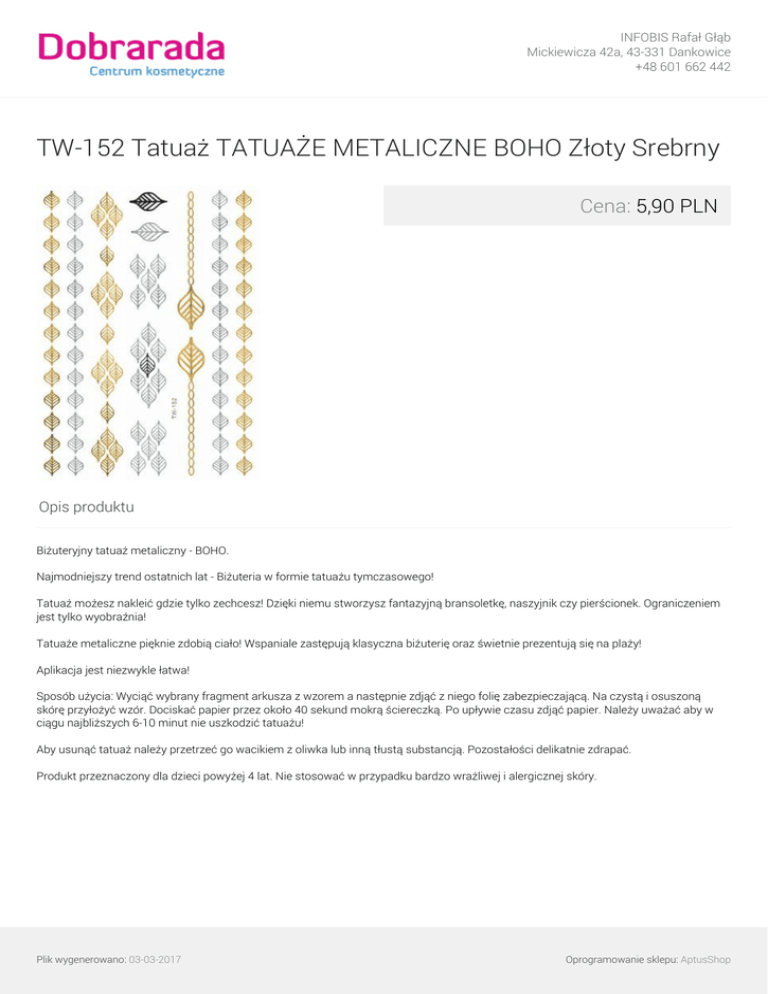 INFOBIS Rafał Głąb Mickiewicza 42a, 43-331 Dankowice +48 601 662 442 TW-152 Tatuaż TATUAŻE METALICZNE BOHO Złoty Srebrny Cena: 5,90 PLN Opis produktu Biżuteryjny tatuaż metaliczny - BOHO. Najmodniejszy trend ostatnich lat - Biżuteria w formie tatuażu tymczasowego! Tatuaż możesz nakleić gdzie tylko zechcesz! Dzięki niemu stworzysz fantazyjną bransoletkę, naszyjnik czy pierścionek. Ograniczeniem jest tylko wyobraźnia! Tatuaże metaliczne pięknie zdobią ciało! Wspaniale zastępują klasyczna biżuterię oraz świetnie prezentują się na plaży! Aplikacja jest niezwykle łatwa! Sposób użycia: Wyciąć wybrany fragment arkusza z wzorem a następnie zdjąć z niego folię zabezpieczającą. Na czystą i osuszoną skórę przyłożyć wzór. Dociskać papier przez około 40 sekund mokrą ściereczką. Po upływie czasu zdjąć papier. Należy uważać aby w ciągu najbliższych 6-10 minut nie uszkodzić tatuażu! Aby usunąć tatuaż należy przetrzeć go wacikiem z oliwka lub inną tłustą substancją. Pozostałości delikatnie zdrapać. Produkt przeznaczony dla dzieci powyżej 4 lat. Nie stosować w przypadku bardzo wrażliwej i alergicznej skóry. Plik wygenerowano: 03-03-2017 Oprogramowanie sklepu: AptusShop INFOBIS Rafał Głąb Mickiewicza 42a, 43-331 Dankowice +48 601 662 442 Galeria Plik wygenerowano: 03-03-2017 Powered by TCPDF (www.tcpdf.org) Oprogramowanie sklepu: AptusShop
