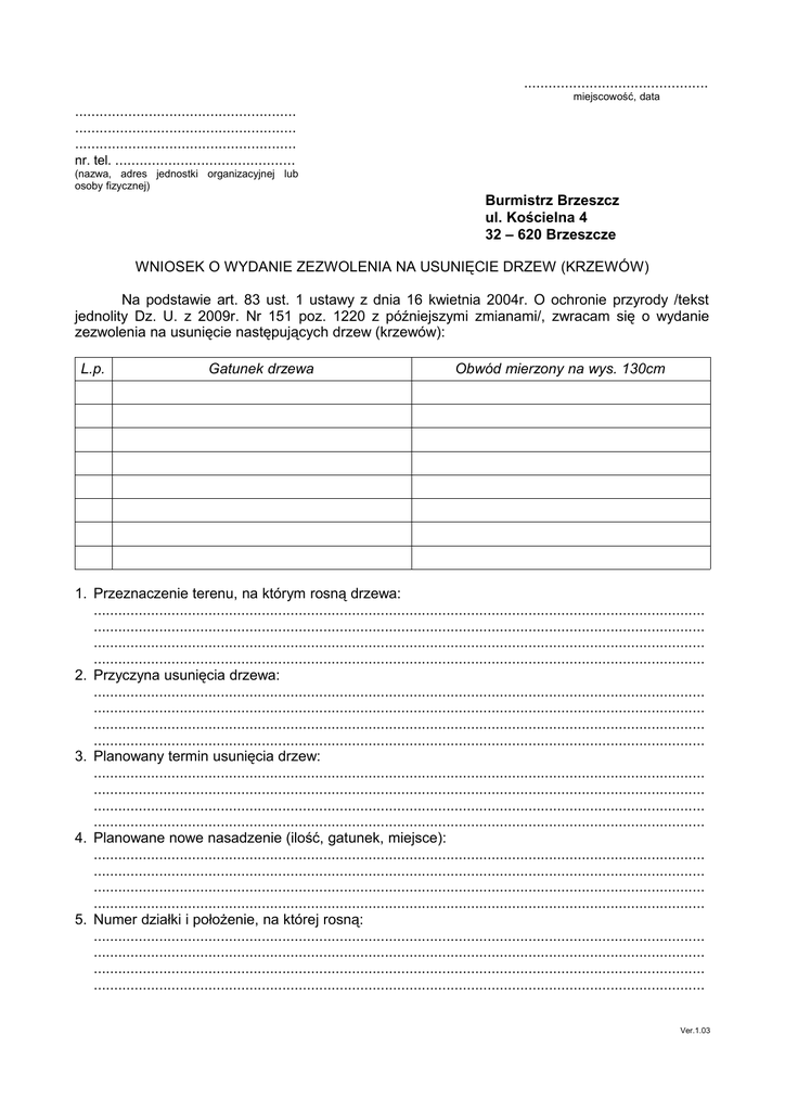 ............................................. miejscowość, data ...................................................... ...................................................... ...................................................... nr. tel. ............................................ (nazwa, adres jednostki organizacyjnej lub osoby fizycznej) Burmistrz Brzeszcz ul. Kościelna 4 32 – 620 Brzeszcze WNIOSEK O WYDANIE ZEZWOLENIA NA USUNIĘCIE DRZEW (KRZEWÓW) Na podstawie art. 83 ust. 1 ustawy z dnia 16 kwietnia 2004r. O ochronie przyrody /tekst jednolity Dz. U. z 2009r. Nr 151 poz. 1220 z późniejszymi zmianami/, zwracam się o wydanie zezwolenia na usunięcie następujących drzew (krzewów): L.p. Gatunek drzewa Obwód mierzony na wys. 130cm 1. Przeznaczenie terenu, na którym rosną drzewa: ..................................................................................................................................................... ..................................................................................................................................................... ..................................................................................................................................................... ..................................................................................................................................................... 2. Przyczyna usunięcia drzewa: ..................................................................................................................................................... ..................................................................................................................................................... ..................................................................................................................................................... ..................................................................................................................................................... 3. Planowany termin usunięcia drzew: ..................................................................................................................................................... ..................................................................................................................................................... ..................................................................................................................................................... ..................................................................................................................................................... 4. Planowane nowe nasadzenie (ilość, gatunek, miejsce): ..................................................................................................................................................... ..................................................................................................................................................... ..................................................................................................................................................... ..................................................................................................................................................... 5. Numer działki i położenie, na której rosną: ..................................................................................................................................................... ..................................................................................................................................................... ..................................................................................................................................................... ..................................................................................................................................................... Ver.1.03 6. Tytuł prawny do nieruchomości, z której mają być usuwane drzewa (krzewy): ..................................................................................................................................................... ..................................................................................................................................................... ..................................................................................................................................................... ..................................................................................................................................................... 7. W przypadku wniosku o wycięcie krzewów należy określić wielkość powierzchni, z której zostaną usunięte ..................................................................................................................................................... ..................................................................................................................................................... ..................................................................................................................................................... ..................................................................................................................................................... 8. Rysunek lub mapa określającą usytuowanie drzewa lub krzewu w stosunku do granic nieruchomości i obiektów budowlanych istniejących lub budowanych na tej nieruchomości. 1. Ilość załączników: ................... .................................... podpis wnioskodawcy (-ów) OŚWIADCZENIE Oświadczam, iż drzewa (krzewy) będące przedmiotem wniosku rosną na działce, której jestem właścicielem (posiadaczem*). .................................... podpis wnioskodawcy (-ów) * Jeżeli posiadacz nieruchomości nie jest właścicielem lub użytkownikiem wieczystym, do wniosku dołącza się