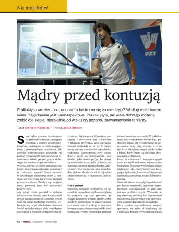 Nie musi boleç Màdry przed kontuzjà Profilaktyka urazów – co oznacza to hasło i co si´ za nim kryje? Według mnie bardzo wiele. Zagadnienie jest wieloaspektowe. Zaskakujàce, jak wiele dobrego mo˝emy zrobiç dla siebie, niezale˝nie od wieku czy poziomu zaawansowania tenisisty. Tekst Krzysztof Guzowski* | Foto Ludmiła Mitr´ga am byłem graczem turniejowym na poziomie krajowym, nast´pnie trenerem, a dopiero póêniej fizjoterapeutà, zajmujàcym si´ medycynà sportowà i profesjonalnymi tenisistami. Tak szerokie doÊwiadczenia pozwoliły mi poznaç rzeczywistoÊç funkcjonowania tenisistów od szkółki poprzez gracza klubowego lub amatora a˝ po zawodowca. Wszyscy wiemy, ˝e lepiej zapobiegaç ni˝ leczyç, ale czy naprawd´ o tym pami´tamy w codziennej rutynie? Sezon startowy w zawodowym tenisie trwa około 10 miesi´cy, tak wi´c czasu na leczenie kontuzji praktycznie nie ma. Choçby z tego wzgl´du temat prewencji musi byç traktowany priorytetowo. Aby adept tenisa pozostał w dobrym zdrowiu przez wi´kszà cz´Êç kariery, musi zostaç zaanga˝owanych znacznie wi´cej osób ni˝ lekarz medycyny sportowej, wykonujàcy raz na pół roku badania okresowe. Model uwzgl´dniajàcy stałà współprac´ zawodnika z trenerem przygotowania fi- S 62 | TENISklub| PAèDZIERNIK – LISTOPAD 2014 zycznego, fizjoterapeutà, fizjologiem, masa˝ystà i dietetykiem jest standardem w Hiszpanii czy Francji, gdzie zawodowi tenisiÊci doskonalà si´ od lat. Z drugiej strony, nie ma koniecznoÊci zatrudniania osobistego fizjoterapeuty, ˝eby zaczàç dbaç o siebie jak profesjonalista. IloÊç działaƒ, jakie mo˝na podjàç, by cieszyç si´ zdrowiem i wcià˝ szaleç na korcie, jest ogromna. Niektóre z nich sà bardzo „przyziemne”, wr´cz oczywiste, inne nieco bardziej zło˝one, ale wierzcie mi, ˝e najcz´Êciej zaniedbywane sà te najbardziej podstawowe. Trzy w jednym Podstawà skutecznej profilaktyki jest racjonalnie prowadzona ogólnorozwojówka. Na zaj´ciach tego typu powinien byç podj´ty dwutorowy program działaƒ. Jeden aspekt to podniesienie na wy˝szy poziom cech motorycznych, a drugi to çwiczenia kompensacyjne, zabezpieczajàce ciało przed kontuzjami. Wbrew pozorom ten pierwszy równie˝ zmniejsza urazowoÊç. Przykładem mo˝e byç wzmocnienie mi´Êni nóg i poÊladków, lepsze ich wykorzystanie do generowania mocy przy serwisie, a co za tym idzie odcià˝enie mi´Êni okolic barku i łokcia, które cz´sto sà dotkni´te chronicznymi problemami. Piszàc o çwiczeniach kompensacyjnych, mam na myÊli çwiczenia asymetryczne kr´gosłupa, çwiczenia wyrównujàce balans mi´Êniowy (siła, elastycznoÊç) oraz korygujàce dysfunkcje, które wczeÊniej zostały zidentyfikowane przez lekarza lub fizjoterapeut´. Zawodnik i trener muszà byç wyedukowani pod kàtem rozgrzewki, czynnoÊci regeneracyjnych wykonywanych po grze oraz çwiczeƒ profilaktycznych. Wszystkie te trzy elementy powinny byç odpowiednio uło˝one pod kàtem tenisa oraz indywidualnie dobrane dla ka˝dego zawodnika. Diet´ powinni optymalizowaç wszyscy sportowcy, nie tylko ci borykajàcy si´ z nadwagà. Poziom wytrzymałoÊci tkanek, tempo gojenia i regeneracji czy poziom odczuwanego zm´czenia to tylko niektóre elementy, na które ma wpływ od˝ywianie. Sen, sprz´t sportowy i plan treningowy to kolejne składowe zapobiegania urazom. Nie ma dymu bez ognia Aby dobrze pojàç zagadnienie profilaktyki, nale˝y przemodelowaç myÊlenie na temat kontuzji z objawowego na przyczynowe. Wi´kszoÊç urazów w sporcie jest natury przecià˝eniowej. Oznacza to, ˝e przez długi czas, wiele tysi´cy razy dana struktura była poddana obcià˝eniu, po którym nie była w stanie w pełni si´ odbudowaç. Jest to proces stopniowego uszkadzania tkanki. Przyczynà takiej sytuacji mo˝e byç błàd techniczny uderzenia. Kiedy zawodnik przy serwisie nadmiernie korzysta ze słabych mi´Êni brzucha zamiast z silnych mi´Êni poÊladków, te pierwsze, wczeÊniej czy póêniej, odmówià posłuszeƒstwa. Stosujàc jedynie leczenie objawowe, czyli przykładowo leki przeciwbólowe, bez wprowadzenia leczenia profilaktycznego (nauka poprawnego wykorzystania łaƒcucha kinetycznego przy wykonywaniu ruchu serwisowego) z du˝ym prawdopodobieƒstwem doprowadzimy do nawrotu problemu po powrocie do pełnych obcià˝eƒ na korcie. Kolejnym êródłem urazów z przecià˝enia mo˝e byç zaburzona funkcja jednej okolicy ciała, powodujàca nadmiernà eksploatacj´ innej. Cz´stym problemem obrazujàcym ten mechanizm jest nieprawidłowy sposób generowania rotacji ciała potrzebnej do wykonania uderzeƒ. Nadmierna sztywnoÊç stawów biodrowych oraz odcinka piersiowego kr´gosłupa u tenisistów wymusza kumulowanie si´ całej rotacji na poziomie odcinka l´dêwiowego. Działaniem zapobiegajàcym przecià˝eniu tej cz´Êci kr´gosłupa jest poprawa ruchomoÊci jego „sàsiadów“, czyli bioder i odcinka piersiowego. Jest to przykład rozumowania przyczynowo-skutkowego, jakie nale˝y przeprowadziç, aby zidentyfikowaç i wyeliminowaç êródło kontuzji, czym na co dzieƒ zajmujà si´ fizjoterapeuci i trenerzy funkcjonalni. Wspólny cel Aspektów prewencji urazów mamy wiele i z tego powodu tak wa˝na jest współpraca R E K L A M trenera tenisa z trenerem przygotowania motorycznego i fizjoterapeutà (zapraszamy do współpracy ze specjalistami CRS Clinic; poni˝ej szczegóły specjalnej oferty dla trenerów i zawodników tenisa). Wszyscy wymienieni specjaliÊci majà ten sam cel: chcà, aby zawodnik poprawiał wyniki sportowe oraz aby kontuzje przydarzały mu si´ jak najrzadziej. Jedynie narz´dzia, jakimi si´ posługujà, ró˝nià si´ od siebie, ale te˝ uzupełniajà, tworzàc spójnà całoÊç. Z mojej wiary w słusznoÊç i wag´ wspomnianych kwestii zwiàzanych z prewencjà zrodziła si´ potrzeba zorganizowania szkolenia poruszajàcego tematyk´ profilaktyki urazów w tenisie. Prowadz´ je wraz z trenerem funkcjonalny
