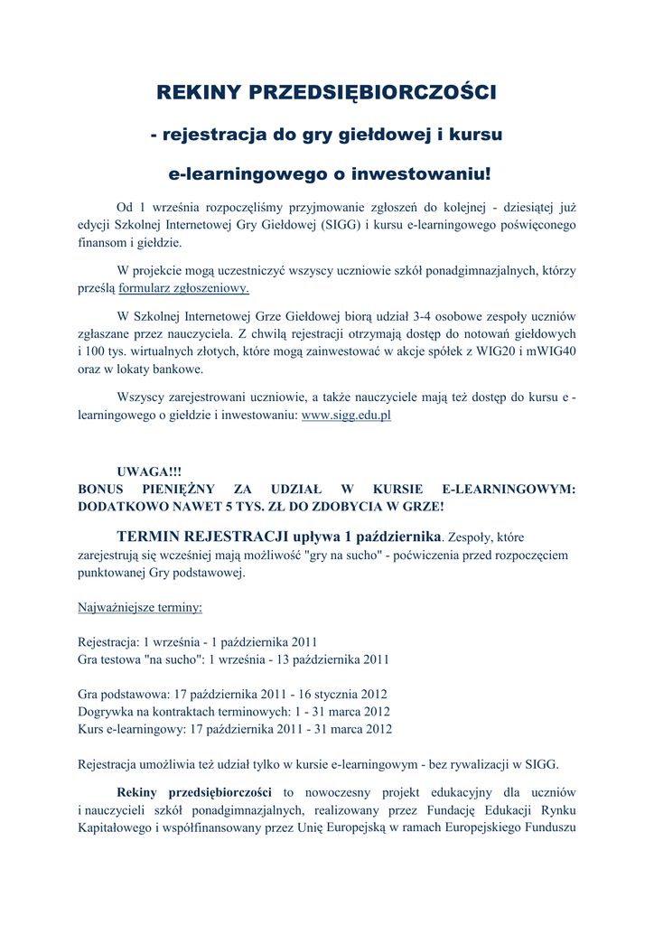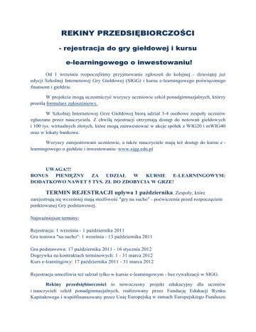 REKINY PRZEDSIĘBIORCZOŚCI - rejestracja do gry giełdowej i kursu e-learningowego o inwestowaniu! Od 1 września rozpoczęliśmy przyjmowanie zgłoszeń do kolejnej - dziesiątej juŜ edycji Szkolnej Internetowej Gry Giełdowej (SIGG) i kursu e-learningowego poświęconego finansom i giełdzie. W projekcie mogą uczestniczyć wszyscy uczniowie szkół ponadgimnazjalnych, którzy prześlą formularz zgłoszeniowy. W Szkolnej Internetowej Grze Giełdowej biorą udział 3-4 osobowe zespoły uczniów zgłaszane przez nauczyciela. Z chwilą rejestracji otrzymają dostęp do notowań giełdowych i 100 tys. wirtualnych złotych, które mogą zainwestować w akcje spółek z WIG20 i mWIG40 oraz w lokaty bankowe. Wszyscy zarejestrowani uczniowie, a takŜe nauczyciele mają teŜ dostęp do kursu e learningowego o giełdzie i inwestowaniu: www.sigg.edu.pl UWAGA!!! BONUS PIENIĘśNY ZA UDZIAŁ W KURSIE E-LEARNINGOWYM: DODATKOWO NAWET 5 TYS. ZŁ DO ZDOBYCIA W GRZE! TERMIN REJESTRACJI upływa 1 października. Zespoły, które zarejestrują się wcześniej mają moŜliwość "gry na sucho" - poćwiczenia przed rozpoczęciem punktowanej Gry podstawowej. NajwaŜniejsze terminy: Rejestracja: 1 września - 1 października 2011 Gra testowa "na sucho": 1 września - 13 października 2011 Gra podstawowa: 17 października 2011 - 16 stycznia 2012 Dogrywka na kontraktach terminowych: 1 - 31 marca 2012 Kurs e-learningowy: 17 października 2011 - 31 marca 2012 Rejestracja umoŜliwia teŜ udział tylko w kursie e-learningowym - bez rywalizacji w SIGG. Rekiny przedsiębiorczości to nowoczesny projekt edukacyjny dla uczniów i nauczycieli szkół ponadgimnazjalnych, realizowany przez Fundację Edukacji Rynku Kapitałowego i współfinansowany przez Unię Europejską w ramach Europejskiego Funduszu Społecznego, na który składa się Szkolna Internetowa Gra Giełdowa oraz kurs e-learningowy sigg.edu.pl. Szkolna Internetowa Gra Giełdowa od praktycznej strony uczy młodych ludzi inwestowania na giełdzie, analizowania sytuacji na rynkach, podejmowania decyzji i pracy w grupie. Dzięki dostępowi do giełdowego systemu transakcyjnego, zespoły uczestniczące w Grze (3-4 uczniów pod opieką nauczyciela) mogą zainwestować wirtualne 100 000 zł w akcje spółek notowanych na warszawskim parkiecie. Do ich dyspozycji jest równieŜ tzw. krótka sprzedaŜ, czyli strategia, która pozwala zarabiać równieŜ na spadkach kursów. Zespoły, które uczestniczą w grze podstawowej, mogą spróbować swoich sił takŜe w Dogrywce na kontraktach terminowych. Ta część Gry jest oddzielnie punktowana i nagradzana. Uczestnikami Kursu sigg.edu.pl mogą być wszystkie osoby, które zarejestrowały się do projektu Rekiny Przedsiębiorczości, niezaleŜnie od udziału w Grze. W dziesięciu lekcjach zawierających elementy multimedialne kursanci zdobywają wiedzę o metodach inwestowania oraz mechanizmach rządzących rynkiem kapitałowym. Dodatkowo korzystają teŜ ze specjalnego kursu terminologii finansowo-giełdowej w języku angielskim, a takŜe forów tematycznych i czatu. KaŜda lekcja zakończona jest quizem. Podsumowaniem kursu jest ogólnopolska klasówka on-line, której laureaci zostają wyróŜnieni oddzielnymi nagrodami. KaŜdy uczestnik, który zaliczy cały kurs e-learningowy, otrzymuje specjalny certyfikat ukończenia. JuŜ po raz kolejny w tegorocznej edycji projektu istotną atrakcją jest BONUS PIENIĘśNY za udział w kursie e-learningowym. Za zaliczenie kaŜdego z 10 quizów uczestnik będzie otrzymywał odpowiednio: *0-3 pkt = 0 zł - quiz niezaliczony *4 pkt = 200 zł *5 pkt = 300 zł *6 pkt = 400 zł *7 pkt = 500 zł Do zdobycia: 7 pkt x 10 quizów = 5 tys. wirtualnych zł !!!! KaŜdemu zespołowi zostanie dopisana kwota wywalczona przez tego członka zespołu, który uzyskał najwyŜszy wynik w quizie. Oznacza to, Ŝe tylko najlepszy ze wszystkich wyników uzyskanych przez przystępujących do testu członków danego zespołu będzie premiowany. Informacja o dodaniu bonusów poszczególnym zespołom zostanie umieszczona na stronie głównej SIGG w formie komunikatu. Suma bonusów uzyskanych przez poszczególne zespoły zostanie zespołom dopisana jednorazowo, po zakończeniu gry podstawowej. Więcej informacji na temat bonusów znajduje się w Regulaminie. Jak co roku zwycięzcy Gry podstawowej i Dogrywki - czyli zespoły, które uzyskały najwyŜszą stopę zwrotu ze swoich wirtualnych inwestycji, a takŜe finaliści kończącej kurs e- learningowy klasówki on-line otrzymują cenne nagrody rzeczowe i wyjeŜdŜają na wycieczkę edukacyjną na jedną z europejskich giełd. Laureaci Rekinów przedsiębiorczości (24 najlepsze zespoły uczestniczące w Grze i Dogrywce, zdobywcy tzw. premii lotnych i 16 zwycięzców w poszczególnych województwach) oraz finaliści klasówki on-line są takŜe wyróŜniani dyplomami i zaproszeniem na UROCZYSTĄ GALĘ NA GIEŁDZIE PAPIERÓW WARTOŚCIOWYCH. Jeszcze nie wiesz jak inwestować w SIGG? Przeczytaj rady maklera giełdowego. Chcesz sprawdzić, jak radzili sobie uczestnicy poprzednich edycji? Jakie strategie przyniosły zwycięstwo, a jakie kończyły się sromotną klęską? Zobacz profesjonalną analizę portfeli zespołów uczestniczących w poprzedniej edycji. Rekiny Przedsiębiorczości to największy ogólnopolski projekt edukacyjny poświęcony inwestowaniu skierowany do młodzieŜy ponadgimnazjalnej. Jego podstawą była zainicjowana przez Giełdę Papierów Wartościowych Szkolna Internetowa Gra Giełdowa (SIGG). Począwszy od 8. edycji, grę giełdową uzupełnił rozbudowany multimedialny kurs edukacyjny dotyczący inwestowania i zasad działania rynku kapitałowego, a cały projekt pod nazwą Rekiny Przedsiębiorczości został objęty dofinansowaniem UE w ramach Europejskiego Funduszu Społecznego. Realizację Rekinów nadzoruje Ministerstwo Edukacji Narodowej, w ramach Programu Operacyjnego Kapitał Ludzki, Priorytet III: Wysoka jakość oświaty; Podzi