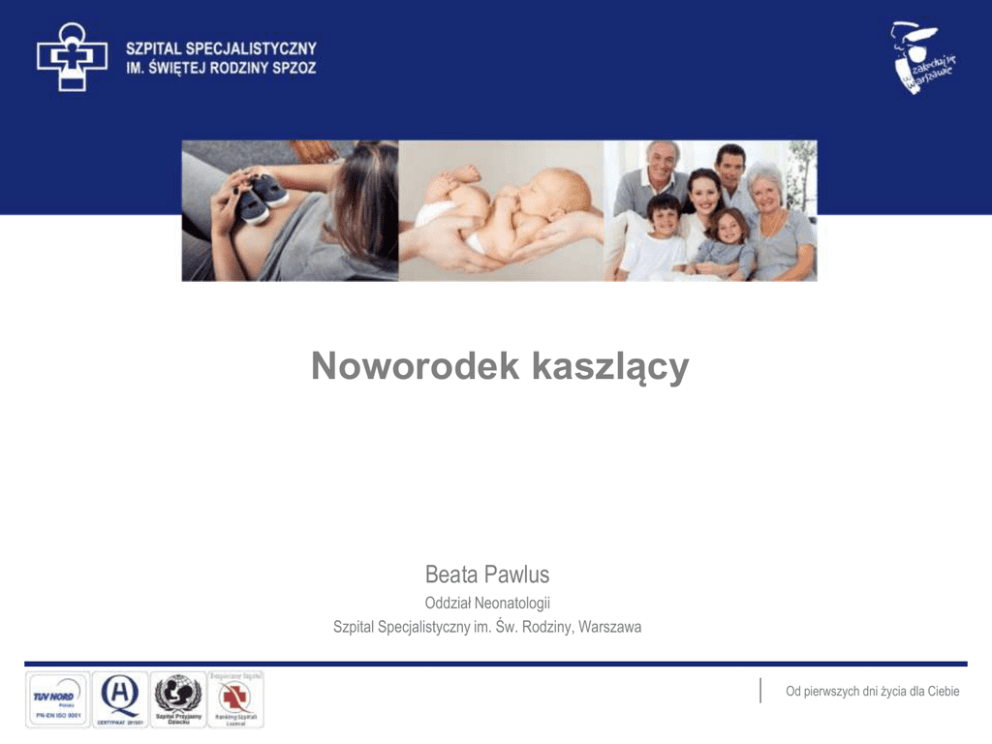 Noworodek kaszlący Beata Pawlus Oddział Neonatologii Szpital Specjalistyczny im. Św. Rodziny, Warszawa Od pierwszych dni życia dla Ciebie • • • Pododdział Patologii Noworodka – trzy lata działalności około 450 noworodków przyjętych „z zewnątrz” możliwość „pobytu hotelowego” dla matki Położnictwo I Ginekologia I Pediatria I Neonatologia I Onkologia I Rehabilitacja I Diagnostyka www.szpitalmadalinskiego.pl Noworodek kaszlący ??? • • • • Czy można nie skierować do szpitala? TAK NIE ??? Czy można odesłać ze szpitalnej izby przyjęć do domu? TAK NIE ??? Czy zawsze kaszel związany jest z infekcją układu oddechowego? TAK NIE ??? Czy noworodek kaszlący powinien otrzymać antybiotyk? TAK NIE ??? Położnictwo I Ginekologia I Pediatria I Neonatologia I Onkologia I Rehabilitacja I Diagnostyka www.szpitalmadalinskiego.pl 3 Pacjent 1- Okres okołoporodowy • • • • • • Noworodek płci męskiej CI PI, 37 t. c urodzony drogą cięcia cesarskiego z powodu cholestazy ciężarnych stan dobry - 10 pkt. w skali Apgar masa ciała 3100g okres okołoporodowy – hiperbilirubinemia (poziom bilirubiny 16,31 mg%) – trudności w karmieniu piersią – wypisany do domu w 6 dobie życia w stanie dobrym, z przyrostem masy ciała. Położnictwo I Ginekologia I Pediatria I Neonatologia I Onkologia I Rehabilitacja I Diagnostyka www.szpitalmadalinskiego.pl 4 Pododdział Patologii Noworodka – I pobyt • • 22 doba życia objawy infekcji górnych dróg oddechowych – kaszel dyskretny, suchy, trwający od 2 dni – brak przyrostu masy ciała – stan ogólny dość dobry • w wywiadzie: ojciec dziecka z objawami trudno leczącej się infekcji górnych dróg oddechowych (zapalenie oskrzeli ?) • po opracowaniu bakteriologicznym włączono antybiotykoterapię (amoksycylina z kwasem klawulanowym) Położnictwo I Ginekologia I Pediatria I Neonatologia I Onkologia I Rehabilitacja I Diagnostyka www.szpitalmadalinskiego.pl 5 Pododdział Patologii Noworodka – I pobyt • RTG klatki piersiowej - bez nieprawidłowości • wykładniki zakażenia ujemne • USG jamy brzusznej – niewielkie skrócenie odcinka podprzeponowego przełyku do 18mm – włączono Nutriton (w trakcie hospitalizacji ulewania) Noworodka wypisano do domu po 5 dniach leczenia uzyskując poprawę stanu klinicznego (27 doba życia). Położnictwo I Ginekologia I Pediatria I Neonatologia I Onkologia I Rehabilitacja I Diagnostyka www.szpitalmadalinskiego.pl 6 Noworodek kaszlący ??? • Kaszel u noworodka najczęściej spowodowany jest: – zarzucaniem treści pokarmowej TAK NIE ??? – infekcją górnych i/lub dolnych dróg oddechowych TAK NIE ??? – niewydolnością krążenia TAK NIE ??? – infekcją RSV TAK NIE ??? Położnictwo I Ginekologia I Pediatria I Neonatologia I Onkologia I Rehabilitacja I Diagnostyka www.szpitalmadalinskiego.pl 7 Pododdział Patologii Noworodka – II pobyt • • 32 doba życia Przy przyjęciu: – stan średni, pacjent apatyczny, obniżone napięcie mięśniowe – kaszel - nasilony, suchy, napadowy, prowokujący wymioty – osłuchowo nad polami płucnymi zaostrzony szmer pęcherzykowy – nasilone ulewanie – obecność w jamie ustnej lepkiej, ciągnącej się wydzieliny – brzuch - wzdęty, rozlany – przyrost masy ciała - niewielki (12g/dobę) – skóra zażółcona, z woskowym odcieniem – cichy szmer skurczowy nad sercem Położnictwo I Ginekologia I Pediatria I Neonatologia I Onkologia I Rehabilitacja I Diagnostyka www.szpitalmadalinskiego.pl 8 Pododdział Patologii Noworodka – II pobyt • W badaniach laboratoryjnych: – hiperbilirubinemia z poziomem bilirubiny 18,18 mg% – limfocytoza – 79%, z prawidłowym poziomem leukocytów – 9,2 – mierna niedokrwistość – CRP, glikemia, wykładniki wątrobowe, jonogram w normie • • Pacjent gazometrycznie wyrównany RTG klatki piersiowej – bez cech zapalenia Położnictwo I Ginekologia I Pediatria I Neonatologia I Onkologia I Rehabilitacja I Diagnostyka www.szpitalmadalinskiego.pl 9 Pododdział Patologii Noworodka – II pobyt • Postępowanie przy przyjęciu do szpitala: – dziecko umieszczono w inkubatorze zamkniętym – monitorowano parametry życiowe (po napadzie kaszlu okresowo występowały desaturacje, bezdechy z mierną sinicą) – stosowano tlenoterapię bierną – po opracowaniu bakteriologicznym wdrożono antybiotykoterapię (cefuroksym) – nebulizacje z Pulmicortu oraz soli fizjologicznej – fototerapia – reżim sanitarny Położnictwo I Ginekologia I Pediatria I Neonatologia I Onkologia I Rehabilitacja I Diagnostyka www.szpitalmadalinskiego.pl 10 Pododdział Patologii Noworodka – II pobyt • Z powodu braku poprawy stanu dziecka w kolejnych dobach do leczenia wdrożono: – erytromycynę – częściowe żywienie pozajelitowe – nebulizacje z Berodualu – leki przeciwkaszlowe – sterydoterapię Położnictwo I Ginekologia I Pediatria I Neonatologia I Onkologia I Rehabilitacja I Diagnostyka www.szpitalmadalinskiego.pl 11 Diagnostyka • Test w kierunku RSV (ujemny) • Kompleksowe badania serologiczne w kierunku – Mycoplasma pneumoniae: IgG, IgM (ujemne) – Pneumocystis carini: Ig G (dodatni), Ig M (ujemny) – Bordatella pertussis: IgG, IgM, IgA (ujemne) • • USG głowy i jamy brzusznej bez zmian Hormony tarczycy, alfa -1-antytrypsyna – w normie Położnictwo I Ginekologia I Pediatria I Neonatologia I Onkologia I Rehabilitacja I Diagnostyka www.szpitalmadalinskiego.pl 12 Diagnostyka • Pomimo ujemnego wyniku we wszystkich klasach przeciwciał przeciw-krztuścowych pobrano materiał do badania metodą PCR • Wynik potwierdził obecność materiału genetycznego krztuśca oraz toksyny krztuścowej! Położnictwo I Ginekologia I Pediatria I Neonatologia I Onkologia I Rehabilitacja I Diagnostyka www.szpitalmadalinskiego.pl 13 Pododdział Patologii Noworodka – II pobyt • Leczenie erytromycyną prowadzono 14 dni • Podczas pobytu odbyły się konsultacje: