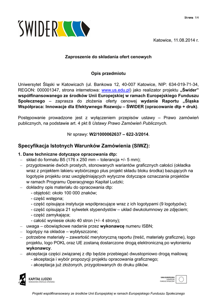 Strona 1/4 Katowice, 11.08.2014 r. Zaproszenie do składania ofert cenowych Opis przedmiotu Uniwersytet Śląski w Katowicach (ul. Bankowa 12, 40-007 Katowice, NIP: 634-019-71-34, REGON: 000001347, strona internetowa: www.us.edu.pl) jako realizator projektu „Świder” współfinansowanego ze środków Unii Europejskiej w ramach Europejskiego Funduszu Społecznego – zaprasza do złożenia oferty cenowej wydanie Raportu „Śląska Współpraca: Innowacje dla Efektywnego Rozwoju – ŚWIDER (opracowanie dtp + druk). Postępowanie prowadzone jest z wyłączeniem przepisów ustawy – Prawo zamówień publicznych, na podstawie art. 4 pkt 8 Ustawy Prawo Zamówień Publicznych. Nr sprawy: W2/1000062637 – 622-3/2014. Specyfikacja Istotnych Warunków Zamówienia (SIWZ): 1. Dane techniczne dotyczące opracowania dtp: – skład do formatu B5 (176 x 250 mm – tolerancja +/- 5 mm); – przygotowanie dwóch prostych, stonowanych wariantów graficznych całości (okładka wraz z projektem lakieru wybiórczego plus projekt składu bloku środka) bazujących na logotypie projektu oraz uwzględniających wytyczne dotyczące oznaczania projektów w ramach Programu Operacyjnego Kapitał Ludzki; – dokładny opis materiału do opracowania dtp: - objętość: około 100 000 znaków; - część wstępna; - część opisująca instytucje współpracujące wraz z ich logotypami (9 logotypów); - część opisująca 21 sylwetek stypendystów – układ dwukolumnowy ze zdjęciem; - część zamykająca; - całość wyniesie około 40 stron (+/- 4 strony); – uwaga – obowiązkowe nadanie przez wykonawcę numeru ISBN; – logotypy na okładce – wybłyszczone; – potrzebne materiały – zawartość merytoryczną raportu (treść, materiały graficzne), logo projektu, logo POKL oraz UE zostaną dostarczone drogą elektroniczną po wyłonieniu wykonawcy. – akceptacja części związanej z dtp będzie przebiegać dwustopniowo drogą mailową: - akceptacja i wybór propozycji projektu opracowania graficznego; - akceptacja już złożonych, przygotowanych do druku plików. Projekt współfinansowany ze środków Unii Europejskiej w ramach Europejskiego Funduszu Społecznego Strona 2/4 2. Dane techniczne dotyczące druku: – ilość egzemplarzy: 150 sztuk; – technika druku: offset/cyfra; – format druku B5 (176 x 250 mm – tolerancja +/- 5 mm); – papier bloku: kreda matowa 90 g (lub równoważny); – liczba stron w bloku – 40 stron (+/- 4 strony); – zadruk bloku – pełen kolor – druk 4 + 4; – oprawa broszurowa szyta; – zadruk oprawy – pełen kolor plus lakier wybiórczy 5 + 0; – papier na oprawę: kreda matowa 250 g (lub równoważny) – folia matowa na oprawie, na to lakier wybiórczy. Termin realizacji: 1. Przygotowanie projektów opracowania graficznego: – 1 dzień roboczy (24 h) od otrzymania materiałów od zamawiającego. 2. Skład, łamanie i przygotowanie do druku materiałów – 2 dni robocze (48 h) od zaakceptowania projektu opracowania graficznego. 3. Druk i dostarczenie nakładu do siedziby Zamawiającego: – 5 dni roboczych od momentu otrzymania akceptacji plików do druku od Zamawiającego. Rozliczenie realizacji usługi odbędzie się na podstawie zawartej pisemnie umowy, protokołu odbioru nakładu oraz prawidłowo wystawionej faktury VAT (5%). Kontakt z Zamawiającym Postępowanie prowadzi – Beata Klyta – tel. 32 359 15 70. Osobą upoważnioną ze strony Zamawiającego do kontaktu z Wykonawcami w sprawach merytorycznych – wyboru i akceptacji projektu jest dr Marcin Binkowski , e-mail: [email protected] tel. 32 359 22 66. Wybór oferty nastąpi w oparciu o: – najkorzystniejszą cenę brutto (100 %), Sposób i termin składania oferty: 18.08.2014 r. do godz. 10.00 Oferty na ww. zadania powinny zostać złożone wyłącznie w formie elektronicznej drogą via e-mail pod adresem [email protected] do dnia 18 sierpnia 2014 roku do godziny 10:00. Oferty złożone po terminie lub w inny sposób nie zostaną rozpatrzone. Projekt współfinansowany ze środków Unii Europejskiej w ramach Europejskiego Funduszu Społecznego Strona 3/4 Wymagania wobec oferentów: 1. Oferty mogą składać jedynie podmioty mające prawo do nadawania numeru ISBN. 2. Oferta Wykonawcy winna zawierać cenę brutto w PLN, zawierającą wszelkie koszty związane z wykonaniem zamówienia; nazwę oferenta; dane teleadresowe i e-mail oferenta, złożona na załączniku nr 1 dołączonego do niniejszego zapytania wraz z pieczęcią firmową oraz podpisem osób upoważnionych do składania oświadczeń woli w imieniu wykonawcy oraz umożliwiający identyfikację osoby składającej podpis. 3. Oferent może złożyć tylko jedną ofertę cenową. 4. Po wyłonieniu najkorzystniejszej oferty, Zamawiający przekaże Wykonawcy umowę w formie pisemnej – Wykonawca zobowiązany jest niezwłocznie do jej podpisania i odesłania do Zamawiającego. 5. Oferenci, których oferta zostanie wybrana, zostaną poinformowani pisemnie (drogą elektroniczną). Uwagi Końcowe 1. Zamawiający zastrzega sobie prawo odstąpienia bądź unieważnienia zapytania ofertowego bez podania przyczyny w przypadku zaistnienia okoliczności nieznanych Zamawiającemu w dniu sporządzania niniejszego zapytania Ofertowego. 2. Zamawiający wykluczy z postępowania Oferentów, którzy złożą ofertę niezgodną z prawdą (poświadczą nieprawdziwe informacje). 3. Zapytanie ofertowe nie stanowi oferty w rozumieniu art. 66 §1 k.c. 4. Oferenci uczestniczą w postępowaniu ofertowym na własne ryzyko i koszt, nie przysługują im żadne roszczenia z tytułu odstąpienia przez Zamawiającego od postępowania ofertowego. 5. Ocena zgodności ofert z wymaganiami Zamawiającego przeprowadzona zostanie na podstawie analizy dokumentów i materiałów, jakie Oferent zawarł w swej ofercie. Ocenie podlegać będzie zarówno formalna jak i merytoryczna zgodność oferty z wymaganiami. 6. Zamawiający nie dopuszcza możliwości składania of