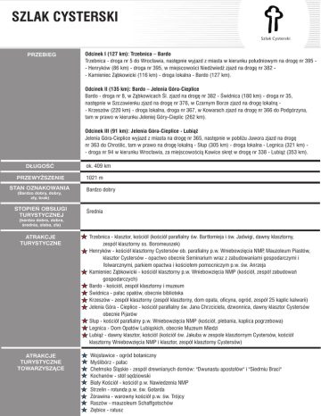 SZLAK CYSTERSKI Szlak Cysterski PRZEBIEG Odcinek I (127 km): Trzebnica – Bardo Trzebnica - droga nr 5 do Wrocławia, następnie wyjazd z miasta w kierunku południowym na drogę nr 395 - Henryków (86 km) - droga nr 395, w miejscowości Niedźwiedź zjazd na drogę nr 382 - Kamieniec Ząbkowicki (116 km) - droga lokalna - Bardo (127 km). Odcinek II (135 km): Bardo – Jelenia Góra-Cieplice Bardo - droga nr 8, w Ząbkowicach Śl. zjazd na drogę nr 382 - Świdnica (180 km) - droga nr 35, następnie w Szczawienku zjazd na drogę nr 376, w Czarnym Borze zjazd na drogę lokalną - Krzeszów (220 km) - droga lokalna, droga nr 367, w Kowarach zjazd na drogę nr 366 do Podgórzyna, tam w prawo w kierunku Jeleniej Góry-Cieplic (262 km). Odcinek III (91 km): Jelenia Góra-Cieplice - Lubiąż Jelenia Góra-Cieplice wyjazd z miasta na drogę nr 365, następnie w pobliżu Jawora zjazd na drogę nr 363 do Chroślic, tam w prawo na drogę lokalną - Słup (305 km) - droga lokalna - Legnica (321 km) - droga nr 94 w kierunku Wrocławia, za miejscowością Kawice skręt w drogę nr 338 - Lubiąż (353 km). DŁUGOŚĆ PRZEWYŻSZENIE STAN OZNAKOWANIA (Bardzo dobry, dobry, zły, brak) STOPIEŃ OBSŁUGI TURYSTYCZNEJ ok. 409 km 1021 m Bardzo dobry Średnia (bardzo dobra, dobra, średnia, słaba, zła) ATRAKCJE TURYSTYCZNE ATRAKCJE TURYSTYCZNE TOWARZYSZĄCE Trzebnica - klasztor, kościół (kościół parafialny św. Bartłomieja i św. Jadwigi, dawny klasztorny, zespół klasztorny ss. Boromeuszek) Henryków - kościół klasztorny Cystersów ob. parafialny p.w. Wniebowzięcia NMP, Mauzoleum Piastów, klasztor Cystersów - opactwo obecnie Seminarium wraz z zabudowaniami gospodarczymi i folwarcznymi, parkiem opactwa i kościołem pomocniczym p.w. św. Anrzeja Kamieniec Ząbkowicki - kościół klasztorny p.w. Wniebowzięcia NMP (kościół, zespół zabudowań gospodarczych) Bardo - kościół, zespół klasztorny i muzeum Świdnica - pałac opatów, obecnie biblioteka Krzeszów - zespół klasztorny (zespół klasztorny, dom opata, oficyna, ogród, zespół 25 kaplic kalwarii) Jelenia Góra - Cieplice - kościół parafialny św. Jana Chrzciciela, dzwonnica, dawny klasztor Cystersów obecnie Pijarów Słup - kościół parafialny p.w. Wniebowzięcia NMP (kościół, plebania, kaplica pogrzebowa) Legnica - Dom Opatów Lubiąskich, obecnie Muzeum Miedzi Lubiąż - dawny klasztor, kościół (kościół św. Jakuba w zespole klasztornym Cystersów, kościół klasztorny Wniebowzięcia NMP i klasztor, zespół klasztorny Cystersów) Wojsławice - ogród botaniczny Myślibórz - pałac Chełmsko Śląskie - zespół drewnianych domów: "Dwunastu apostołów" i "Siedmiu Braci" Kochanów - stół sędziowski Biały Kościół - kościół p.w. Nawiedzenia NMP Strzelin - rotunda p.w. św. Gotarda Żórawina - warowny kościół p.w. św. Trójcy Raszów - mauzoleum Schaffgotschów Ziębice - ratusz SZLAK CYSTERSKI Szlak Cysterski ATRAKCJE TURYSTYCZNE TOWARZYSZĄCE Ziębice - Brama Paczkowska Ziębice - bazylika mniejsza p.w. św. Jerzego Ziębice - kościół poewangelicki Bardo - kalwaria Dzierżoniów - ratusz z rynkiem Dzierżoniów - mury obronne Dzierżoniów - kościół p.w. św. Jerzego Dzierżoniów - kościół p.w. Niepokalanego Poczęcia NMP Dzierżoniów - kościół p.w. Maryi Matki Kościoła Dzierżoniów - kościół p.w. Świętej Trójcy Bielawa - wieża widokowa kościoła p.w. Wniebowzięcia NMP Bielawa - fontanna z sową Pieszyce - pałac Rościszów - pałac i sanatorium Ziębice - zespół klasztorny Krzyżowców Dzierżoniów - synagoga