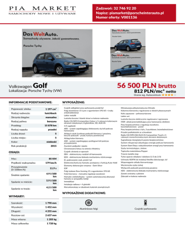 Zadzwoń: 32 746 92 20 Napisz: [email protected] Numer oferty: V001136 Volkswagen Golf 56 500 PLN brutto 812 PLN/mc* netto Lokalizacja: Porsche Tychy (VW) Ocena wg. Autocentrum: INFORMACJE PODSTAWOWE: WYPOSAŻENIE: Pojemność silnika: 1 197 cm3 Rodzaj nadwozia: hatchback Skrzynia biegów: Rodzaj paliwa: Przebieg: Rodzaj napędu: manualna benzyna 15 878 km przedni Czujnik odległości przy parkowaniu przód/tył Klimatyzacja półautomatyczna Climatic Felgi aluminiowe 15 Lyon z ogumieniem 195/65 + śruby antykradzieżowe Kolumna kierownicy regulowana w dwóch płaszczyznach Lakier metalik Lakier uni Lusterka boczne i klamki drzwi w kolorze nadwozia Lusterka boczne elektrycznie regulowane i ogrzewane Radio CD/MP3 Composition Colour z 5 calowym kolorowym ekranem dotykowym, 8 głośników, SD, AUX-IN MSR- układ przeciwblokujący przy hamowaniu silnikiem 4/5 zagłówki Pasy bezpieczeństwa z regulacją wysokości, bezwładnościowe - przód ABS - system zapobiegający blokowaniu się kół podczas hamowania Pasy bezpieczeństwa z tyłu, 3-punktowe, bezwładnościowe Liczba drzwi: 5 Airbag 6 sztuk (czołowe poduszki kierowcy i pasażera, boczne poduszki - przód, kurtyny powietrzne) Liczba miejsc: 5 Airbag kolan kierowcy Kolor: Rok produkcji: niebieski 2015 OSIĄGI: Moc: Prędkość maksymalna Przyspieszenie [0-100km/h]: 85 KM 179 km/h 11.9 s Średnie spalanie: 4.9 l/100 km Spalanie w mieście: 5.9 l/100 km Spalanie w trasie: 4.2 l/100 km Koło zapasowe - pełnowymiarowe ASR - system zapobiegający poślizgowi kół podczas przyspieszania Przedni podłokietnik ze schowkiem Radio CD/MP3/SD/AUX-IN Composition Touch z 5 calowym monochromatycznym ekranem dotykowym Sygnalizacja niezapiętych pasów bezpieczeństwa System rekuperacji odzyskujący energię podczas hamowania Asystent podjazdu i zjazdu System Start/Stop z odzyskiwaniem energii przy hamowaniu Chromowane listwy na osłonie chłodnicy Szyby termoizolujące, zielone Czujnik ciśnienia w oponach Tapicerka materiałowa Pepper EBV - elektroniczny rozdział sił hamowania Trzecie światło stop EDS - elektroniczna blokada mechanizmu różnicowego Tylne oparcie składane i dzielone (1/3 do 2/3) El. podnoszenie szyb, przód i tył Uchwyty ISOFIX do instalacji fotelika dziecięcego, tył Elektromechaniczny hamulec postojowy z funkcją Auto-Hold Wspomaganie układu kierowniczego Elementy dekoracyjne wnętrza - Dark Silver Wycieraczka szyby tylnej ESP Wyłącznik poduszki powietrznej pasażera Felgi stalowe flow-forming 15 z ogumieniem 195/65 XDS - elektroniczna blokada mechanizmu różnicowego Fotel kierowcy - manualna regulacja wysokości Zamek centralny z pilotem Hamulec wielokolizyjny - system automatycznej aktywacji hamulca w przypadku kolizji Zderzaki w kolorze nadwozia Immobilizer Instalacja radiowa + 4 głośniki Kierunkowskazy w obudowie lusterek zewnętrznych WYPOSAŻENIE DODATKOWE: WYMIARY: Szerokość: 1 790 mm Wysokość: 1 452 mm Długość: 4 255 mm Rozstaw osi: 2 637 mm Masa własna: 1 205 kg Masa całkowita: 1 720 kg Aluminiowe felgi Czujniki parkowania BEZPIECZEŃSTWO: ABS - system zapobiegający blokowaniu się kół podczas hamowania Airbag 6 sztuk (czołowe poduszki kierowcy i pasażera, boczne poduszki przód, kurtyny powietrzne) Airbag kolan kierowcy ESP Pasy bezpieczeństwa z regulacją wysokości, bezwładnościowe - przód Pasy bezpieczeństwa z tyłu, 3-punktowe, bezwładnościowe Wyłącznik poduszki powietrznej pasażera *Rata leasingu Niniejsza informacja oraz kalkulacja dotyczy produktów Porsche Inter Auto Polska Sp. z o.o. Niniejsza informacja nie stanowi oferty w rozumieniu kodeksu cywilnego. Kalkulacja ma jedynie charakter poglądowy i szacunkowy, oparta jest na wskazanych powyżej założeniach; zarówno wskazana cena produktu, jak i wyliczona rata leasingowa mogą ulec zmianie. Informacja nie stanowi gwarancji dostępności produktu. Ostateczne warunki, w tym cenę i wysokość raty leasingowej, określa umowa. Oferta ma charakter informacyjny, nie stanowi oferty handlowej w rozumieniu Art. 66. § 1 Kodeksu Cywilnego.