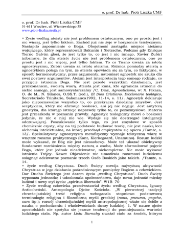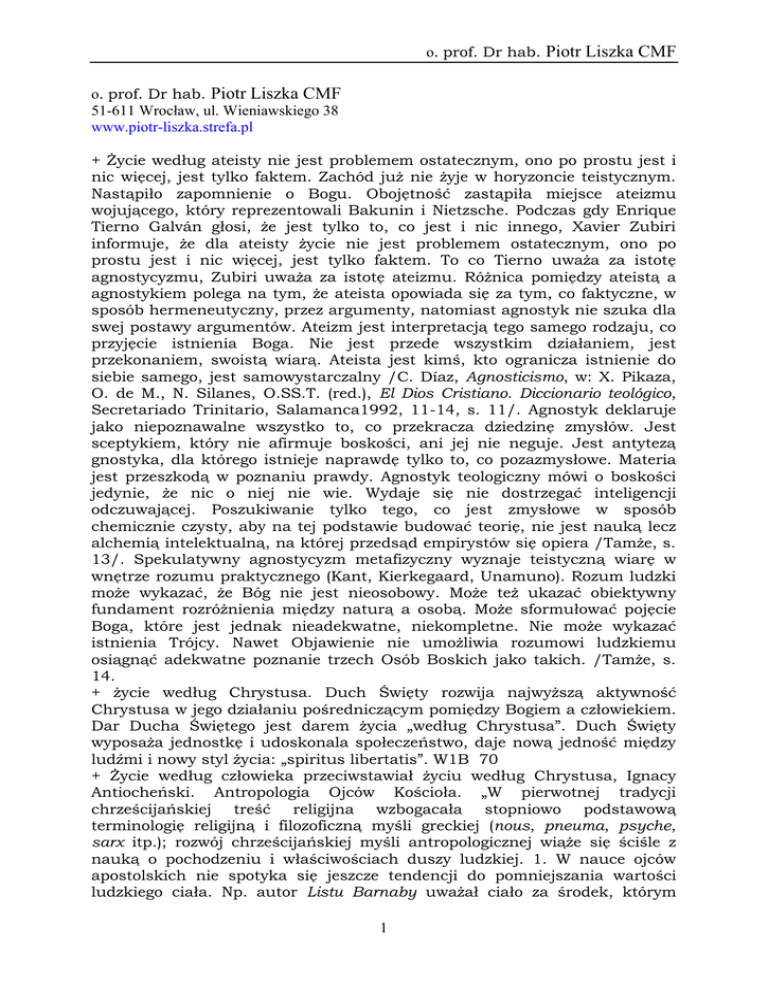 o. prof. Dr hab. Piotr Liszka CMF o. prof. Dr hab. Piotr Liszka CMF 51-611 Wrocław, ul. Wieniawskiego 38 www.piotr-liszka.strefa.pl + Życie według ateisty nie jest problemem ostatecznym, ono po prostu jest i nic więcej, jest tylko faktem. Zachód już nie żyje w horyzoncie teistycznym. Nastąpiło zapomnienie o Bogu. Obojętność zastąpiła miejsce ateizmu wojującego, który reprezentowali Bakunin i Nietzsche. Podczas gdy Enrique Tierno Galván głosi, że jest tylko to, co jest i nic innego, Xavier Zubiri informuje, że dla ateisty życie nie jest problemem ostatecznym, ono po prostu jest i nic więcej, jest tylko faktem. To co Tierno uważa za istotę agnostycyzmu, Zubiri uważa za istotę ateizmu. Różnica pomiędzy ateistą a agnostykiem polega na tym, że ateista opowiada się za tym, co faktyczne, w sposób hermeneutyczny, przez argumenty, natomiast agnostyk nie szuka dla swej postawy argumentów. Ateizm jest interpretacją tego samego rodzaju, co przyjęcie istnienia Boga. Nie jest przede wszystkim działaniem, jest przekonaniem, swoistą wiarą. Ateista jest kimś, kto ogranicza istnienie do siebie samego, jest samowystarczalny /C. Díaz, Agnosticismo, w: X. Pikaza, O. de M., N. Silanes, O.SS.T. (red.), El Dios Cristiano. Diccionario teológico, Secretariado Trinitario, Salamanca1992, 11-14, s. 11/. Agnostyk deklaruje jako niepoznawalne wszystko to, co przekracza dziedzinę zmysłów. Jest sceptykiem, który nie afirmuje boskości, ani jej nie neguje. Jest antytezą gnostyka, dla którego istnieje naprawdę tylko to, co pozazmysłowe. Materia jest przeszkodą w poznaniu prawdy. Agnostyk teologiczny mówi o boskości jedynie, że nic o niej nie wie. Wydaje się nie dostrzegać inteligencji odczuwającej. Poszukiwanie tylko tego, co jest zmysłowe w sposób chemicznie czysty, aby na tej podstawie budować teorię, nie jest nauką lecz alchemią intelektualną, na której przedsąd empirystów się opiera /Tamże, s. 13/. Spekulatywny agnostycyzm metafizyczny wyznaje teistyczną wiarę w wnętrze rozumu praktycznego (Kant, Kierkegaard, Unamuno). Rozum ludzki może wykazać, że Bóg nie jest nieosobowy. Może też ukazać obiektywny fundament rozróżnienia między naturą a osobą. Może sformułować pojęcie Boga, które jest jednak nieadekwatne, niekompletne. Nie może wykazać istnienia Trójcy. Nawet Objawienie nie umożliwia rozumowi ludzkiemu osiągnąć adekwatne poznanie trzech Osób Boskich jako takich. /Tamże, s. 14. + życie według Chrystusa. Duch Święty rozwija najwyższą aktywność Chrystusa w jego działaniu pośredniczącym pomiędzy Bogiem a człowiekiem. Dar Ducha Świętego jest darem życia „według Chrystusa”. Duch Święty wyposaża jednostkę i udoskonala społeczeństwo, daje nową jedność między ludźmi i nowy styl życia: „spiritus libertatis”. W1B 70 + Życie według człowieka przeciwstawiał życiu według Chrystusa, Ignacy Antiocheński. Antropologia Ojców Kościoła. „W pierwotnej tradycji chrześcijańskiej treść religijna wzbogacała stopniowo podstawową terminologię religijną i filozoficzną myśli greckiej (nous, pneuma, psyche, sarx itp.); rozwój chrześcijańskiej myśli antropologicznej wiąże się ściśle z nauką o pochodzeniu i właściwościach duszy ludzkiej. 1. W nauce ojców apostolskich nie spotyka się jeszcze tendencji do pomniejszania wartości ludzkiego ciała. Np. autor Listu Barnaby uważał ciało za środek, którym 1 o. prof. Dr hab. Piotr Liszka CMF posłużył się Chrystus, by się nam ukazać, wobec czego nie może być ono złe samo w sobie. Klemens Rzymski uważał ludzkie ciało za objawienie Ducha, świątynię Boga i pojmował je jako coś sakralnego; stosunek zaś ducha do ciała przypomina mu stosunek Chrystusa do jego Kościoła (2 Kor 14, 4-5); duch bowiem otwiera horyzonty boskie, ciało – ziemskie. Ignacy Antiocheński, uważając Chrystusa za nowego człowieka, życie według człowieka przeciwstawiał życiu według Chrystusa; podobnie autor Listu do Diogneta wyjaśniał, że chrześcijanie są w ciele, lecz nie żyją według ciała (5, 5); nie ciało jest złe, a duch dobry, gdyż o ich wartości decyduje stosunek do wartości wiecznych; dusza zamknięta w ciele, jednak je ogarnia; dusza nieśmiertelna mieszka w ciele śmiertelnym. 2. Większą ścisłość terminologiczną spotyka się w interpretacjach antropologicznych apologetów II wieku. Justyn twierdził, że człowieka jest z natury stworzeniem rozumnym, złożonym z duszy i ciała; zjednoczenie tych dwóch elementów jest nieodzowne; jeżeli Bóg powołał człowieka do zmartwychwstania, obydwa muszą brać w nim udział. Nieśmiertelność nie jest więc cechą wynikającą z natury duszy, lecz przywilejem danym przez Boga. Pierwszym dziełem ściśle antropologiczno-psychologicznym jest De anima Tertuliana; według niego człowiek jest ogniwem zespalającym dwie substancje, włączone jedna w drugą, które muszą być związane nawzajem; dusza jest subtelnym ciałem (wszystko, co istnieje, uważa Tertulian za cielesne), które ożywia wszystkie części ciała; naturę jej najlepiej wyjaśnia określenie tchnienie Boga” W. Hryniewicz, A. Nossol, Antropologia teologiczna V B. Dzieje, w: Encyklopedia Katolicka, t. 1, red. F. Gryglewicz, R. Łukaszyk, Z. Sułowski, Lublin 1985, 694-698, kol. 694. + Życie według Ducha dąży do tego, czego chce Duch. „Teraz jednak dla tych, którzy są w Chrystusie Jezusie, nie ma już potępienia. Albowiem prawo Ducha, który daje życie w Chrystusie Jezusie, wyzwoliło cię spod prawa grzechu i śmierci. Co bowiem było niemożliwe dla Prawa, ponieważ ciało czyniło je bezsilnym, [tego dokonał Bóg]. On to zesłał Syna swego w ciele podobnym do ciała grzesznego i dla [usunięcia] grzechu wydał w tym ciele wyrok potępiający grzech, aby to, co nakazuje Prawo, wypełniło się w nas, o ile postępujemy nie według ciała, ale według Ducha. Ci bowiem, którzy żyją 
