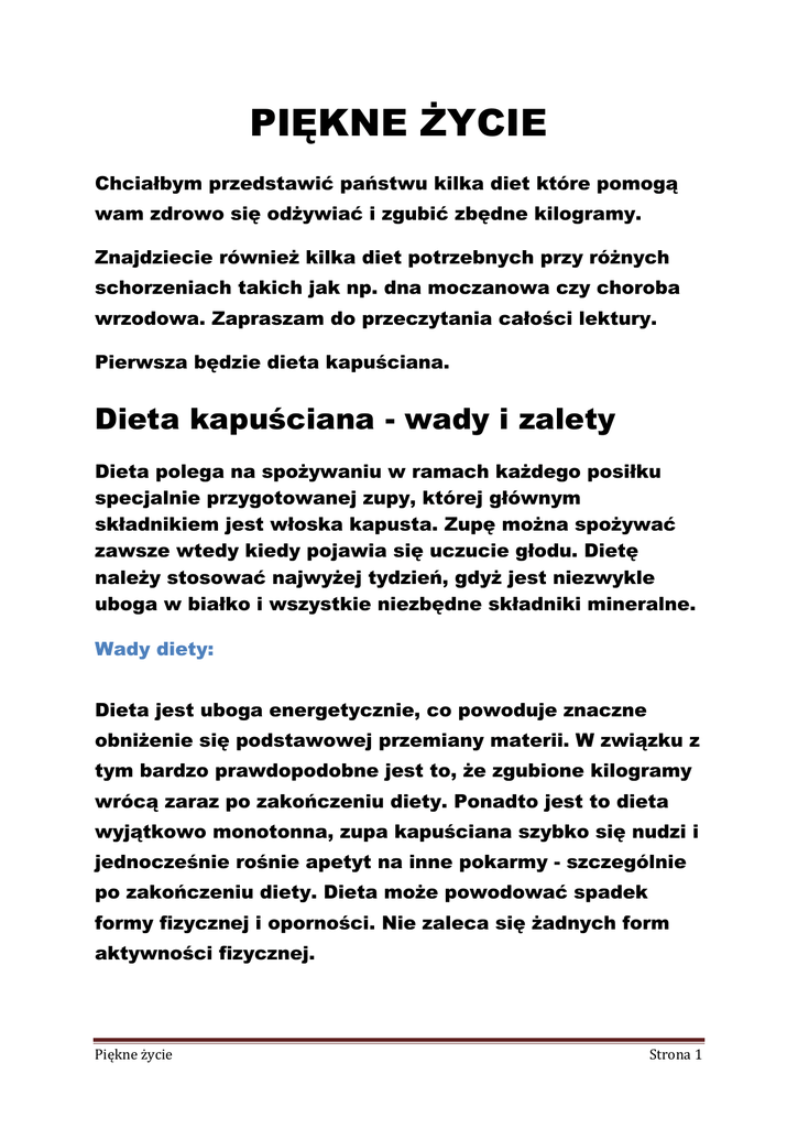 PIĘKNE ŻYCIE Chciałbym przedstawić państwu kilka diet które pomogą wam zdrowo się odżywiać i zgubić zbędne kilogramy. Znajdziecie również kilka diet potrzebnych przy różnych schorzeniach takich jak np. dna moczanowa czy choroba wrzodowa. Zapraszam do przeczytania całości lektury. Pierwsza będzie dieta kapuściana. Dieta kapuściana - wady i zalety Dieta polega na spożywaniu w ramach każdego posiłku specjalnie przygotowanej zupy, której głównym składnikiem jest włoska kapusta. Zupę można spożywać zawsze wtedy kiedy pojawia się uczucie głodu. Dietę należy stosować najwyżej tydzień, gdyż jest niezwykle uboga w białko i wszystkie niezbędne składniki mineralne. Wady diety: Dieta jest uboga energetycznie, co powoduje znaczne obniżenie się podstawowej przemiany materii. W związku z tym bardzo prawdopodobne jest to, że zgubione kilogramy wrócą zaraz po zakończeniu diety. Ponadto jest to dieta wyjątkowo monotonna, zupa kapuściana szybko się nudzi i jednocześnie rośnie apetyt na inne pokarmy - szczególnie po zakończeniu diety. Dieta może powodować spadek formy fizycznej i oporności. Nie zaleca się żadnych form aktywności fizycznej. Piękne życie Strona 1 Zalety diety: Jest prosta w przygotowaniu. Ponadto prawdopodobnie nie odczuwa się głodu, gdyż spożywanie zupy jest możliwe zawsze kiedy tylko pojawia się na to ochota. Dieta ta pozwala schudnąć bardzo szybko, jednak nie jest skuteczna na dłuższą metę, gdyż traci się głównie wodę, a dodatkowo obniża się podstawowa przemiana materii. Kolejną będzie dieta Kopenhaska. Dieta Kopenhaska - wady i zalety Jest to bardzo restrykcyjna i niskokaloryczna dieta. Posiłki należy jeść trzy razy dziennie o ustalonych porach. Diety nie można ani skracać ani wydłużać. W ciągu dnia trzeba wypijać około dwóch litrów wody. Wady diety: Jest zdecydowanie zbyt uboga energetycznie. Nie dostarcza organizmowi niezbędnych składników odżywczych, mineralnych i witamin. Należy wyjątkowo skrupulatnie przestrzegać składu i godzin posiłków. Dieta wymaga bardzo wielu wyrzeczeń, gdyż jej jadłospis jest niezwykle ubogi. Największą wadą tej diety jest to, że efekt jojo występuje w zasadzie natychmiast po zakończeniu diety i powrocie do „normalnego” jedzenia. Piękne życie Strona 2 Zalety diety: Posiłki są proste w przygotowaniu. Dieta pozwala szybko schudnąć, jednak bardzo często występujący efekt jojo nie pozawala na uznanie tego za pełnowartościową zaletę. Dieta Cambridge - wady i zalety Program polega na tym, że przez kilka tygodni je się wyłącznie posiłki przygotowane z gotowych preparatów. Są to zupy, batony lub koktajle. Energetyczność diety wynosi około 400 – 500 kcal. Wady diety: Nie pokrywa zapotrzebowania na składniki odżywcze, witaminy ani składniki mineralne. Dzienny limit energii w tej diecie (400 -500 kcal) powoduje obniżenie podstawowej przemiany materii, w związku z czym prawdopodobieństwo efektu jojo to niemal 100%. Tak drastyczne ograniczenie kalorii skutkujące wspomnianym obniżeniem podstawowej przemiany materii spowoduje, że kolejne, bardziej racjonalnie dobrane diety mogą nie przynosić oczekiwanych rezultatów. Przy stosowaniu tej diety mogą pojawić się zaparcia. Ponadto nie można uprawiać żadnej aktywności fizycznej, ze względu na zbyt małą energetyczność diety (samo to sugeruje, że ta dieta nie może być bezpieczna dla zdrowia). Absolutnie nie można stosować jej podczas Piękne życie Strona 3 przyjmowania jakichkolwiek leków, gdyż tak mała ilość pożywienia zaburza ich wchłanianie i stwarza zagrożenie zaburzenia pracy narządów. Zalety diety: Powoduje bardzo szybki spadek wagi, jednak z uwagi na fakt, iż bardzo często występuje po niej efekt jojo, nie można uznać tego za pełnowartościową zaletę. A teraz coś na święta i nowy rok. Piękna i lekka na Sylwestra! Boisz się, że po Świętach nie zmieścisz się w swoją wymarzoną suknię sylwestrową? Że będziesz czuć się ciężko i nieatrakcyjnie? W tym roku nie musisz się tym martwić! Dzięki naszej diecie przedsylwestrowej na Sylwestra zachwycisz wszystkich pięknym wyglądem i nieskazitelną figurą: Co musisz wiedzieć o diecie przedsylwestrowej? Piękne życie Strona 4 Jest to trzydniowe oczyszczanie po świątecznych kulinarnych szaleństwach To dieta niskokaloryczna, która pozwoli Ci poczuć się lekko i szczupło Dzięki specjalnej recepturze dieta sprawi, że brzuch stanie się płaski Możesz być pewna, że gdy zastosujesz naszą dietę, nie będzie nawet najmniejszego śladu po świątecznych przysmakach! Dieta noworoczna Początek nowego roku zawsze wiąże się z wieloma planami, nadzieją oraz postanowieniami, że coś się zmieni, że ten rok będzie lepszy, bardziej aktywny, że osiągniemy zamierzony sukces! Po jakimś czasie jednak pojawia się szara rzeczywistość i zapał maleje. Postanowienia przechodzą na kolejny rok… Tym razem nie musi tak być! Pomożemy Ci spełnić noworoczne obietnice i schudnąć przy pomocy naszej nowej diety! Co sprawia, że wszyscy którzy zastosują naszą dietę noworoczną spełnią swoje postanowienia i osiągną dietetyczny sukces? Przede wszystkim dieta ta różni się od innych ponieważ jest układana przez profesjonalnych, doświadczonych dietetyków. Piękne życie Strona 5 Nie musisz ciągle jeść tego samego – ile to już razy zdarzyło Ci się podchodzić do prób odchudzania, które kończyły się po tygodniu? Tym razem tak nie będzie. Nasza dieta zapewnia bogactwo smaków, wiele przepisów na dietetyczne dania dzięki czemu możesz, spośród wielu naszych propozycji, najbardziej w danym dniu odpowiednią. Jeżeli nie masz czasu na gotowanie wymyślnych potraw, nasza dieta jest też dla Ciebie. Uwzględniany jest w niej czas jaki możesz poświęcić na przygotowanie posiłków – jesz smacznie, lekko i szybko! Dzięki temu, że indywidualnie dobi
