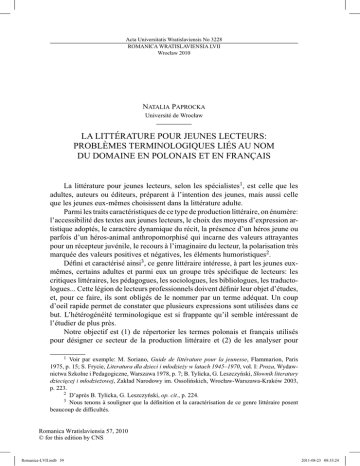 Acta Universitatis Wratislaviensis No 3228 ROMANICA WRATISLAVIENSIA LVII Wrocław 2010 NATALIA PAPROCKA Université de Wrocław LA LITTÉRATURE POUR JEUNES LECTEURS: PROBLÈMES TERMINOLOGIQUES LIÉS AU NOM DU DOMAINE EN POLONAIS ET EN FRANÇAIS La littérature pour jeunes lecteurs, selon les spécialistes1, est celle que les adultes, auteurs ou éditeurs, préparent à l’intention des jeunes, mais aussi celle que les jeunes eux-mêmes choisissent dans la littérature adulte. Parmi les traits caractéristiques de ce type de production littéraire, on énumère: l’accessibilité des textes aux jeunes lecteurs, le choix des moyens d’expression artistique adoptés, le caractère dynamique du récit, la présence d’un héros jeune ou parfois d’un héros-animal anthropomorphisé qui incarne des valeurs attrayantes pour un récepteur juvénile, le recours à l’imaginaire du lecteur, la polarisation très marquée des valeurs positives et négatives, les éléments humoristiques2. Défini et caractérisé ainsi3, ce genre littéraire intéresse, à part les jeunes euxmêmes, certains adultes et parmi eux un groupe très spécifique de lecteurs: les critiques littéraires, les pédagogues, les sociologues, les bibliologues, les traductologues... Cette légion de lecteurs professionnels doivent définir leur objet d’études, et, pour ce faire, ils sont obligés de le nommer par un terme adéquat. Un coup d’oeil rapide permet de constater que plusieurs expressions sont utilisées dans ce but. L’hétérogénéité terminologique est si frappante qu’il semble intéressant de l’étudier de plus près. Notre objectif est (1) de répertorier les termes polonais et français utilisés pour désigner ce secteur de la production littéraire et (2) de les analyser pour 1 Voir par exemple: M. Soriano, Guide de littérature pour la jeunesse, Flammarion, Paris 1975, p. 15; S. Frycie, Literatura dla dzieci i młodzieży w latach 1945–1970, vol. I: Proza, Wydawnictwa Szkolne i Pedagogiczne, Warszawa 1978, p. 7; B. Tylicka, G. Leszczyński, Słownik literatury dziecięcej i młodzieżowej, Zakład Narodowy im. Ossolińskich, Wrocław-Warszawa-Kraków 2003, p. 223. 2 D’après B. Tylicka, G. Leszczyński, op. cit., p. 224. 3 Nous tenons à souligner que la définition et la caractérisation de ce genre littéraire posent beaucoup de difficultés. Romanica Wratislaviensia 57, 2010 © for this edition by CNS Romanica-LVII.indb 59 2011-08-23 08:33:24 60 Natalia Paprocka essayer d’expliquer quelles sont les raisons de la coexistence d’autant de termes synonymes, au moins au premier abord, pour dénommer une même notion. Nous rappelons que la synonymie, selon Daniel Gouadec, « est une notion ultrarestrictive exigeant que soient satisfaites en même temps deux conditions absolues qui sont, entre le terme et le synonyme, l’identité de référent dans le cadre d’une identité d’indexation PLUS l’identité des conditions d’utilisation »4. Pour le terminologue rennais, de tels synonymes sont extrêmement rares, voire inexistants. Car, pour Gouadec, si deux termes désignent en apparence le même référent, c’est que, en réalité, ce référent n’est pas tout à fait le même (première condition), ou bien que leurs conditions d’emploi sont différentes (seconde condition). Dans le premier cas, il s’agit de deux notions distinctes (donc de deux termes), dans le second, on a affaire à ce que Gouadec appelle des « variantes »5. Notre analyse a donc aussi pour but de vérifier si les termes si nombreux servant à désigner le domaine de la littérature pour jeunes lecteurs sont de vrais synonymes, c’est-à-dire s’ils remplissent les deux conditions. Afin de relever les termes que les spécialistes emploient pour désigner la littérature pour lecteurs non-adultes, nous avons analysé environ 130 publications polonaises et françaises qui y sont consacrées, principalement des écrits des critiques littéraires; ceux des pédagogues et bibliologues ne constituent qu’une marge étroite de ce corpus. Le point de départ de notre choix de textes polonais a été le livre de Stanisław Frycie Współczesna nauka o literaturze dla dzieci i młodzieży i jej przedstawiciele6 où sont esquissés les silhouettes des représentants les plus importants de la théorie et de la critique littéraire polonaise, ainsi que leurs oeuvres. Pour le côté français, nous avons analysé la bibliographie des publications consacrées à la littérature pour jeunes lecteurs que propose sur son site Internet Jean-Paul Gourévitch7, grand spécialiste français du domaine. Nous avons prêté une attention particulière aux expressions génériques utilisées dans les titres des publications, ainsi que dans les titres de leurs parties constitutives (chapitres, sous-chapitres...) car, selon nous, le choix des termes pour ces éléments privilégiés du texte n’est jamais innocent. Nous avons aussi étudié de rares considérations des auteurs sur la terminologie et sur les concepts qui se cachent derrière elle. En analysant la diversité terminologique, nous prenons en considération ses deux facettes: 1. Premièrement, nous l’observons du point de vue formel: nous passons en revue les termes génériques coexistants qui désignent le concept de littérature pour 4 5 6 7 D. Gouadec, Terminologie. Constitution des données, Afnor, Paris 1990, p. 56. Ibidem, p. 56. Wydawnictwo Wydziału Zamiejscowego kieleckiej WSP, Piotrków Trybunalski 1996. http://jean_paul.gourevitch.perso.sfr.fr/enfant/biblio.html. Romanica Wratislaviensia 57, 2010 © for this edition by CNS Romanica-LVII.indb 60 2011-08-23 08:33:24 La littérature pour jeunes lecteurs 61 les jeunes, d’abord selon les constructions multiples qui complètent les noms literatura et littérature, puis selon le nombre des désignations (noms, groupes nominaux ou adjectifs) relatives aux classes d’âge utilisées dans les termes généri