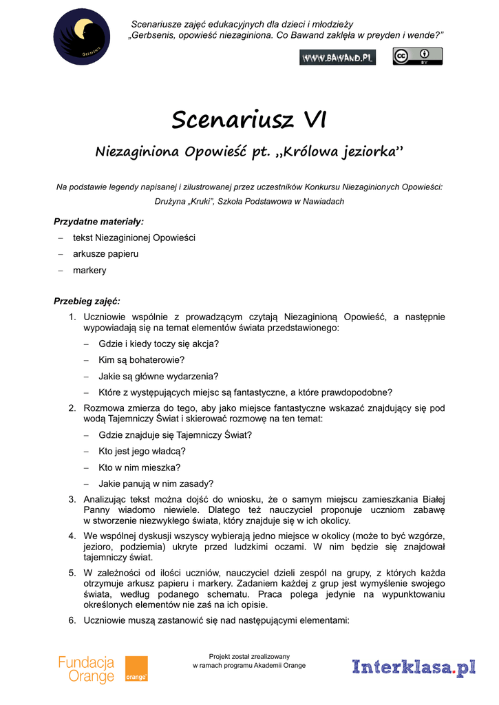 Scenariusze zajęć edukacyjnych dla dzieci i młodzieży „Gerbsenis, opowieść niezaginiona. Co Bawand zaklęła w preyden i wende?” Scenariusz VI Niezaginiona Opowieść pt. „Królowa jeziorka” Na podstawie legendy napisanej i zilustrowanej przez uczestników Konkursu Niezaginionych Opowieści: Drużyna „Kruki”, Szkoła Podstawowa w Nawiadach Przydatne materiały: tekst Niezaginionej Opowieści arkusze papieru markery Przebieg zajęć: 1. Uczniowie wspólnie z prowadzącym czytają Niezaginioną Opowieść, a następnie wypowiadają się na temat elementów świata przedstawionego: Gdzie i kiedy toczy się akcja? Kim są bohaterowie? Jakie są główne wydarzenia? Które z występujących miejsc są fantastyczne, a które prawdopodobne? 2. Rozmowa zmierza do tego, aby jako miejsce fantastyczne wskazać znajdujący się pod wodą Tajemniczy Świat i skierować rozmowę na ten temat: Gdzie znajduje się Tajemniczy Świat? Kto jest jego władcą? Kto w nim mieszka? Jakie panują w nim zasady? 3. Analizując tekst można dojść do wniosku, że o samym miejscu zamieszkania Białej Panny wiadomo niewiele. Dlatego też nauczyciel proponuje uczniom zabawę w stworzenie niezwykłego świata, który znajduje się w ich okolicy. 4. We wspólnej dyskusji wszyscy wybierają jedno miejsce w okolicy (może to być wzgórze, jezioro, podziemia) ukryte przed ludzkimi oczami. W nim będzie się znajdował tajemniczy świat. 5. W zależności od ilości uczniów, nauczyciel dzieli zespól na grupy, z których każda otrzymuje arkusz papieru i markery. Zadaniem każdej z grup jest wymyślenie swojego świata, według podanego schematu. Praca polega jedynie na wypunktowaniu określonych elementów nie zaś na ich opisie. 6. Uczniowie muszą zastanowić się nad następującymi elementami: Projekt został zrealizowany w ramach programu Akademii Orange Scenariusze zajęć edukacyjnych dla dzieci i młodzieży „Gerbsenis, opowieść niezaginiona. Co Bawand zaklęła w preyden i wende?” wygląd miejsca i jego cechy charakterystyczne mieszkańcy osiągnięcia cywilizacyjne i rozwój nauki zajęcia codzienne i obyczaje zwierzęta i rośliny zasady kontaktów z innymi światami wskazówki dla obcych 7. Na zajęciach przedstawiają wyniki swojej pracy i z pomocą nauczyciela oraz wskazówek innych grup precyzują swoje notatki. 8. Zadaniem jest stworzenie przewodnika po danym miejscu, który będzie się składał z wymienionych rozdziałów. Do każdego rozdziału należy także zamieścić ilustracje np. mieszkańców czy wynalazków. Gotowe prace zostaną zamieszczone na stronie internetowej. Projekt został zrealizowany w ramach programu Akademii Orange Scenariusze zajęć edukacyjnych dla dzieci i młodzieży „Gerbsenis, opowieść niezaginiona. Co Bawand zaklęła w preyden i wende?” Legenda o Królowej Jeziorka Był spokojny, cichy wieczór. Pewien pan przechodził obok jeziora, w którym anioły ukryły dzwony z kościoła w Prusinowie. Człowiek ten spacerował już kilka minut, gdy w pewnym momencie usłyszał bicie dzwonów z głębi wody. Przestraszony szybko wrócił do domu i nikomu nie powiedział, gdzie był . Dopiero gdy nastał ranek, ów pan opowiedział swojej rodzinie, co mu się przydarzyło. Jego żona mówiła, że to mu się tylko wydawało, że to niemożliwe. Jedyna córka rolników – piętnastoletnia Amelia uwierzyła w słowa ojca i długo myślała o tym, co opowiedział. Kilka dni później rano, gdy matka chciała obudzić dziewczynę do szkoły, nie zastała córki w łóżku, ale obok na szafeczce znalazła kartkę: ,,Mamo i Tato! Zaciekawiła mnie historia, którą opowiedział tata. Ciągle o tym myślę, w snach słyszę bicie tego dzwonu, poszłam więc go poszukać. Wasza kochająca Amelka.” Zrozpaczona żona zawołała męża i płacząc pokazała mu kartkę mówiąc, że to jest jego wina. Rolnik bardzo się zasmucił, łzy napłynęły mu do oczu. Oboje postanowili niezwłocznie poszukać córki. W tym samym czasie Amelia już stała nad brzegiem jeziora i wytężała słuch, aby usłyszeć bicie dzwonów. Nic jednak takiego się nie stało i wtedy dziewczyna przypomniała sobie, że dzwony słychać tylko podczas bardzo cichej nocy. Amelia wiedziała, że rodzice będą jej tu szukać i dlatego wybrała się na wzgórze. Rodzice, tak jak myślała ich córka, poszli jej szukać nad jezioro. Nie znaleźli tam Amelii, więc przeszukali całą wieś. Nikt jej jednak tam nie widział. Załamani rodzice wrócili do domu. W tym samym czasie dziewczyna stała przed górą, gdy ta się nagle otworzyła, jakby miała niewidzialne wrota. Na ten niesamowity widok Amelia chciała uciekać, lecz nie mogła ruszyć się z miejsca. Wtedy z góry wyszła piękna pani w śnieżnobiałej, długiej sukni. Była to Biała Panna. Amelka stała oniemiała jak słup soli. Co tu robisz? – zapytała zjawa. Ja… ja… chciałam się ukryć przed rodzicami – jąkała się przejęta dziewczyna. Dlaczego? Ja… ja… chcę znaleźć dzwony ukryte w jeziorze – cicho wyznała prawdę. Dzwony?! – w głosie Białej Panny było słychać zdziwienie i strach – skąd wiesz o dzwonach? – dociekała. Mój tata słyszał bicie tych dzwonów. Ach! Słyszał je! To bardzo niedobrze! – lamentowała - ale jesteś pewna, że je słyszał, tak? Tak – odrzekła dziewczyna. Lepiej wracaj do domu i nie szukaj tych dzwonów – powiedziała biała zjawa. Dlaczego? To ja kazałam aniołom je ukryć w głębinach jeziora. Te dzwony są niebezpieczne. Jak to? Dzwony mogą być groźne? Przez nie jestem tu uwięziona, wewnątrz tej góry… - głos Białej Panny był cichy i smutny. Co się stało? Opowiesz?- zaciekawiła się Amelka. Cóż… no dobrze ,opowiem. I zaczęła swoją historię: Kiedyś, gdy jeszcze byłam młodą Projekt został zrealizowany w ramach programu Akademii Orange Scenariusze zajęć edukacyjnych dla dzieci i młodzieży „Gerbsenis, opowieść niezaginio
