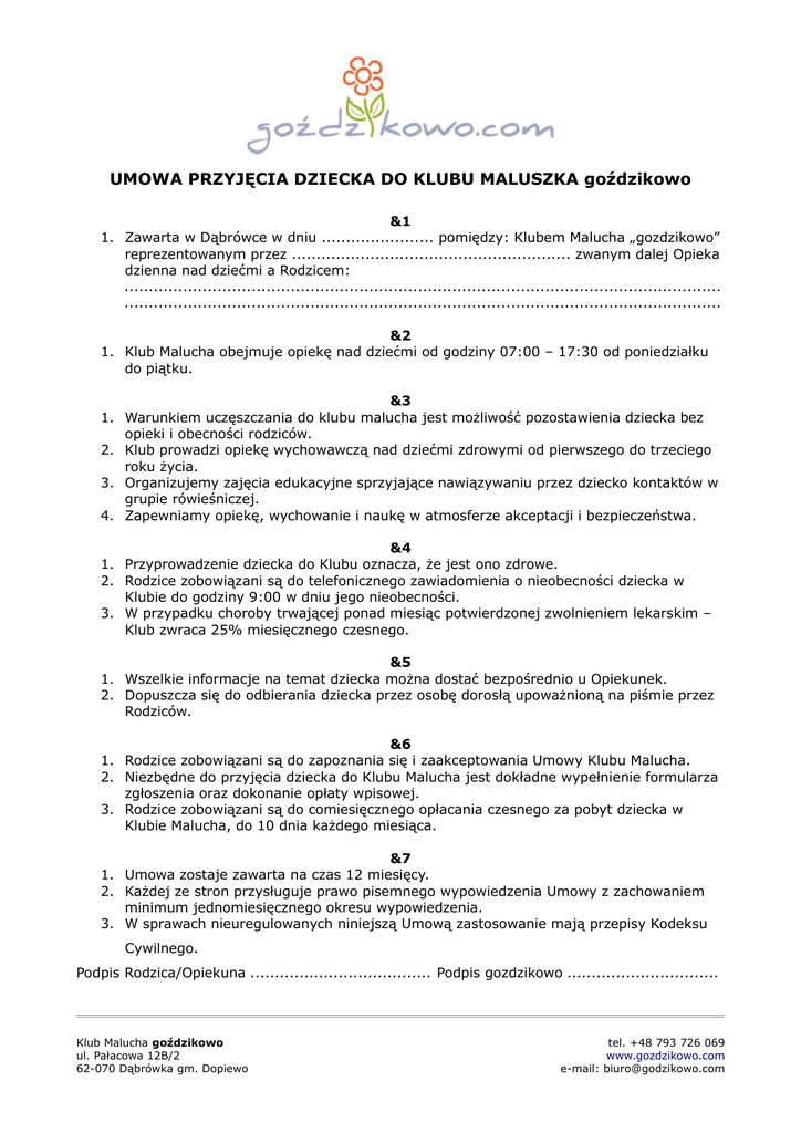 UMOWA PRZYJĘCIA DZIECKA DO KLUBU MALUSZKA goździkowo &1 1. Zawarta w Dąbrówce w dniu ....................... pomiędzy: Klubem Malucha „gozdzikowo” reprezentowanym przez ......................................................... zwanym dalej Opieka dzienna nad dziećmi a Rodzicem: .......................................................................................................................... .......................................................................................................................... &2 1. Klub Malucha obejmuje opiekę nad dziećmi od godziny 07:00 – 17:30 od poniedziałku do piątku. &3 1. Warunkiem uczęszczania do klubu malucha jest możliwość pozostawienia dziecka bez opieki i obecności rodziców. 2. Klub prowadzi opiekę wychowawczą nad dziećmi zdrowymi od pierwszego do trzeciego roku życia. 3. Organizujemy zajęcia edukacyjne sprzyjające nawiązywaniu przez dziecko kontaktów w grupie rówieśniczej. 4. Zapewniamy opiekę, wychowanie i naukę w atmosferze akceptacji i bezpieczeństwa. &4 1. Przyprowadzenie dziecka do Klubu oznacza, że jest ono zdrowe. 2. Rodzice zobowiązani są do telefonicznego zawiadomienia o nieobecności dziecka w Klubie do godziny 9:00 w dniu jego nieobecności. 3. W przypadku choroby trwającej ponad miesiąc potwierdzonej zwolnieniem lekarskim – Klub zwraca 25% miesięcznego czesnego. &5 1. Wszelkie informacje na temat dziecka można dostać bezpośrednio u Opiekunek. 2. Dopuszcza się do odbierania dziecka przez osobę dorosłą upoważnioną na piśmie przez Rodziców. &6 1. Rodzice zobowiązani są do zapoznania się i zaakceptowania Umowy Klubu Malucha. 2. Niezbędne do przyjęcia dziecka do Klubu Malucha jest dokładne wypełnienie formularza zgłoszenia oraz dokonanie opłaty wpisowej. 3. Rodzice zobowiązani są do comiesięcznego opłacania czesnego za pobyt dziecka w Klubie Malucha, do 10 dnia każdego miesiąca. &7 1. Umowa zostaje zawarta na czas 12 miesięcy. 2. Każdej ze stron przysługuje prawo pisemnego wypowiedzenia Umowy z zachowaniem minimum jednomiesięcznego okresu wypowiedzenia. 3. W sprawach nieuregulowanych niniejszą Umową zastosowanie mają przepisy Kodeksu Cywilnego. Podpis Rodzica/Opiekuna ..................................... Podpis gozdzikowo ............................... Klub Malucha goździkowo ul. Pałacowa 12B/2 62-070 Dąbrówka gm. Dopiewo tel. +48 793 726 069 www.gozdzikowo.com e-mail: [email protected]