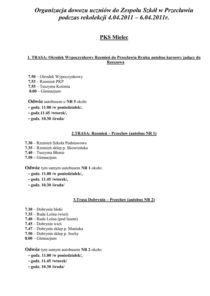 Organizacja dowozu uczniów do Zespołu Szkół w Przecławiu podczas rekolekcji 4.04.2011 – 6.04.2011r. PKS Mielec 1. TRASA: Ośrodek Wypoczynkowy Rzemień do Przecławia Rynku autobus kursowy jadący do Rzeszowa 7.50 – Ośrodek Wypoczynkowy 7.53 – Rzemień PKP 7.55 – Tuszyma Kolonia 8.00 – Gimnazjum Odwóz autobusem o NR 5 około - godz. 11.00 /w poniedziałek/, - godz.11.45 /wtorek/, - godz. 10.30 /środa/ 2.TRASA: Rzemień – Przecław (autobus NR 1) 7.30 – Rzemień Szkoła Podstawowa 7.35 – Rzemień sklep p. Skowrońska 7.40 – Tuszyma Błonie 7.50 – Gimnazjum Odwóz tym samym autobusem NR 1 około: - godz. 11.00 /w poniedziałek/, - godz. 11.45 /wtorek/, - godz. 10.30 /środa/ 3.Trasa Dobrynin – Przecław (autobus NR 2) 7.30 – Dobrynin bloki 7.35 – Ruda Leśna (wieś) 7.40 – Ruda Leśna (pod lasem) 7.45 – Dobrynin wieś 7.47 – Dobrynin sklep p. Muniaka 7.50 – Dobrynin sklep p. Sochy 8.00 – Gimnazjum Odwóz tym samym autobusem NR 2 około: - godz. 11.00 /w poniedziałek/, - godz. 11.45 /wtorek/ - godz. 10.30 /środa/ 4.Trasa: Zaborcze – Przecław (autobus NR 3) 7.20 – Zaborcze 7.25 – Wylów 7.30 – Wólka Błońska 7.35 – Gimnazjum Odwóz tym samym autobusem NR 3 około: - godz. 11.00 /w poniedziałek/, - godz. 11.45 /wtorek/ W odwrotnej kolejności przystanków 7.40 – Kiełków szkoła 7.43 – Kiełków remiza 7.50 – Błonie 7.55 – Gimnazjum Odwóz tym samym autobusem NR 3 około - godz. 11.20 /w poniedziałek/, - godz. 12.05 /wtorek/ - godz. 10.30 /środa/ w następującej kolejności przystanków: Błonie Kiełków remiza Kiełków szkoła Zaborcze Wylów Wólka Błońska Gimnazjum 5.Trasa: Łączki Brzeskie – Przecław (autobus NR 4) 7.20 – Łączki Brzeskie końcowy 7.23 - Łączki Brzeskie szkoła 7.30 – Łączki Brzeskie kościół 7.35 – Poręby 7.40 – Leśniczówka 7.50 – Gimnazjum Odwóz tym samym autobusem NR 4 około - godz. 11.00 /w poniedziałek/, - godz. 11.45 /wtorek/, - godz. 10.30 /środa/ 06.04.2011r. – przejazd do kina w Mielcu – 2 autobusy (seans godz. 12 00) godz. 11.20 – odjazd z Gimnazjum godz. 13.45 - powrót TRASY POWROTU Autobus nr 1 Mielec Kiełków – szkoła podstawowa Kiełków – remiza Kiełków – Błonie Przecław – Rynek Podlesie Poręby Łączki Brzeskie Wylów Zaborcze Mielec Autobus nr 2 Mielec Rzemień – Ośrodek Rzemień – Szkoła podstawowa Rzemień – Sklep p. Skowrońskiej Dobrynin – Sklep p. Sochy Dobrynin – sklep p. Muniaka Dobrynin - wieś Ruda Leśna Dobrynin Bloki Dobrynin Błonie Tuszyma Kolonia Mielec Organizacja dowozu uczniów do Zespołu Szkół w Przecławiu podczas rekolekcji 4.04.2011 – 6.04.2011r. PKS Dębica I Kurs: 7.10 – Dąbie SUW 7.12 – Wola Ociecka 7.14 - Dąbie PK 7.15 – Dąbie 7.18 – Tuszyma nowa szkoła 7.19 – Tuszyma stara szkoła 7.20 – Tuszyma sklep. P. Cynkra 7.25 – Tuszyma Dezako 7.30 – Gimnazjum II Kurs: 7.40 – Biały Bór szkoła 7.42 – Biały Bór – Blizna 7.44 – Biały Bór – Błonie 7.46 – Tuszyma remiza 7.55 - Gimnazjum Odwozy z parkingu pod gimnazjum tym samym autobusem w odwrotnej kolejności : - około godz. 11.00/w poniedziałek/, 11.45 /wtorek/, 10.30 - /środa/ - około godz. 11.20 /w poniedziałek/, 12.05 /wtorek/ 10.50 – /środa/ I kurs w kierunku Białego Boru II kurs w kierunku Tuszymy i Dąbia 06.04.2011r. – przejazd do kina w Mielcu – 1 autobus (seans godz. 12 00) godz. 11.20 – odjazd z Gimnazjum Powrót z Mielca około 13.45 wg trasy: Mielec Tuszyma sklep p. Cynkra Biały Bór – szkoła Biały Bór – Blizna Biały Bór – Błonie Tuszyma – remiza Tuszyma – stara szkoła Tuszyma – nowa szkoła Tuszyma – Dezako Dąbie Dąbie PKP Wola Ociecka Dąbie SUW