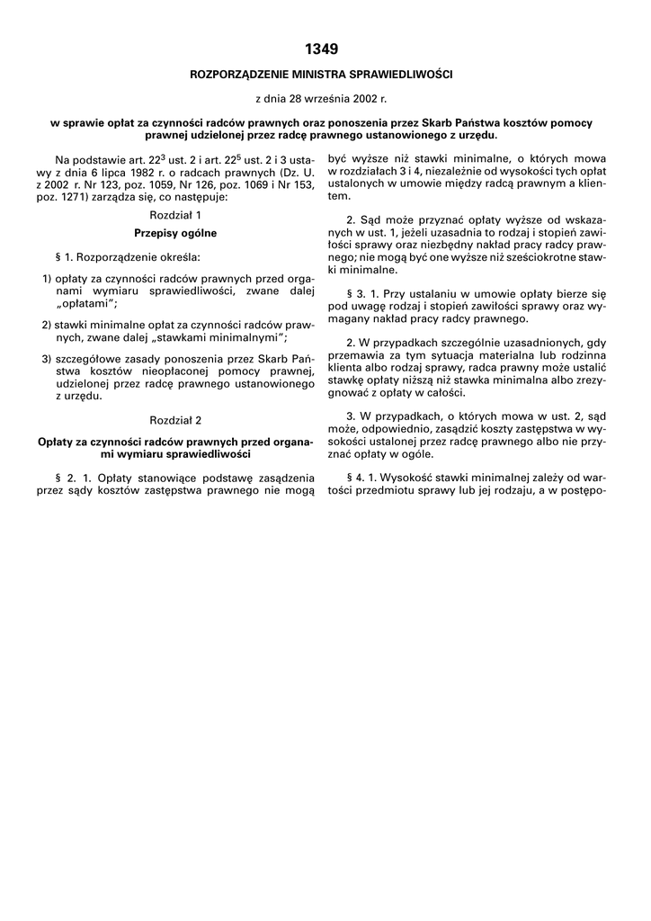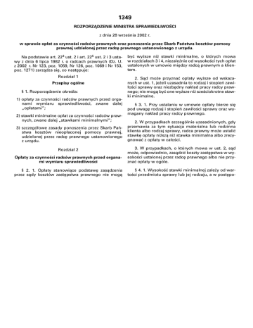 1349 ROZPORZÑDZENIE MINISTRA SPRAWIEDLIWOÂCI z dnia 28 wrzeÊnia 2002 r. w sprawie op∏at za czynnoÊci radców prawnych oraz ponoszenia przez Skarb Paƒstwa kosztów pomocy prawnej udzielonej przez radc´ prawnego ustanowionego z urz´du. Na podstawie art. 223 ust. 2 i art. 225 ust. 2 i 3 ustawy z dnia 6 lipca 1982 r. o radcach prawnych (Dz. U. z 2002 r. Nr 123, poz. 1059, Nr 126, poz. 1069 i Nr 153, poz. 1271) zarzàdza si´, co nast´puje: byç wy˝sze ni˝ stawki minimalne, o których mowa w rozdzia∏ach 3 i 4, niezale˝nie od wysokoÊci tych op∏at ustalonych w umowie mi´dzy radcà prawnym a klientem. Rozdzia∏ 1 2. Sàd mo˝e przyznaç op∏aty wy˝sze od wskazanych w ust. 1, je˝eli uzasadnia to rodzaj i stopieƒ zawi∏oÊci sprawy oraz niezb´dny nak∏ad pracy radcy prawnego; nie mogà byç one wy˝sze ni˝ szeÊciokrotne stawki minimalne. Przepisy ogólne § 1. Rozporzàdzenie okreÊla: 1) op∏aty za czynnoÊci radców prawnych przed organami wymiaru sprawiedliwoÊci, zwane dalej „op∏atami”; 2) stawki minimalne op∏at za czynnoÊci radców prawnych, zwane dalej „stawkami minimalnymi”; 3) szczegó∏owe zasady ponoszenia przez Skarb Paƒstwa kosztów nieop∏aconej pomocy prawnej, udzielonej przez radc´ prawnego ustanowionego z urz´du. § 3. 1. Przy ustalaniu w umowie op∏aty bierze si´ pod uwag´ rodzaj i stopieƒ zawi∏oÊci sprawy oraz wymagany nak∏ad pracy radcy prawnego. 2. W przypadkach szczególnie uzasadnionych, gdy przemawia za tym sytuacja materialna lub rodzinna klienta albo rodzaj sprawy, radca prawny mo˝e ustaliç stawk´ op∏aty ni˝szà ni˝ stawka minimalna albo zrezygnowaç z op∏aty w ca∏oÊci. Op∏aty za czynnoÊci radców prawnych przed organami wymiaru sprawiedliwoÊci 3. W przypadkach, o których mowa w ust. 2, sàd mo˝e, odpowiednio, zasàdziç koszty zast´pstwa w wysokoÊci ustalonej przez radc´ prawnego albo nie przyznaç op∏aty w ogóle. § 2. 1. Op∏aty stanowiàce podstaw´ zasàdzenia przez sàdy kosztów zast´pstwa prawnego nie mogà § 4. 1. WysokoÊç stawki minimalnej zale˝y od wartoÊci przedmiotu sprawy lub jej rodzaju, a w post´po- Rozdzia∏ 2 Dziennik Ustaw Nr 163 — 10429 — waniu egzekucyjnym — od wartoÊci egzekwowanego roszczenia. 2. W razie zmiany w toku post´powania wartoÊci stanowiàcej podstaw´ obliczenia op∏at, bierze si´ pod uwag´ wartoÊç zmienionà, poczynajàc od nast´pnej instancji. § 5. WysokoÊç stawek minimalnych w sprawach nieokreÊlonych w rozporzàdzeniu ustala si´, przyjmujàc za podstaw´ stawk´ w sprawach o najbardziej zbli˝onym rodzaju. Poz. 1349 1) zabezpieczenie spadku, dokonanie spisu inwentarza, odrzucenie spadku, og∏oszenie testamentu i nakazanie jego z∏o˝enia, zarzàdu spadku nieobj´tego i wyjawienie przedmiotów spadkowych — 60 z∏; 2) stwierdzenie nabycia spadku — 60 z∏, a je˝eli przedmiotem post´powania jest równie˝ wa˝noÊç testamentu — 360 z∏; Rozdzia∏ 3 3) dzia∏ spadku — stawk´ obliczonà na podstawie § 6 od wartoÊci udzia∏u spadkowego uczestnika zast´powanego przez radc´ prawnego, a w razie dzia∏u na zgodny wniosek uczestników post´powania — 50% tej stawki. Stawki minimalne w sprawach cywilnych, ze stosunku pracy i ubezpieczeƒ spo∏ecznych § 9. Stawki minimalne wynoszà za prowadzenie spraw o: § 6. Stawki minimalne wynoszà przy wartoÊci przedmiotu sprawy: 1) opró˝nienie lokalu mieszkalnego — 120 z∏; 2) wydanie nieruchomoÊci rolnej — 360 z∏; 1) do 500 z∏ — 60 z∏; 2) powy˝ej 500 z∏ do 1 500 z∏ — 180 z∏; 3) powy˝ej 1 500 z∏ do 5 000 z∏ — 600 z∏; 3) wydanie innej nieruchomoÊci i opró˝nienie lokalu u˝ytkowego — stawk´ obliczonà na podstawie § 6 od wartoÊci szeÊciomiesi´cznego czynszu. 4) powy˝ej 5 000 z∏ do 10 000 z∏ — 1 200 z∏; § 10. 1. Stawki minimalne wynoszà za prowadzenie spraw: 5) powy˝ej 10 000 z∏ do 50 000 z∏ — 2 400 z∏; 1) o uchylenie uchwa∏y organu spó∏dzielni — 180 z∏; 6) powy˝ej 50 000 z∏ do 200 000 z∏ — 3 600 z∏; 2) o ochron´ dóbr osobistych i ochron´ praw autorskich — 360 z∏; 7) powy˝ej 200 000 z∏ — 7 200 z∏. § 7. Stawki minimalne wynoszà za prowadzenie spraw z zakresu w∏asnoÊci, innych praw rzeczowych i prawa o ksi´gach wieczystych: 3) z zakresu post´powania nieprocesowego w sprawie niewymienionej odr´bnie — 120 z∏; 4) o uchylenie wyroku sàdu polubownego — 1 200 z∏; 1) o stwierdzenie zasiedzenia w∏asnoÊci nieruchomoÊci — 50% stawki obliczonej na podstawie § 6; 5) z zakresu post´powania uk∏adowego lub upad∏oÊciowego — 1 800 z∏; 2) o rozgraniczenie — 360 z∏; 6) o uznanie orzeczenia sàdu zagranicznego — 240 z∏; 3) dotyczàcych s∏u˝ebnoÊci — 240 z∏; 7) egzekucyjnych przy egzekucji z nieruchomoÊci — 50% stawki obliczonej na podstawie § 6, a przy egzekucji innego rodzaju — 25% tej stawki; 4) o naruszenie posiadania — 156 z∏; 5) o wpis w ksi´dze wieczystej lub z∏o˝enie dokumentu do zbioru dokumentów — 120 z∏; 8) ze skargi na czynnoÊci komornika — 60 z∏; 9) rejestracji spó∏ki — 1 200 z∏; 6) o zniesienie wspó∏w∏asnoÊci — stawk´ obliczonà na podstawie § 6 od wartoÊci udzia∏u wspó∏w∏aÊciciela zast´powanego przez radc´ prawnego, a w wypadku zgodnego wniosku uczestników — 50% tej stawki; 10) rejestracji spó∏dzielni — 1 800 z∏; 11) innych rejestracji — 600 z∏; 12) zmian w rejestrze — 360 z∏; 7) zwiàzanych z korzystaniem z rzeczy wspólnej lub z zarzàdem rzeczà wspólnà — 240 z∏; 13) o zaopatrzenie tytu∏u egzekucyjnego w klauzul´ wykonalnoÊci — 60 z∏; 8) o usuni´cie niezgodnoÊci mi´dzy treÊcià wpisu w ksi´dze wieczystej a rzeczywistym stanem prawnym — 50% stawki obliczonej na podstawie § 6 od wartoÊci prawa dotkni´tego niezgodnoÊcià. 14) o zwolnienie spod zaj´cia rzeczy i praw zabezpieczonych w post´powaniu karnym u osoby podejrzanej o pope∏nienie przest