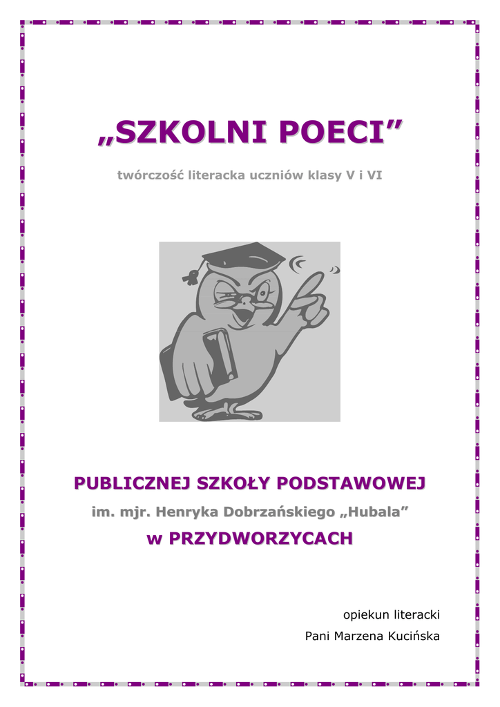 „SZKOLNI POECI” twórczość literacka uczniów klasy V i VI PUBLICZNEJ SZKOŁY PODSTAWOWEJ im. mjr. Henryka Dobrzańskiego „Hubala” w PRZYDWORZYCACH opiekun literacki Pani Marzena Kucińska Wiosna Jak co roku w marcu, kiedy śnieg nam ginie już najwyższa pora zapomnieć o zimie. To panienka wiosna nieśmiało się skrada, zamiast śniegu tylko deszczyk pada. Słychać śpiew skowronka i słowicze trele Nawet czas zmieniamy w najbliższą niedzielę. Wszystkie te zdarzenia, dziatwo moja miła Oznajmiają jedno – Wiosna nam wróciła! Katarzyna Narojczyk uczennica kl. V 2 Wiosna Wiosna już radosna i rozkoszna. Wiosną są rabatki, czyli kwiatki. Dzieci tańczą na wietrze krótko i cichutko. Barwna dama wśród dzieci śpiewa jak szumią drzewa. Jest kałuża, ale nie burza, bo dla dzieci słońce świeci. Wszystkie bazie się kłaniają wiośnie, pięknie i radośnie. Już wiatr nie wieje, bo słońce daje nadzieję. Przeszły już zawieje i biały śnieg topnieje. Lód na rzekach pęka, ale to nie udręka. Wiosna, wiosna to z pewnością Pora radosna! Patrycja Pomarańska uczennica kl. V 3 Wiosna Ciepła kurtka już jest zdjęta ciepłe buty też, piękna wiosna się zaczęła, kwitnie krokus i pachnący bez. Dzieci chodzą już na spacer i spędzają miło czas, bo piękna i kolorowa wiosna zawitała u nas. Magda Jabłońska uczennica kl. VI 4 Wiosna Malowniczy krajobraz wita Cię, za oknem wiosna rozpoczyna się. Kwiaty kwitną, trawa się zieleni, już się nie bieli. Kwiaty kwitnące, piękne słońce, pachną bzy, nie ma kry. Tam, daleko wierzby płaczą, A gdzieś blisko dzieci skaczą. Gdzieś ze strumyka woda tryska, a od słońca się cos błyska. Sylwia Kocyk uczennica kl. VI 5 Wiosna Tuż za płotem obok domu wychylają po kryjomu trzy krokusy fioletowe, miny mają zaś różowe. Bo wesolutką minę mają jak na świat patrzą, gdy dokoła kolorowo i zielono jaskółeczki, skowroneczki zaczynają swe piosneczki. Kiedy słońce w marcu świeci bocian zaraz do Polski przyleci. Agnieszka Stańczyk uczennica kl. V 6 Wiosna Nadchodzi wiosna Pełna życia, zielona, radosna. Kwiaty ma w koszyku I rozrzuca je bez liku. Ptaki zza morza powracają, Swoje gniazdka odnawiają. W polu słychać śpiew skowronka Zielenieją drzewa, zielenieje łąka. Rolnicy w pole wyruszają, Bo pracy dużo mają. Wesołe jest życie rolnika, Któremu po polu dzik bryka. Jakże pięknie i wesoło, Kiedy wiosna jest wokoło. Dni są dłuższe i cieplejsze Ja o tobie wiosno piszę wiersze. Mateusz Szczepaniak uczeń kl. VI 7