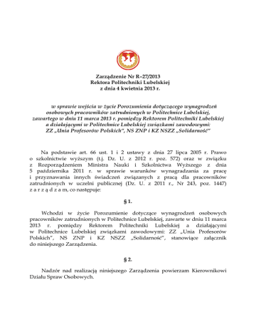 Projekt Zarządzenie Nr R–27/2013 Rektora Politechniki Lubelskiej z dnia 4 kwietnia 2013 r. w sprawie wejścia w życie Porozumienia dotyczącego wynagrodzeń osobowych pracowników zatrudnionych w Politechnice Lubelskiej, zawartego w dniu 11 marca 2013 r. pomiędzy Rektorem Politechniki Lubelskiej a działającymi w Politechnice Lubelskiej związkami zawodowymi: ZZ „Unia Profesorów Polskich”, NS ZNP i KZ NSZZ „Solidarność” Na podstawie art. 66 ust. 1 i 2 ustawy z dnia 27 lipca 2005 r. Prawo o szkolnictwie wyższym (t.j. Dz. U. z 2012 r. poz. 572) oraz w związku z Rozporządzeniem Ministra Nauki i Szkolnictwa Wyższego z dnia 5 października 2011 r. w sprawie warunków wynagradzania za pracę i przyznawania innych świadczeń związanych z pracą dla pracowników zatrudnionych w uczelni publicznej (Dz. U. z 2011 r., Nr 243, poz. 1447) z a r z ą d z a m, co następuje: § 1. Wchodzi w życie Porozumienie dotyczące wynagrodzeń osobowych pracowników zatrudnionych w Politechnice Lubelskiej, zawarte w dniu 11 marca 2013 r. pomiędzy Rektorem Politechniki Lubelskiej a działającymi w Politechnice Lubelskiej związkami zawodowymi: ZZ „Unia Profesorów Polskich”, NS ZNP i KZ NSZZ „Solidarność”, stanowiące załącznik do niniejszego Zarządzenia. § 2. Nadzór nad realizacją niniejszego Zarządzenia powierzam Kierownikowi Działu Spraw Osobowych. § 3. Traci moc Zarządzenie Nr R-11/2007 Rektora Politechniki Lubelskiej z dnia 9 lutego 2007 r. w sprawie wejścia w życie Porozumienia w sprawie wynagrodzeń osobowych pracowników Politechniki Lubelskiej w działalności dydaktycznej i pomocy materialnej dla studentów zawartego w dniu 30 stycznia 2007 r. pomiędzy Rektorem Politechniki Lubelskiej – dr hab. inż. Józefem Kuczmaszewskim, prof. PL, a działającymi w Politechnice Lubelskiej związkami zawodowymi: ZZ „Unia Profesorów Polskich”, NS ZNP i KZ NSZZ „Solidarność”. § 4. Zarządzenie wchodzi w życie z dniem podpisania. Rektor Prof. dr hab. inż. Piotr Kacejko Załącznik do Zarządzania Nr R-27/2013 Rektora Politechniki Lubelskiej z dnia 4 kwietnia 2013 r. Porozumienie dotyczące wynagrodzeń osobowych pracowników zatrudnionych w Politechnice Lubelskiej, zawarte w dniu 11 marca 2013 r. pomiędzy Rektorem Politechniki Lubelskiej a działającymi w Politechnice Lubelskiej związkami zawodowymi: ZZ „Unia Profesorów Polskich”, NS ZNP i KZ NSZZ „Solidarność” W wyniku przeprowadzonych uzgodnień pomiędzy Rektorem a upoważnionymi przedstawicielami związków zawodowych, dotyczących wynagrodzeń osobowych dla pracowników Politechniki Lubelskiej, ustalono: Pracownik Politechniki Lubelskiej nie wcześniej niż na 2 lata przed osiągnięciem wieku uprawniającego go do przejścia na emeryturę może ubiegać się o podwyższenie wynagrodzenia o 20% stawki ostatniego wynagrodzenia zasadniczego dla nauczycieli akademickich zatrudnionych na umowę o pracę i o 22% stawki ostatniego wynagrodzenia zasadniczego dla pracowników niebędących nauczycielami akademickimi. Warunkiem ubiegania się o podwyższone wynagrodzenie jest złożenie przez pracownika pisemnego wniosku o rozwiązaniu umowy o pracę na czas nieokreślony na zasadzie porozumienia stron. Ponowne zawarcie umowy o pracę na czas określony następuje maksymalnie na okres 24 miesięcy i co najmniej do dnia osiągnięcia ustawowego wieku emerytalnego.