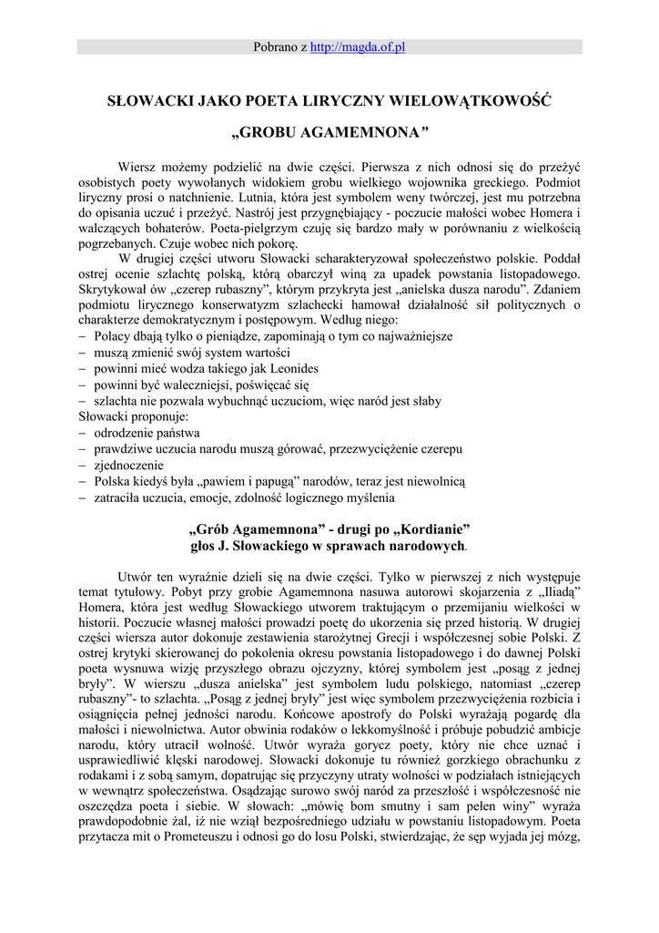 Pobrano z http://magda.of.pl SŁOWACKI JAKO POETA LIRYCZNY WIELOWĄTKOWOŚĆ „GROBU AGAMEMNONA” Wiersz moŜemy podzielić na dwie części. Pierwsza z nich odnosi się do przeŜyć osobistych poety wywołanych widokiem grobu wielkiego wojownika greckiego. Podmiot liryczny prosi o natchnienie. Lutnia, która jest symbolem weny twórczej, jest mu potrzebna do opisania uczuć i przeŜyć. Nastrój jest przygnębiający - poczucie małości wobec Homera i walczących bohaterów. Poeta-pielgrzym czuję się bardzo mały w porównaniu z wielkością pogrzebanych. Czuje wobec nich pokorę. W drugiej części utworu Słowacki scharakteryzował społeczeństwo polskie. Poddał ostrej ocenie szlachtę polską, którą obarczył winą za upadek powstania listopadowego. Skrytykował ów „czerep rubaszny”, którym przykryta jest „anielska dusza narodu”. Zdaniem podmiotu lirycznego konserwatyzm szlachecki hamował działalność sił politycznych o charakterze demokratycznym i postępowym. Według niego: − Polacy dbają tylko o pieniądze, zapominają o tym co najwaŜniejsze − muszą zmienić swój system wartości − powinni mieć wodza takiego jak Leonides − powinni być waleczniejsi, poświęcać się − szlachta nie pozwala wybuchnąć uczuciom, więc naród jest słaby Słowacki proponuje: − odrodzenie państwa − prawdziwe uczucia narodu muszą górować, przezwycięŜenie czerepu − zjednoczenie − Polska kiedyś była „pawiem i papugą” narodów, teraz jest niewolnicą − zatraciła uczucia, emocje, zdolność logicznego myślenia „Grób Agamemnona” - drugi po „Kordianie” głos J. Słowackiego w sprawach narodowych. Utwór ten wyraźnie dzieli się na dwie części. Tylko w pierwszej z nich występuje temat tytułowy. Pobyt przy grobie Agamemnona nasuwa autorowi skojarzenia z „Iliadą” Homera, która jest według Słowackiego utworem traktującym o przemijaniu wielkości w historii. Poczucie własnej małości prowadzi poetę do ukorzenia się przed historią. W drugiej części wiersza autor dokonuje zestawienia staroŜytnej Grecji i współczesnej sobie Polski. Z ostrej krytyki skierowanej do pokolenia okresu powstania listopadowego i do dawnej Polski poeta wysnuwa wizję przyszłego obrazu ojczyzny, której symbolem jest „posąg z jednej bryły”. W wierszu „dusza anielska” jest symbolem ludu polskiego, natomiast „czerep rubaszny”- to szlachta. „Posąg z jednej bryły” jest więc symbolem przezwycięŜenia rozbicia i osiągnięcia pełnej jedności narodu. Końcowe apostrofy do Polski wyraŜają pogardę dla małości i niewolnictwa. Autor obwinia rodaków o lekkomyślność i próbuje pobudzić ambicje narodu, który utracił wolność. Utwór wyraŜa gorycz poety, który nie chce uznać i usprawiedliwić klęski narodowej. Słowacki dokonuje tu równieŜ gorzkiego obrachunku z rodakami i z sobą samym, dopatrując się przyczyny utraty wolności w podziałach istniejących w wewnątrz społeczeństwa. Osądzając surowo swój naród za przeszłość i współczesność nie oszczędza poeta i siebie. W słowach: „mówię bom smutny i sam pełen winy” wyraŜa prawdopodobnie Ŝal, iŜ nie wziął bezpośredniego udziału w powstaniu listopadowym. Poeta przytacza mit o Prometeuszu i odnosi go do losu Polski, stwierdzając, Ŝe sęp wyjada jej mózg, Pobrano z http://magda.of.pl co sugeruje, Ŝe Polakom brak mądrości do zmiany własnego losu. Dokonując tak surowej krytyki wydarzeń w Polsce w ostatnich dziesiątkach lat autor ma świadomość, Ŝe nie zyska tym uznania, a nawet zrazi do siebie odbiorców tekstu. Czyni to jednak powodowany troską o losy ojczyzny bez względu na konsekwencje.