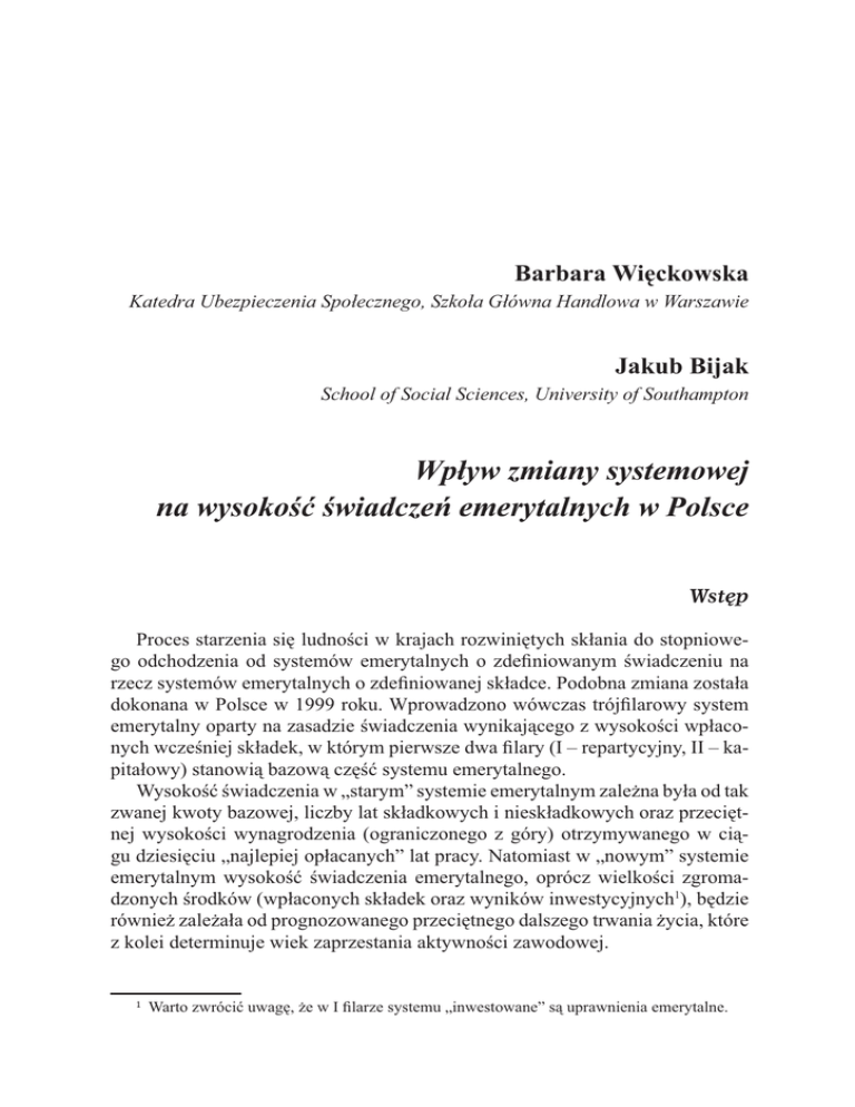 Barbara Więckowska Katedra Ubezpieczenia Społecznego, Szkoła Główna Handlowa w Warszawie Jakub Bijak School of Social Sciences, University of Southampton Wpływ zmiany systemowej na wysokość świadczeń emerytalnych w Polsce Wstęp Proces starzenia się ludności w krajach rozwiniętych skłania do stopniowego odchodzenia od systemów emerytalnych o zdefiniowanym świadczeniu na rzecz systemów emerytalnych o zdefiniowanej składce. Podobna zmiana została dokonana w Polsce w 1999 roku. Wprowadzono wówczas trójfilarowy system emerytalny oparty na zasadzie świadczenia wynikającego z wysokości wpłaconych wcześniej składek, w którym pierwsze dwa filary (I – repartycyjny, II – kapitałowy) stanowią bazową część systemu emerytalnego. Wysokość świadczenia w „starym” systemie emerytalnym zależna była od tak zwanej kwoty bazowej, liczby lat składkowych i nieskładkowych oraz przeciętnej wysokości wynagrodzenia (ograniczonego z góry) otrzymywanego w ciągu dziesięciu „najlepiej opłacanych” lat pracy. Natomiast w „nowym” systemie emerytalnym wysokość świadczenia emerytalnego, oprócz wielkości zgromadzonych środków (wpłaconych składek oraz wyników inwestycyjnych1), będzie również zależała od prognozowanego przeciętnego dalszego trwania życia, które z kolei determinuje wiek zaprzestania aktywności zawodowej. 1 Warto zwrócić uwagę, że w I filarze systemu „inwestowane” są uprawnienia emerytalne. 184 Barbara Więckowska, Jakub Bijak Celem artykułu jest przedstawienie wpływu dokonanej zmiany w zakresie finansowania systemu zabezpieczenia emerytalnego na wysokość świadczeń emerytalnych z części bazowej systemu, z równoczesnym naciskiem na wpływ metodologii szacowania przeciętnego dalszego trwania życia na otrzymane wyniki.2 Artykuł składa się z dwóch części. W pierwszej zaprezentowano metody obliczania świadczenia emerytalnego w systemie bazowym przed i po zmianie w 1999 roku oraz pokazano wpływ metody obliczeń na szacowanie przeciętnego dalszego trwania życia. W części drugiej dokonano oszacowania wysokości świadczeń emerytalnych dla czterech hipotetycznych świadczeniobiorców różniących się otrzymywanym wynagrodzeniem (50%, 100%, 250% i 300% wartości przeciętnej) oraz wiekiem podjęcia decyzji o zakończeniu aktywności zawodowej (60 lat i 65 lat). W podsumowaniu przedstawiono wielkość szacowanego deficytu środków w systemie bazowym wynikającego z niedoszacowania zjawiska długowieczności w obecnym kształcie systemu zabezpieczenia emerytalnego. Świadczenia emerytalne w Polsce – aspekt określania wysokości świadczeń Obliczanie świadczenia w ramach „starego” systemu zabezpieczenia emerytalnego Zgodnie z art. 53 Ustawy z dnia 17 grudnia 1998 roku o emeryturach i rentach z Funduszu Ubezpieczeń Społecznych (UEiR; DzU nr 162 poz. 1118 ze zm.) na wysokość świadczenia emerytalnego składa się suma następujących elementów: 1) 24% kwoty bazowej, 2) po 1,3% podstawy jej wymiaru za każdy rok okresów składkowych, 3) po 0,7% podstawy jej wymiaru za każdy rok okresów nieskładkowych. Kwota bazowa wynosi 100% przeciętnego wynagrodzenia pomniejszonego o potrącone od ubezpieczonych składki na ubezpieczenia społeczne (art. 19 UEiR), określone w przepisach o systemie ubezpieczeń społecznych w poprzednim roku kalendarzowym. Kwota bazowa jest ustalana corocznie i obowiązuje od dnia 1 marca każdego roku kalendarzowego do końca lutego następnego roku kalendarzowego. Jej wysokość w 2009 roku wynosi 2578,26 zł. Ponieważ ta część świadczenia emerytalnego jest jednakowa dla wszystkich świadczeniobiorców określana jest mianem części socjalnej (Szumlicz 2005, s. 147). Lata składkowe i nieskładkowe zostały wymienione enumeratywnie w art. 6 i 7 UEiR, przy czym lata nieskładkowe nie mogą stanowić więcej niż jedną trzecią lat składkowych. Należy podkreślić, że nie jest to podział dychotomicznych Ze względu na cel pracy, w opracowaniu zostanie pominięta analiza rozwiązań, które będą funkcjonowały w okresach przejściowych opisanych w art. 183 Ustawy z dnia 17 grudnia 1998 roku o emeryturach i rentach z Funduszu Ubezpieczeń Społecznych (DzU Nr 162 poz. 1118 ze zm.) oraz analiza wpływu kapitału początkowego na wysokość świadczeń emerytalnych. 2 Wpływ zmiany systemowej na wysokość świadczeń emerytalnych w Polsce 185 lat aktywności zawodowej – istnieją również lata, które nie zostaną zaliczone ani do lat składkowych, ani do lat nieskładkowych, na przykład okres bezrobocia bez prawa do zasiłku dla bezrobotnych. Punktem wyjścia do obliczenia wysokości podstawy wymiaru emerytury jest wysokość podstawy wymiaru składki na ubezpieczenia społeczne oraz otrzymane zasiłki i świadczenia3 w ciągu 10 kolejnych lat kalendarzowych wybranych przez przyszłego emeryta z ostatnich 20 lat kalendarzowych poprzedzających bezpośrednio rok, w którym zgłoszono wniosek o emeryturę (najczęściej są to lata, w których kwoty te były najwyższe). Podstawa wymiaru świadczenia emerytalnego jest ustalana indywidualnie dla każdego przyszłego emeryta. Jej wysokość obliczana jest następująco (art. 15 p. 4 UEiR): 1) Na początku oblicza się sumę kwot podstaw wymiaru składek i kwot za każdy rok z wybranych przez zainteresowanego lat kalendarzowych. 2) Następnie oblicza się stosunek każdej z tych sum kwot do rocznej kwoty przeciętnego wynagrodzenia ogłoszonej za dany rok kalendarzowy, wyrażając go w procentach. 3) W dalszej kolejności oblicza się średnią arytmetyczną tych wielkości procentowych; wartość ta stanowi wskaźnik wysokości podstawy wymiaru emerytury. 4) Na koniec kwotę bazową mnoży się przez wyznaczony uprzednio wskaźnik otrzymując tym samym podstawę wymiaru emerytury. Należy podkreślić, że wskaźnik wysokości podstawy wymiaru emerytury jest ograniczony z góry i nie może być wyższy niż 250% 
