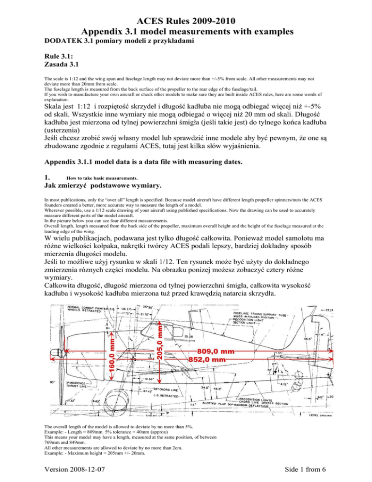ACES Rules 2009-2010 Appendix 3.1 model measurements with examples DODATEK 3.1 pomiary modeli z przykładami Rule 3.1: Zasada 3.1 The scale is 1:12 and the wing span and fuselage length may not deviate more than +/-5% from scale. All other measurements may not deviate more than 20mm from scale. The fuselage length is measured from the back surface of the propeller to the rear edge of the fuselage/tail. If you wish to manufacture your own aircraft or check other models to make sure they are built inside ACES rules, here are some words of explanation. Skala jest 1:12 i rozpiętość skrzydeł i długość kadłuba nie mogą odbiegać więcej niż +-5% od skali. Wszystkie inne wymiary nie mogą odbiegać o więcej niż 20 mm od skali. Długość kadłuba jest mierzona od tylnej powierzchni śmigła (jeśli takie jest) do tylnego końca kadłuba (usterzenia) Jeśłi chcesz zrobić swój własny model lub sprawdzić inne modele aby być pewnym, że one są zbudowane zgodnie z regułami ACES, tutaj jest kilka słów wyjaśnienia. Appendix 3.1.1 model data is a data file with measuring dates. 1. How to take basic measurements. Jak zmierzyć podstawowe wymiary. In most publications, only the “over all” length is specified. Because model aircraft have different length propeller spinners/nuts the ACES founders created a better, more accurate way to measure the length of a model. Wherever possible, use a 1/12 scale drawing of your aircraft using published specifications. Now the drawing can be used to accurately measure different parts of the model aircraft. In the picture below you can see four different measurements. Overall length, length measured from the back side of the propeller, maximum overall height and the height of the fuselage measured at the leading edge of the wing. W wielu publikacjach, podawana jest tylko długość całkowita. Ponieważ model samolotu ma różne wielkości kołpaka, nakrętki twórcy ACES podali lepszy, bardziej dokładny sposób mierzenia długości modelu. Jeśli to możliwe użyj rysunku w skali 1/12. Ten rysunek może być użyty do dokładnego zmierzenia róznych części modelu. Na obrazku ponizej możesz zobaczyć cztery różne wymiary. Całkowita długość, długość mierzona od tylnej powierzchni śmigła, całkowita wysokość kadłuba i wysokość kadłuba mierzona tuż przed krawędzią natarcia skrzydła. The overall length of the model is allowed to deviate by no more than 5%. Example: - Length = 809mm. 5% tolerance = 40mm (approx) This means your model may have a length, measured at the same position, of between 769mm and 849mm. All other measurements are allowed to deviate by no more than 2cm. Example: - Maximum height = 205mm +/- 20mm. Version 2008-12-07 Side 1 from 6 ACES Rules 2009-2010 Appendix 3.1 model measurements with examples This means your model may have a height of between 185mm and 225mm. Długość modelu nie może mieć większej odchyłki od skali niż +/- 5% Przykład Długość =809mm 5%tolerancji = 40 mm (w przyblizeniu) To znaczy długość tego modelu musi zawierać się między (769 a 849 mm) Wszystkie inne wymiary mogą odbiegać o 2cm zatem : Przykład Max. wysokość 205mm czyli wysokość tego modelu musi się zawierać między 225 a 185mm 2. Measuring the width of fuselage: Mierzenie szerokości kadłuba. The 20mm rule applies in all other areas of the model aircraft, including fuselage width, (You should take the widest part of the fuselage as your guide) tail plane span and rudder etc. If you have a good drawing to use, it is easy to draw on two new outlines, one larger than scale and another smaller. Your model aircraft outline should fit in-between these tolerance lines. Be aware that some drawings are inaccurate and you should always check dimensions before building. Example: - Maximum fuselage width = 127mm +/- 20mm. This means your model may have a fuselage width of between 107mm and 147mm. Ta 20mm zasada dotyczy wszystkich innych obszaró modelu włączywszy w to szerokość kadłuba. Powinieneś jako odniesienie traktować najszerszą część kadłuba, rozpiętość statecznika poziomego i steru itd. Jeśłi masz dobry rysunek jest łatwo narysować dwa nowe obrysy, jeden większy od skali drugi mniejszy. Obrys twojego modelu powinien zmieścić się między tymi liniami tolerancji. Bądź ostrożny bo niektóre rysunki są niedokładne i powinieneś zawsze sprawdzić wymiary przed budową. Przykład: max szerokość =127 mm +/- 20 mmm to znaczy ten model musi mieć kadłub o szerokości pomiędzy 107 a 147 mmm 3. Wing dimensions. Wymiary skrzydeł The wing is a little bit more work and a good 1/12 scale drawing will be very helpful to show what you need to build. From 2010 Aces will be using a standard wing measuring method which should help pilots build legal model aircraft suitable for any competition. Here are the steps. Skrzydło dostarcza więcej pracy i dobry rysunek w skali 1:12 może być bardzo pomocny dla pokazania co powinieneś zbudować. Od 2010 ACES chce używać standartowej metody mierzenia skrzydeł, któa powinna pomóc pilotom budować legalne modele włąściwe do startu na każdych zawodach. Tutaj jest kilka kroków. Version 2008-12-07 Side 2 from 6 ACES Rules 2009-2010 Appendix 3.1 model measurements with examples Step 1. Viewed from the front. Widok z przodu. The wing root datum point is positioned at the centre of the wing (root) level with the bottom wing surface. The wing tip datum point is positioned at the wing tip level with the bottom surface. A straight line drawn between these two points will be our datum line from which all measurements are taken. If the original aircraft, drawn in 1/12 scale, had a deviation/crank which leaves the datum line by more than 20mm the model aircraft must be manufactured to look like the original by using a suitable angle change. If we look to a FW 190 fighter, we see only one angle change at the centerline of the wing creating dihedral only. 