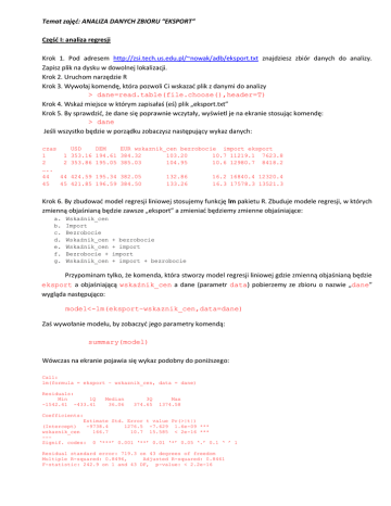 Temat zajęć: ANALIZA DANYCH ZBIORU “EKSPORT” Część I: analiza regresji Krok 1. Pod adresem http://zsi.tech.us.edu.pl/~nowak/adb/eksport.txt znajdziesz zbiór danych do analizy. Zapisz plik na dysku w dowolnej lokalizacji. Krok 2. Uruchom narzędzie R Krok 3. Wywołaj komendę, która pozwoli Ci wskazad plik z danymi do analizy > dane=read.table(file.choose(),header=T) Krok 4. Wskaż miejsce w którym zapisałaś (eś) plik „eksport.txt” Krok 5. By sprawdzid, że dane się poprawnie wczytały, wyświetl je na ekranie stosując komendę: > dane Jeśli wszystko będzie w porządku zobaczysz następujący wykaz danych: czas USD 1 1 353.16 2 2 353.86 ….. 44 44 424.59 45 45 421.85 DEM EUR wskaznik_cen bezrobocie import eksport 194.61 384.32 103.20 10.7 11219.1 7623.8 195.05 385.03 104.95 10.6 12980.7 8418.2 195.34 382.05 196.59 384.50 132.86 133.26 16.2 16840.4 12320.4 16.3 17578.3 13521.3 Krok 6. By zbudowad model regresji liniowej stosujemy funkcję lm pakietu R. Zbuduje modele regresji, w których zmienną objaśnianą będzie zawsze „eksport” a zmieniad będziemy zmienne objaśniające: a. b. c. d. e. f. g. Wskaźnik_cen Import Bezrobocie Wskaźnik_cen Wskaźnik_cen Bezrobocie + Wskaźnik_cen + bezrobocie + import import + import + bezrobocie Przypominam tylko, że komenda, która stworzy model regresji liniowej gdzie zmienną objaśnianą będzie eksport a objaśniającą wskaźnik_cen a dane (parametr data) pobierzemy ze zbioru o nazwie „dane” wygląda następująco: model<-lm(eksport~wskaznik_cen,data=dane) Zaś wywołanie modelu, by zobaczyd jego parametry komendą: summary(model) Wówczas na ekranie pojawia się wykaz podobny do poniższego: Call: lm(formula = eksport ~ wskaznik_cen, data = dane) Residuals: Min 1Q -1542.41 -433.41 Median 36.06 3Q 374.65 Max 1374.58 Coefficients: Estimate Std. Error t value Pr(>|t|) (Intercept) -9738.4 1276.5 -7.629 1.6e-09 *** wskaznik_cen 166.7 10.7 15.585 < 2e-16 *** --Signif. codes: 0 ‘***’ 0.001 ‘**’ 0.01 ‘*’ 0.05 ‘.’ 0.1 ‘ ’ 1 Residual standard error: 719.3 on 43 degrees of freedom Multiple R-squared: 0.8496, Adjusted R-squared: 0.8461 F-statistic: 242.9 on 1 and 43 DF, p-value: < 2.2e-16 Krok 7. Zbadajmy, czy modele przez nas zbudowane cechują się współliniowością. Przypominam, że funkcja vif dostępna jest przy użyciu biblioteki car, a więc najpierw należy załadowad ową bibliotekę za pomocą komendy: > library(car) Krok 7a. VIF dla modelu, w którym zmienne objaśniające są 3: import, bezrobocie oraz wskaznik_cen wywołamy następująco: > vif(lm(eksport~import+wskaznik_cen+bezrobocie,data=dane)) Pamiętajmy, że jeśli VIF dla jakiejś zmiennej wynosi więcej niż 10 to dopiero wówczas mówimy o współliniowośd, która może wpływad na równanie regresji i zaburzad wyniki predykcji. Zadanie: Sprawdź, który z modeli (o ile w ogóle) wprowadza współliniowośd. Krok 8. Zbadajmy działanie naszego zbudowanego modelu regresji, np. tego w którym eksport przewidywaliśmy na podstawie wartości wskaźnika bezrobocia. Sprawdź jaka będzie przewidywana wartośd eksportu, gdy wartośd bezrobocia wyniesie 10.70 przy 90 a potem 95% poziomu ufności. W oryginalnym zbiorze wartości istnieje wartośd 10.70 dla bezrobocia. Porównaj wartości: rzeczywistą i przewidywaną przez model. Czy jest różnica, i czy jest ona duża czy niewielka ? Sprawdź też wartośd przewidywaną eksportu np. gdy bezrobocie wyniesie 10. Przypominam, że komenda wywołania funkcji PREDICT w pakiecie R wygląda następująco: > predict(model,data.frame(bezrobocie=10.70), level = 0.9, interval = "confidence") Krok 9. Analiza danych (predykcja) w narzędziu Rattle. Uruchom R i załaduj bibliotekę Rattle wprowadzając komendy: > library(rattle) > rattle() Krok 10. Kiedy już narzędzie się uruchomi (jeśli nie poproś o pomoc – pomogę), wczytaj zbiór eksport.txt odpowiednio ustawiając zmienne: objaśniane i objaśniające, pomijając również te nieistotne w analizie. Kliknij przycisk „Wykonaj”, jak na rysunku poniżej (użyj tylko zmiennych wskaźnik_cen, import, bezrobocie – w rożnych konfiguracjach jako objaśniające, a resztę ignoruj). Krok 11: Przejdź do zakładki “predictive” i wybierz odpowiednie opcje jak na rysunku poniżej: Krok 12: Odczytaj z okna programu odpowiednie dane dotyczące zbudowanego modelu regresji: Równanie regresji oraz współczynnik determinacji. Krok 13: Przy okazji porównaj czy równanie regresji w R i Rattle dla danego modelu są identyczne. Krok 14: Znając wartośd współczynnika determinacji R2 dla każdego modelu, wybierz model najlepiej opisujący eksport. Który to model ? Część II: Drzewa decyzyjne w Rattle Zakładając, że wciąż masz załadowany zbiór eksport.txt przejdź do zakładki Model albo predictive (w zależności od wersji narzędzia Rattle) i wybierz odpowiednią opcję jak na rysunku poniżej: Pojawi się podmenu do pokazania drzewa: Zobacz zatem jak zbuduje się drzewo dla wybranego przez Ciebie modelu. Jak zapiszesz (odczytasz) reguły stworzone przez to drzewo ? Jak klasyfikuje eksport drzewo a jak klasyfikował zbudowany model regresji ? Tree as rules: Rule number: 7 [yval=12232.8071428571 cover=14 (31%)] import>=1.561e+04 wskaznik_cen>=126.6 Rule number: 5 [yval=8609.34166666667 cover=12 (27%)] import< 1.561e+04 import>=1.347e+04 Rule number: 6 [yval=10618.6818181818 cover=11 (24%)] import>=1.561e+04 wskaznik_cen< 126.6 Rule number: 4 [yval=7809.125 cover=8 (18%)] import< 1.561e+04 import< 1.347e+04 Część III: Drzewa decyzyjne w Traceis 1. Pod linkiem http://zsi.tech.us.edu.pl/~nowak/adb/Traceis.zip jest darmowe narzędzie do analizy danych. Sciągnij plik programu (ale najpierw sprawdź, bo byd może jest już zainstalowany w pracowni). Uruchom narzędzie. 2. Wczytaj zbiór „eksport.txt” 3. W menu z lewej strony przejdź do części „implementation” i wybierz „Grouping”. 4. Przejdź do zakładki „Decision Trees”