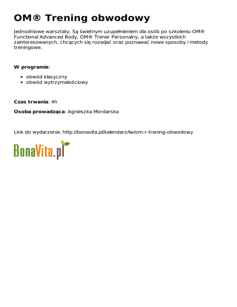 OM® Trening obwodowy Jednodniowe warsztaty. Są świetnym uzupełnieniem dla osób po szkoleniu OM® Functional Advanced Body, OM® Trener Personalny, a także wszystkich zainteresowanych, chcących się rozwijać oraz poznawać nowe sposoby i metody treningowe. W programie: obwód klasyczny obwód wytrzymałościowy Czas trwania: 4h Osoba prowadząca: Agnieszka Mordarska Link do wydarzenia: http://bonavita.pl/kalendarz/lw/om-r-trening-obwodowy