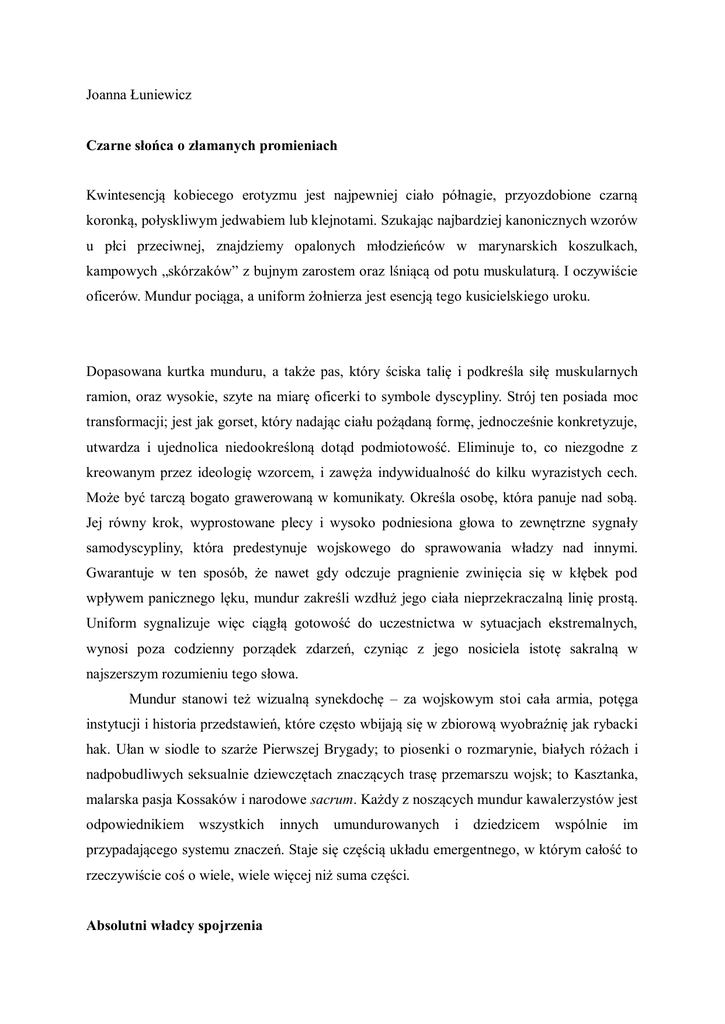 Joanna Łuniewicz Czarne słońca o złamanych promieniach Kwintesencją kobiecego erotyzmu jest najpewniej ciało półnagie, przyozdobione czarną koronką, połyskliwym jedwabiem lub klejnotami. Szukając najbardziej kanonicznych wzorów u płci przeciwnej, znajdziemy opalonych młodzieńców w marynarskich koszulkach, kampowych „skórzaków” z bujnym zarostem oraz lśniącą od potu muskulaturą. I oczywiście oficerów. Mundur pociąga, a uniform żołnierza jest esencją tego kusicielskiego uroku. Dopasowana kurtka munduru, a także pas, który ściska talię i podkreśla siłę muskularnych ramion, oraz wysokie, szyte na miarę oficerki to symbole dyscypliny. Strój ten posiada moc transformacji; jest jak gorset, który nadając ciału pożądaną formę, jednocześnie konkretyzuje, utwardza i ujednolica niedookreśloną dotąd podmiotowość. Eliminuje to, co niezgodne z kreowanym przez ideologię wzorcem, i zawęża indywidualność do kilku wyrazistych cech. Może być tarczą bogato grawerowaną w komunikaty. Określa osobę, która panuje nad sobą. Jej równy krok, wyprostowane plecy i wysoko podniesiona głowa to zewnętrzne sygnały samodyscypliny, która predestynuje wojskowego do sprawowania władzy nad innymi. Gwarantuje w ten sposób, że nawet gdy odczuje pragnienie zwinięcia się w kłębek pod wpływem panicznego lęku, mundur zakreśli wzdłuż jego ciała nieprzekraczalną linię prostą. Uniform sygnalizuje więc ciągłą gotowość do uczestnictwa w sytuacjach ekstremalnych, wynosi poza codzienny porządek zdarzeń, czyniąc z jego nosiciela istotę sakralną w najszerszym rozumieniu tego słowa. Mundur stanowi też wizualną synekdochę – za wojskowym stoi cała armia, potęga instytucji i historia przedstawień, które często wbijają się w zbiorową wyobraźnię jak rybacki hak. Ułan w siodle to szarże Pierwszej Brygady; to piosenki o rozmarynie, białych różach i nadpobudliwych seksualnie dziewczętach znaczących trasę przemarszu wojsk; to Kasztanka, malarska pasja Kossaków i narodowe sacrum. Każdy z noszących mundur kawalerzystów jest odpowiednikiem wszystkich innych umundurowanych i dziedzicem wspólnie im przypadającego systemu znaczeń. Staje się częścią układu emergentnego, w którym całość to rzeczywiście coś o wiele, wiele więcej niż suma części. Absolutni władcy spojrzenia Mimo barwnych mundurów minionych epok, które do I wojny światowej pełniły przede wszystkim funkcje prestiżowe, przez setki lat nic nie dorównywało strategii husarzy – trudno znaleźć bardziej efektowne artefakty niż pióra drapieżnych ptaków uskrzydlające męską sylwetkę, skóry dzikich kotów przerzucone przez ramię i „designerskie” szyszaki. Dopiero talent słynnego niemieckiego projektanta Hugo Bossa, oddany w służbę III Rzeszy, zaowocował umundurowaniem, które podsumowuje nazwa jednej z kontrowersyjnych stron na Facebooku: „Naziści byli źli, ale dobrze się ubierali”. Naprawdę dobrze. Pozostaną zwycięzcami na płaszczyźnie estetycznej – legitymizują ich nie tylko świetnie skrojone uniformy, ale też neogotyckie zamczyska, wykwintne meble, Mozart, Beethoven, Goethe i czarnoksiężnik Wagner z całym arsenałem kuglarskich sztuczek. Wesoła gromadka poszukujących Świętego Graala nazistów znanych z filmu Indiana Jones i ostatnia krucjata (1989, S. Spielberg) oraz przedstawiony w subtelnych emocjach rycerzesteta, który u Romana Polańskiego ratuje życie umierającemu z głodu pianiście – obaj niczym się nie różnią. Niewyczerpanym źródłem wstrząsów estetycznych są mundury żołnierzy Armii Czerwonej: walonki, filcowe szynele, koszule o kroju dokumentującym sojusz robotniczochłopski, ściągnięte „oszczędnościowym” paskiem (z przewagą elementów parcianych). Nawet jednak galowy mundur majora Johna Reismana (Parszywa dwunastka [1967, R. Aldrich]) nie dotrzyma pola szykowi nazisty. Jak z tą nieskazitelną sylwetką mogą konkurować brązowe i szorstkie wełny noszone przez aliantów, charakterystyczne dla nich kolory piasku i więdnących liści oraz koszule z krawatem tylko o ton ciemniejszym? Mundur amerykański lub angielski sugeruje, że wojna to epizod przejściowy, niepożądany – tak wyraźne jest jego podobieństwo do ubrania zwykłego urzędnika. Mundur niemiecki zdaje się symbolizować granicę, która została przekroczona – pod połyskującymi galonami ze srebrnego sznurka i stylizowanymi liśćmi na patkach skrywa się nie przerażony młody ojciec rodziny, ale nazista, który nie mógł już powrócić do strefy profanum, bo doznał duchowej mutacji skazującej go na wojnę totalną. Mundur żołnierza Wehrmachtu, Gestapo i SS dorobił się nawet konkretnej poetyki przedstawiania, parodiowanej często w kinie przygodowym lub filmach klasy B – zbliżenie na detal, jakim jest znak trupiej czaszki zdobiący czapkę oficera, powolny ruch kamery prześlizgującej się po kurtkach mundurowych i eksponujący połyskujące odznaczenia (przede wszystkim Krzyż Żelazny), ujęcia z lotu ptaka w przepastnych pałacowych salach, gdzie czerń munduru wyraźnie kontrastuje z subtelnymi odcieniami beżu i złota dominującymi w wystroju. Często sposób ukazywania nazistowskich dowódców przypomina poetykę obrazowania kobiecego powabu w kinie klasycznym. Bywał źródłem parodii i ironii – jak w żarcie operatorskim z filmu Lili Marleen (1981, R.W. Fassbinder). Para głównych bohaterów podczas działalności konspiracyjnej zostaje skonfrontowana z pojawiającą się w pokoju postacią w czarnym mundurze, oboje nieruchomieją przestraszeni. Perwersyjnie wolny ruch kamery ukazuje czarne spodnie, kurtkę ze srebrnymi zdobieniami i ornamenty klamry w pasie, charakterystyczną przepaskę ze swastyką, ale ujęcie kończy się ukazaniem twarzy młodziutkiego chłopca, który jakby chciał zapewnić, że mundur to tylko karnawałowe przebranie, które wcale nie zrasta się 