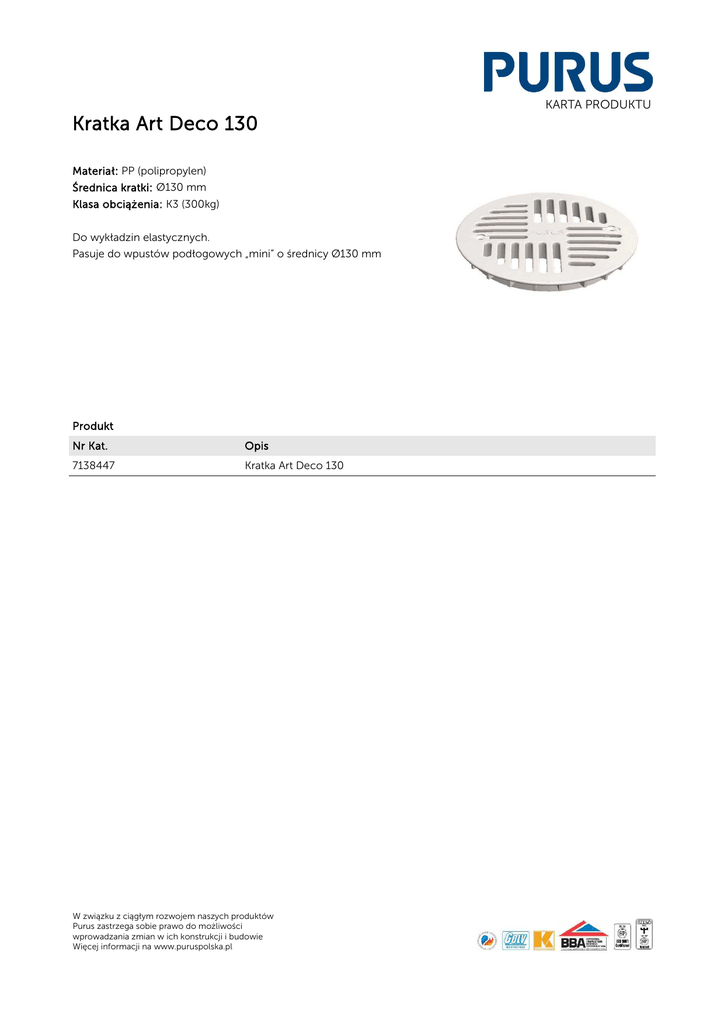 KARTA PRODUKTU Kratka Art Deco 130 Materiał: PP (polipropylen) Średnica kratki: Ø130 mm Klasa obciążenia: K3 (300kg) Do wykładzin elastycznych. Pasuje do wpustów podłogowych „mini” o średnicy Ø130 mm Produkt Nr Kat. Opis 7138447 Kratka Art Deco 130 W związku z ciągłym rozwojem naszych produktów Purus zastrzega sobie prawo do możliwości wprowadzania zmian w ich konstrukcji i budowie Więcej informacji na www.puruspolska.pl